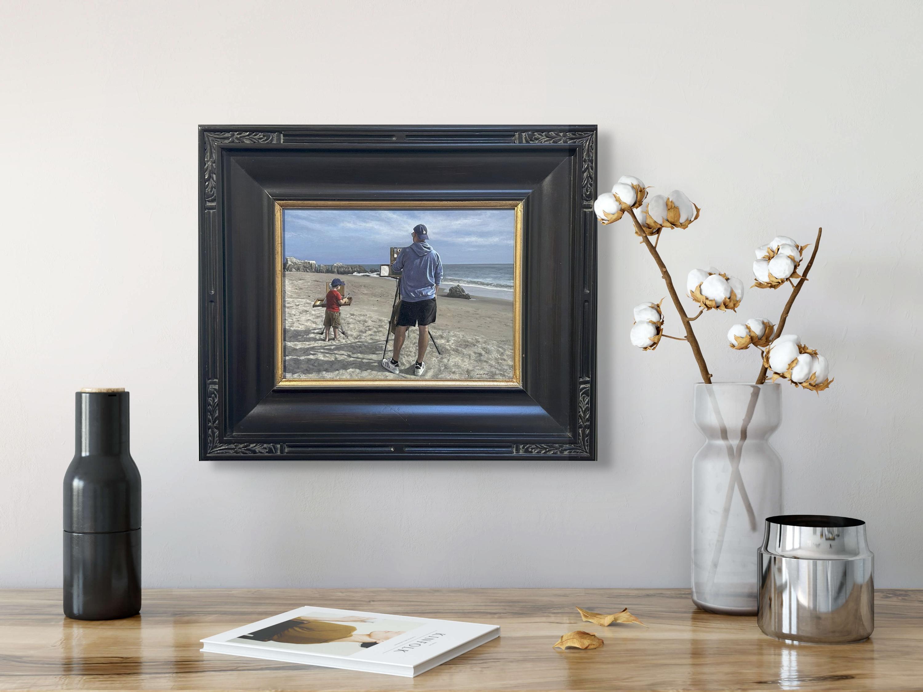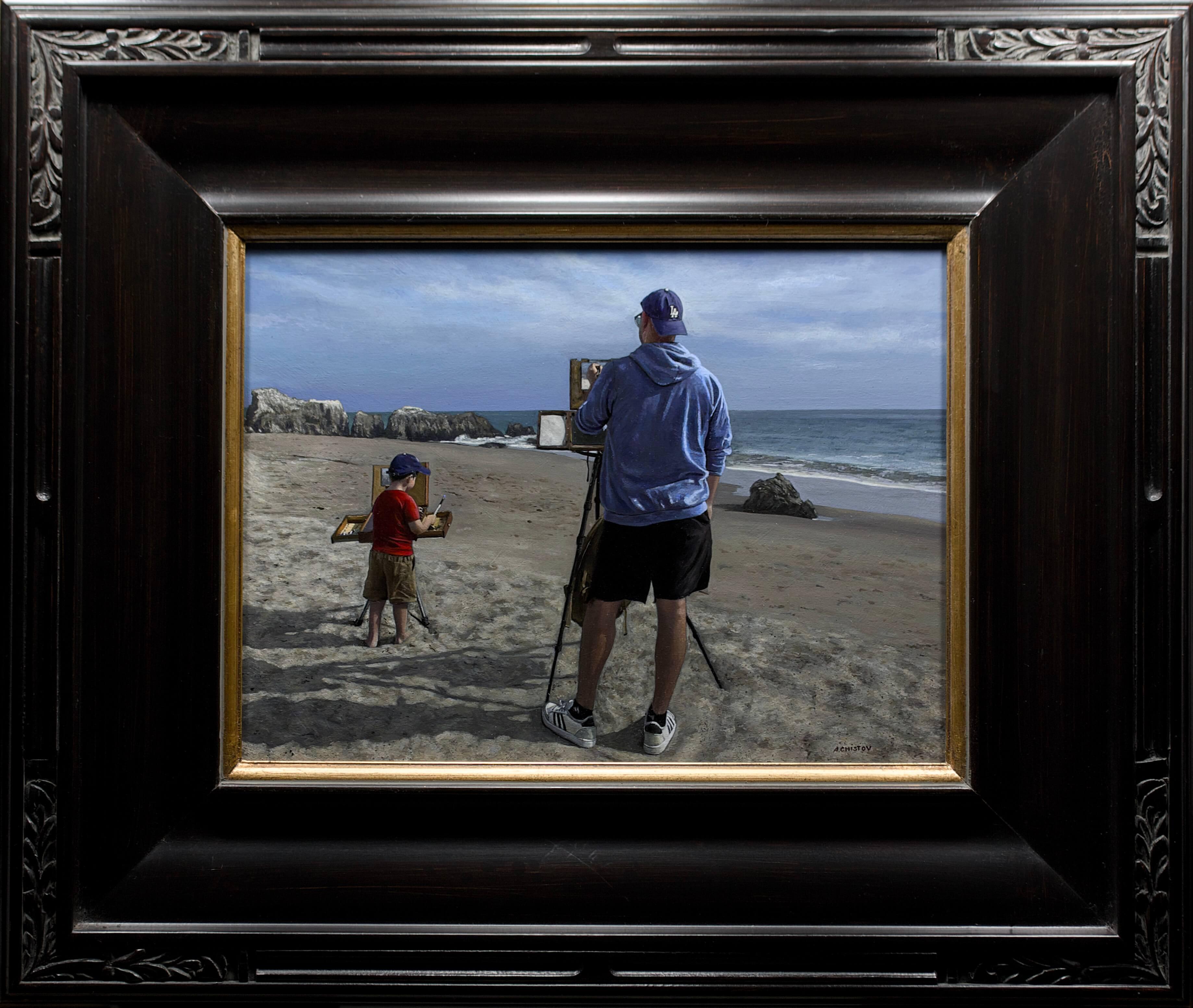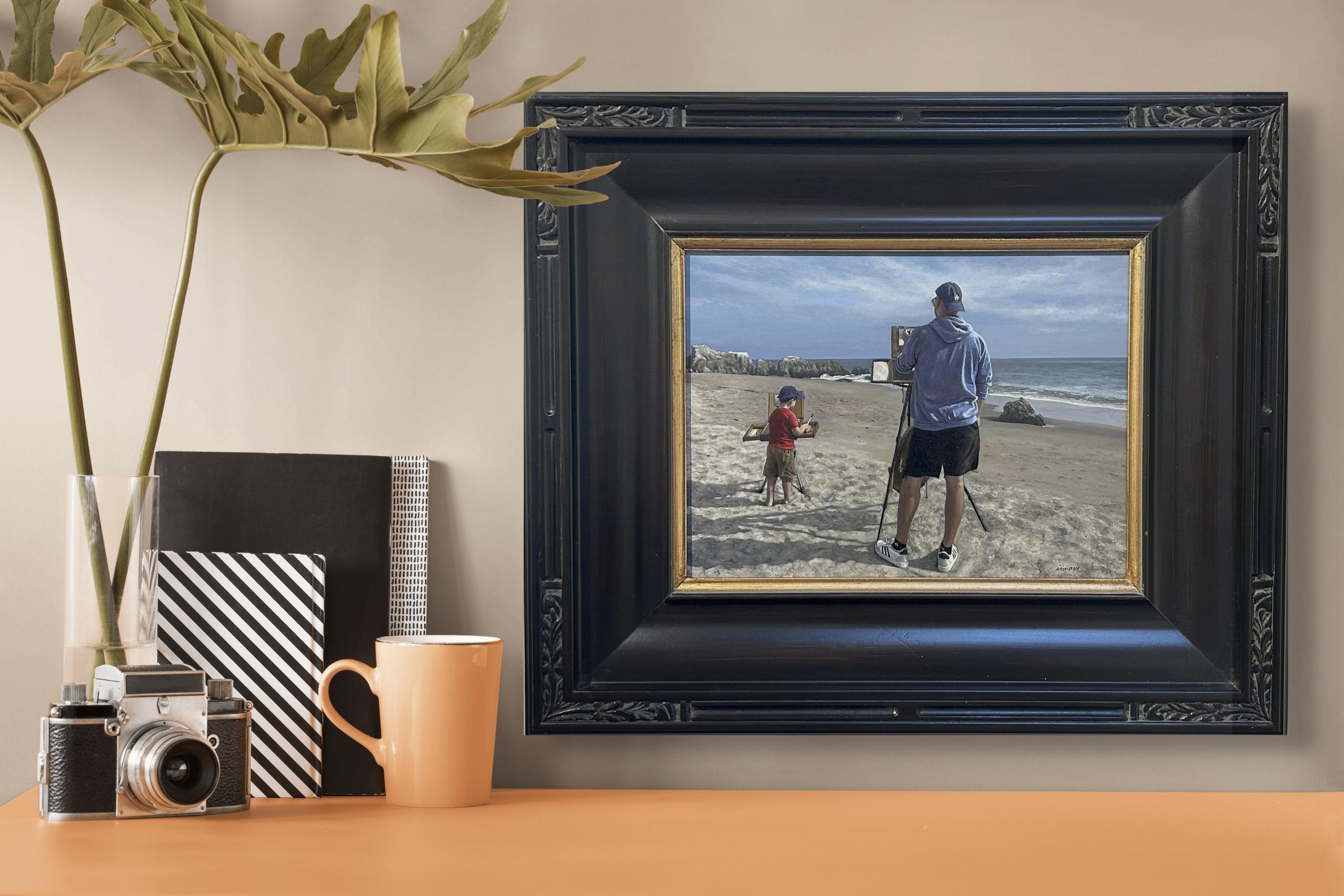 Side by Side" d'Alexander Chistov est une peinture originale, faite à la main, à l'acrylique sur panneau ACM, représentant l'artiste en train de peindre aux côtés de son fils.