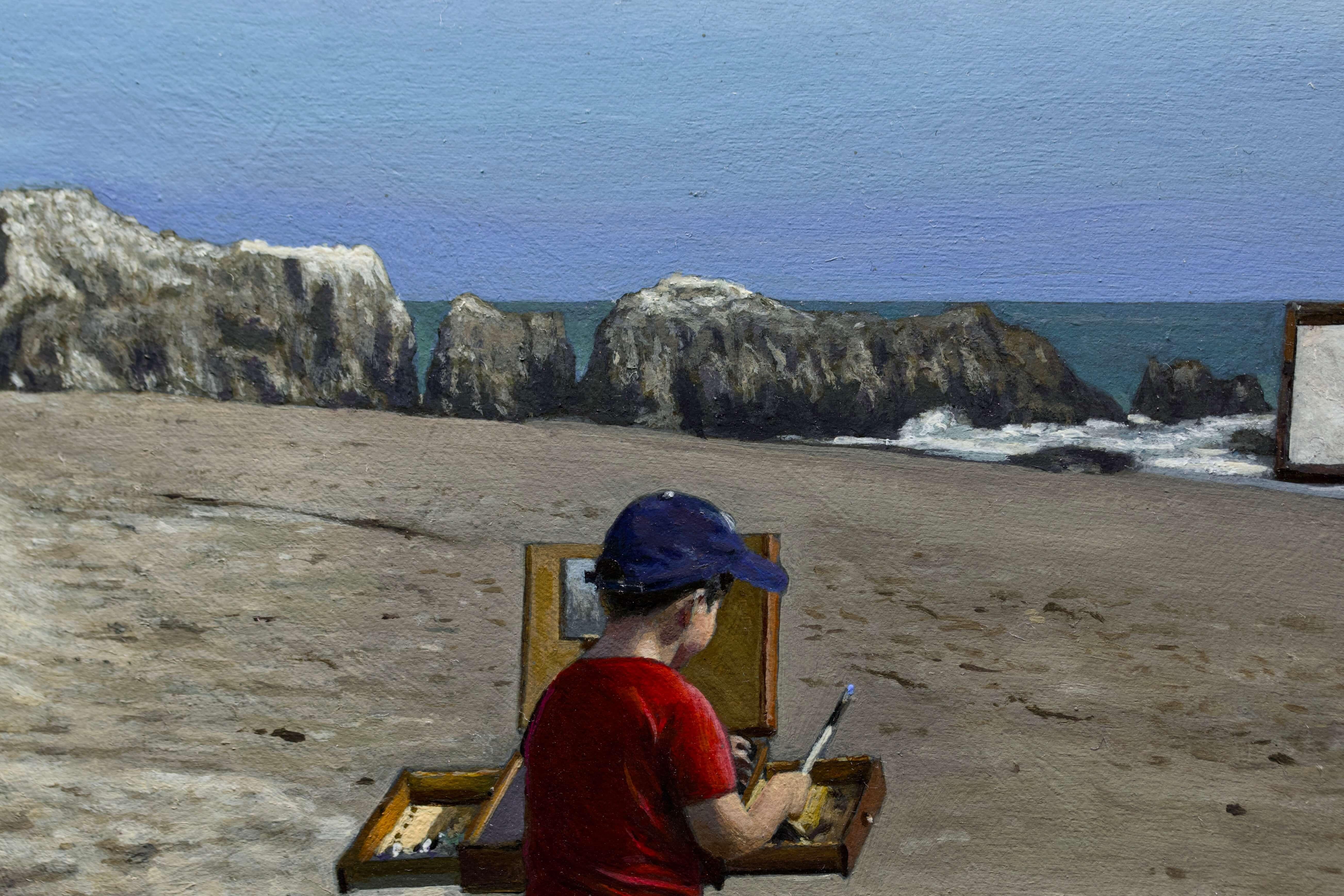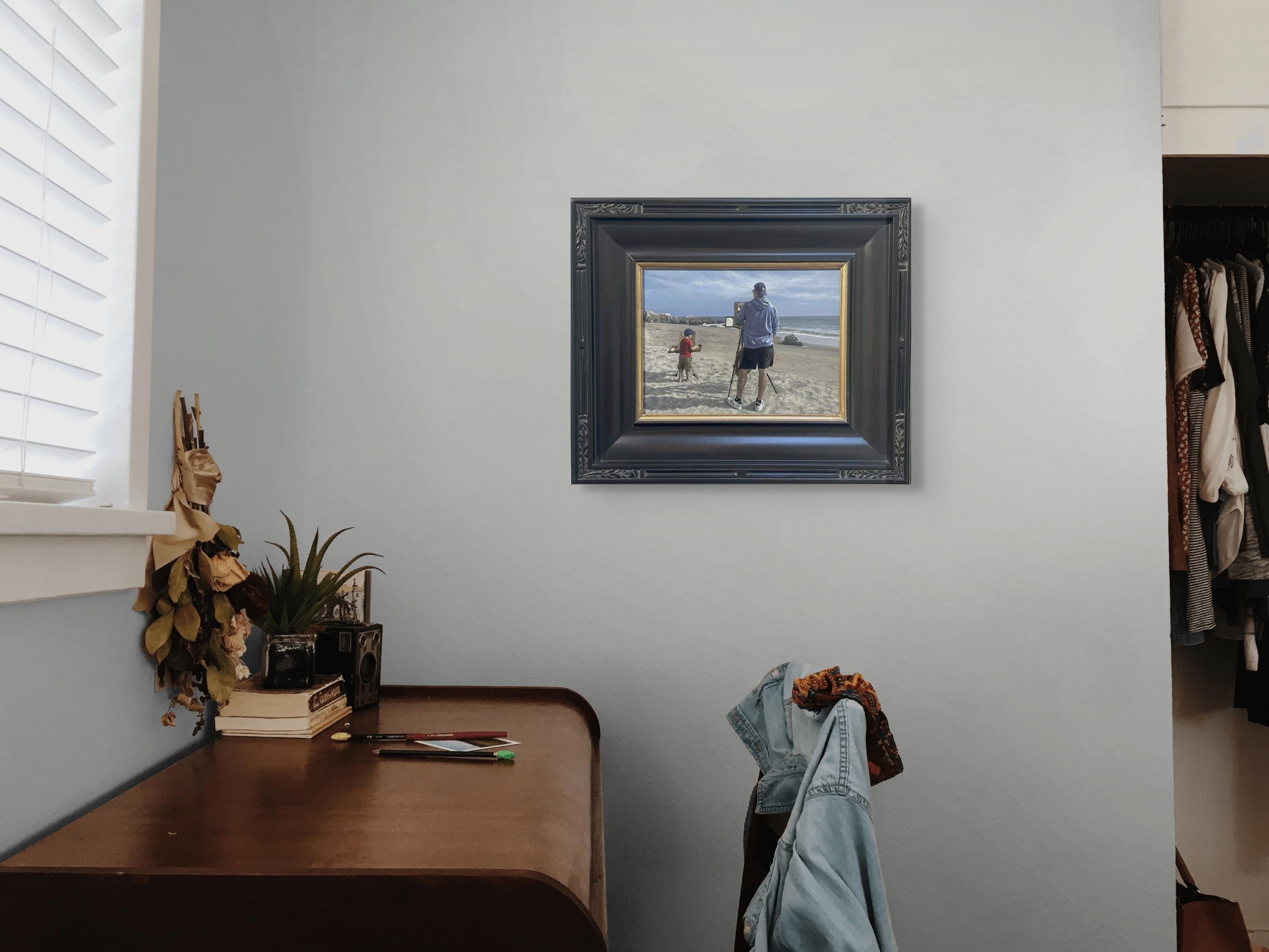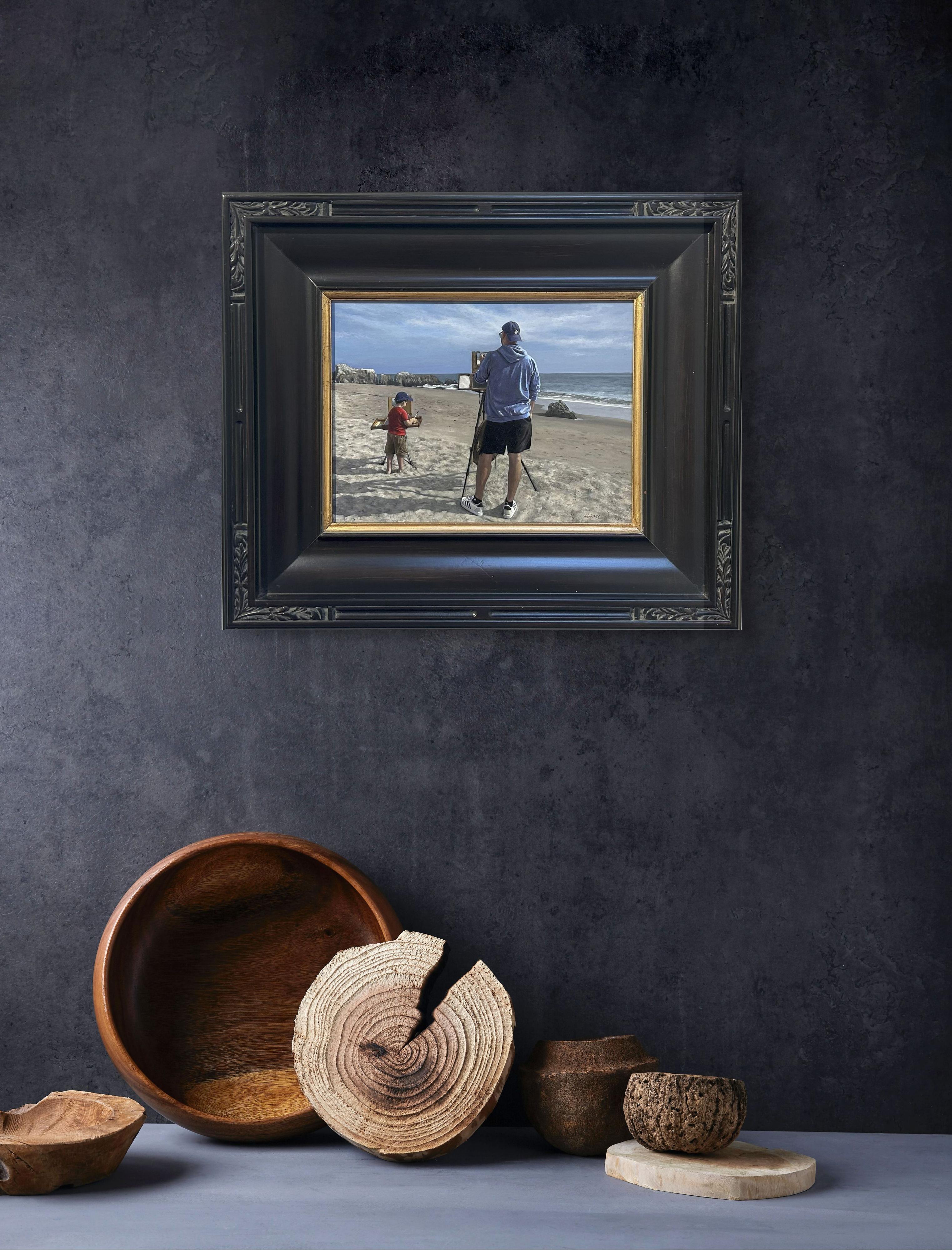 Side by Side" d'Alexander Chistov est une peinture originale, faite à la main, à l'acrylique sur panneau ACM, représentant l'artiste en train de peindre aux côtés de son fils.