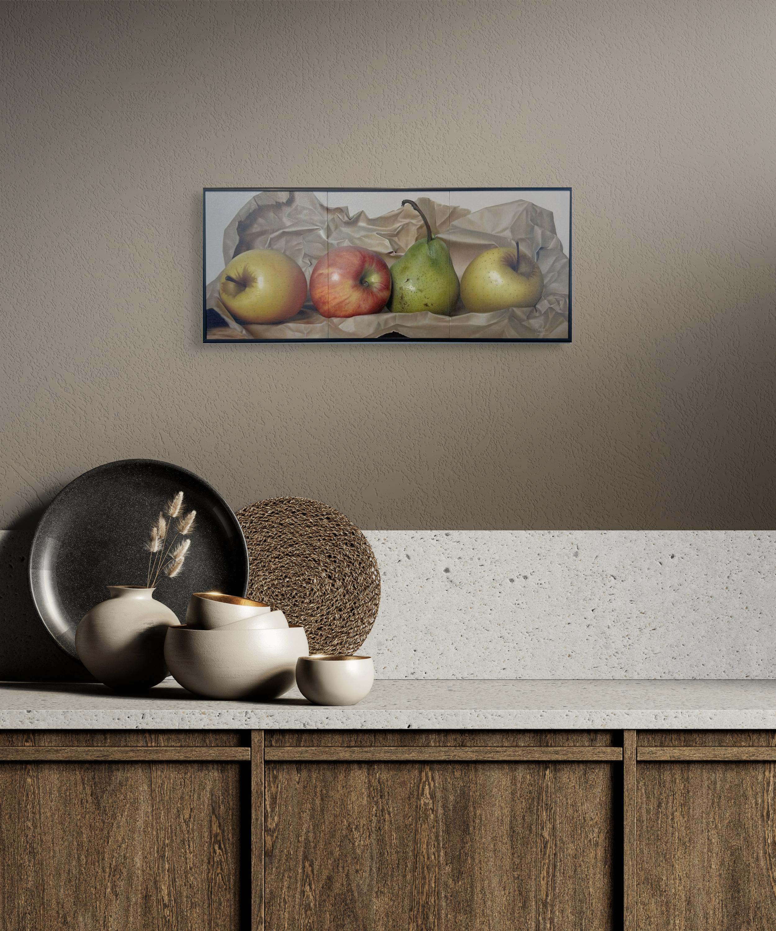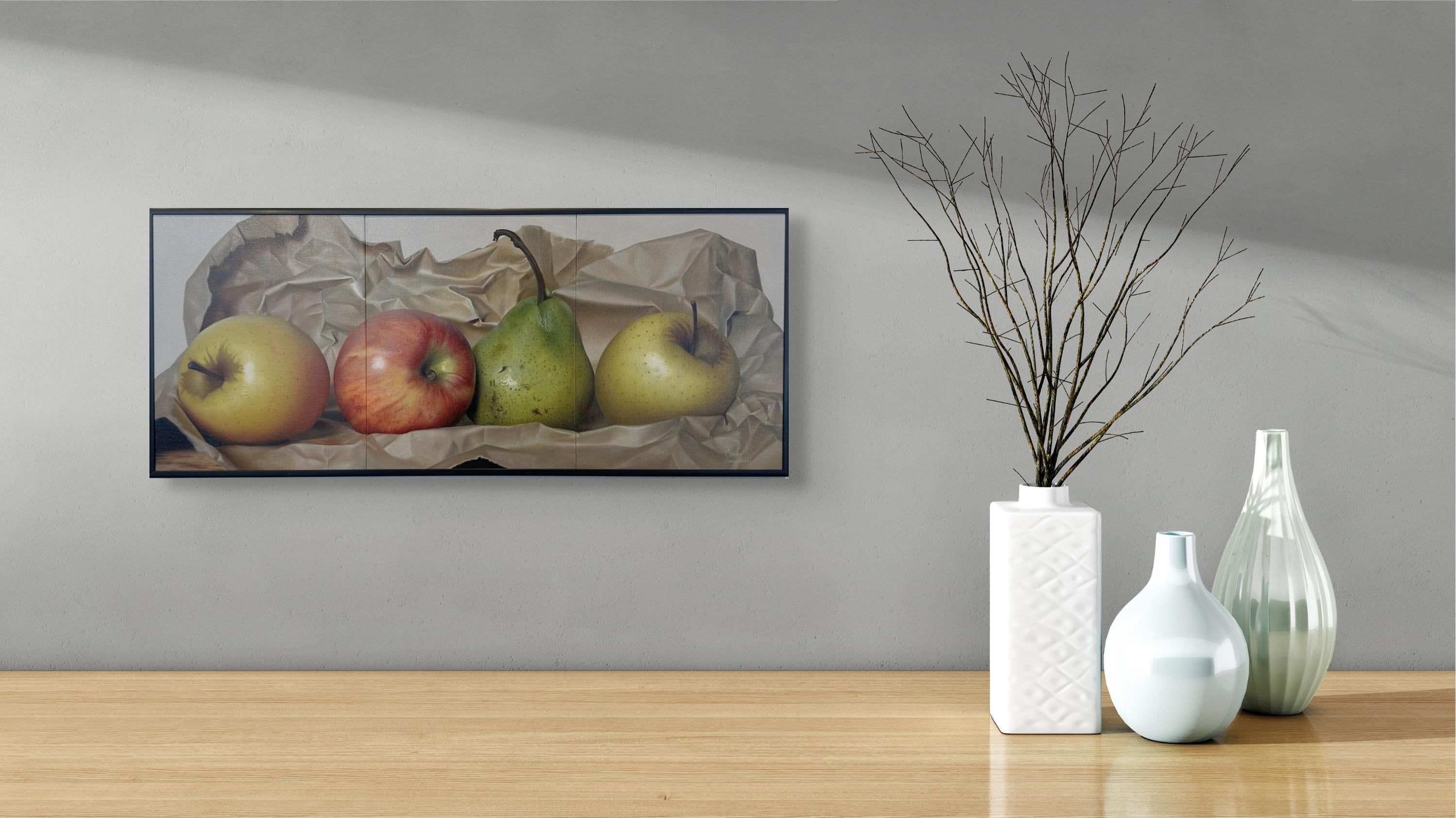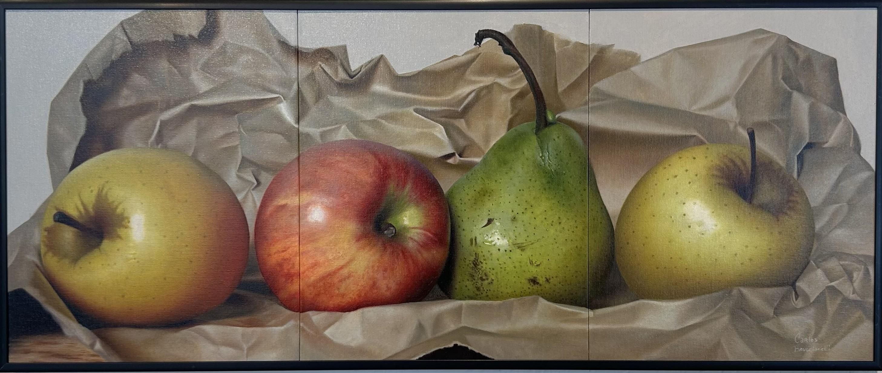 Fruits sur papier" de Carlos Bruscianelli est une peinture à l'huile originale faite à la main sur panneau de toile qui mesure 10,25 x 24,25 pouces, encadrée et prête à être accrochée.