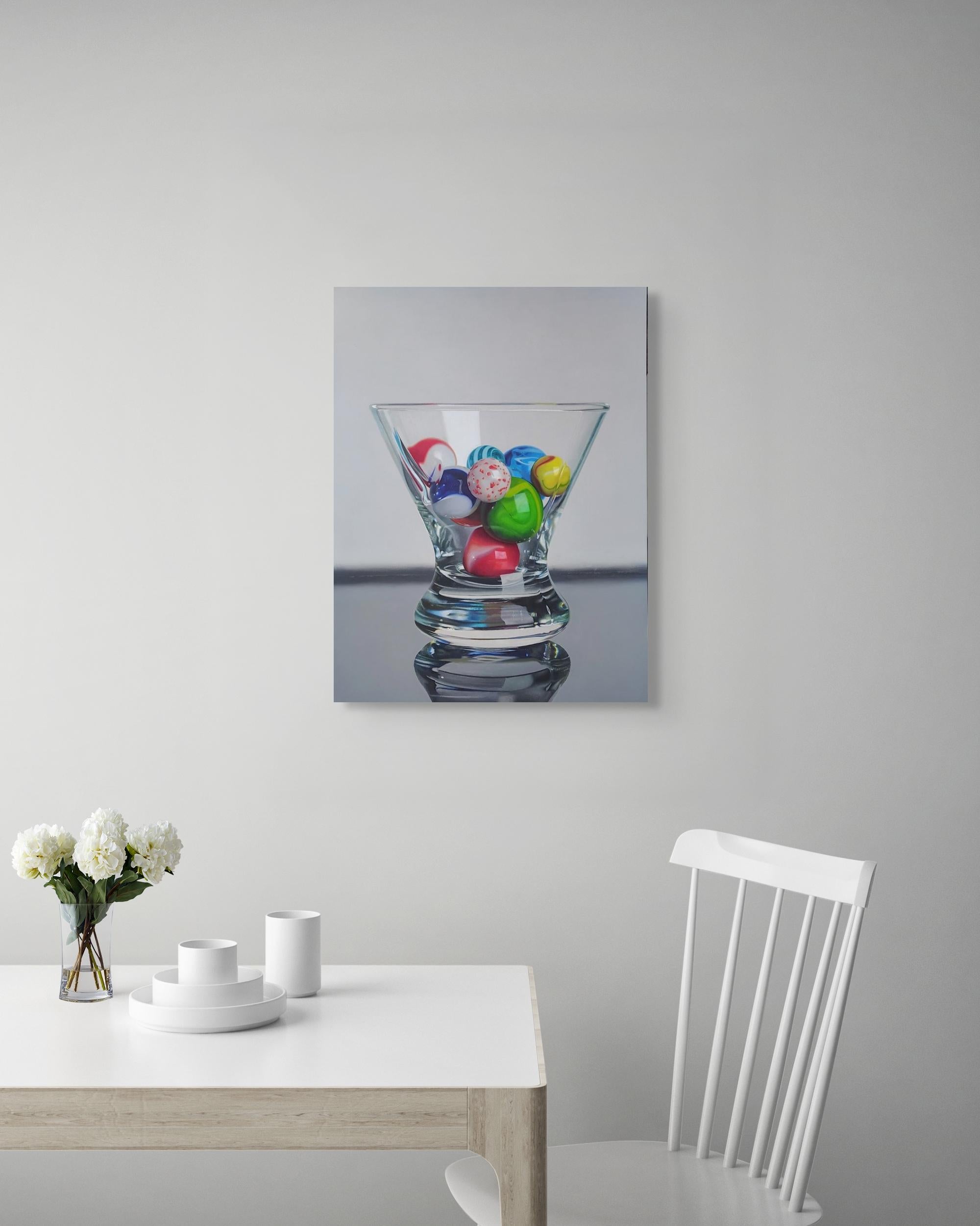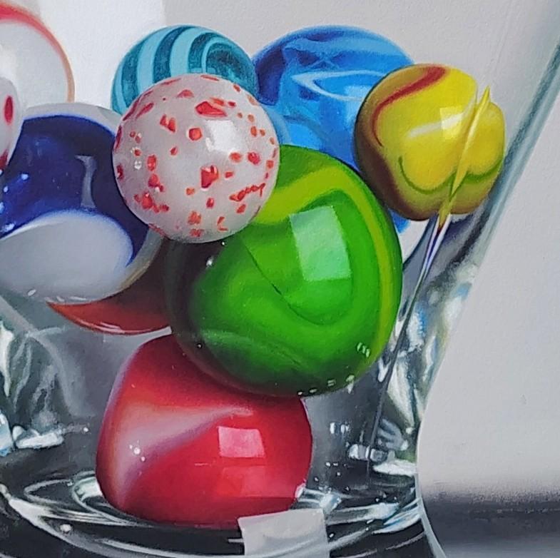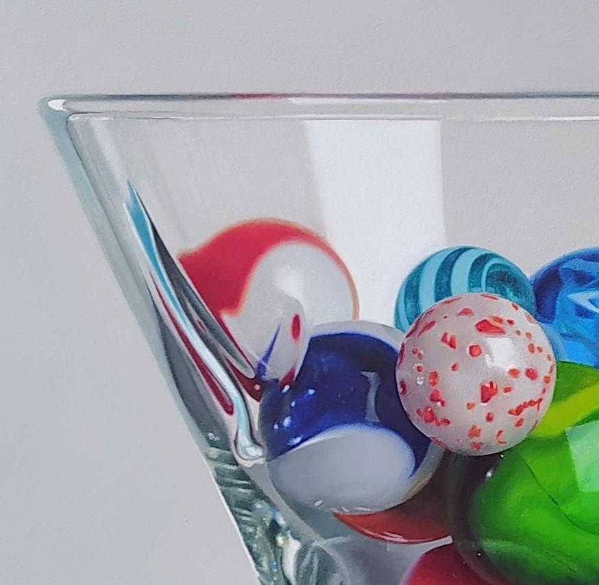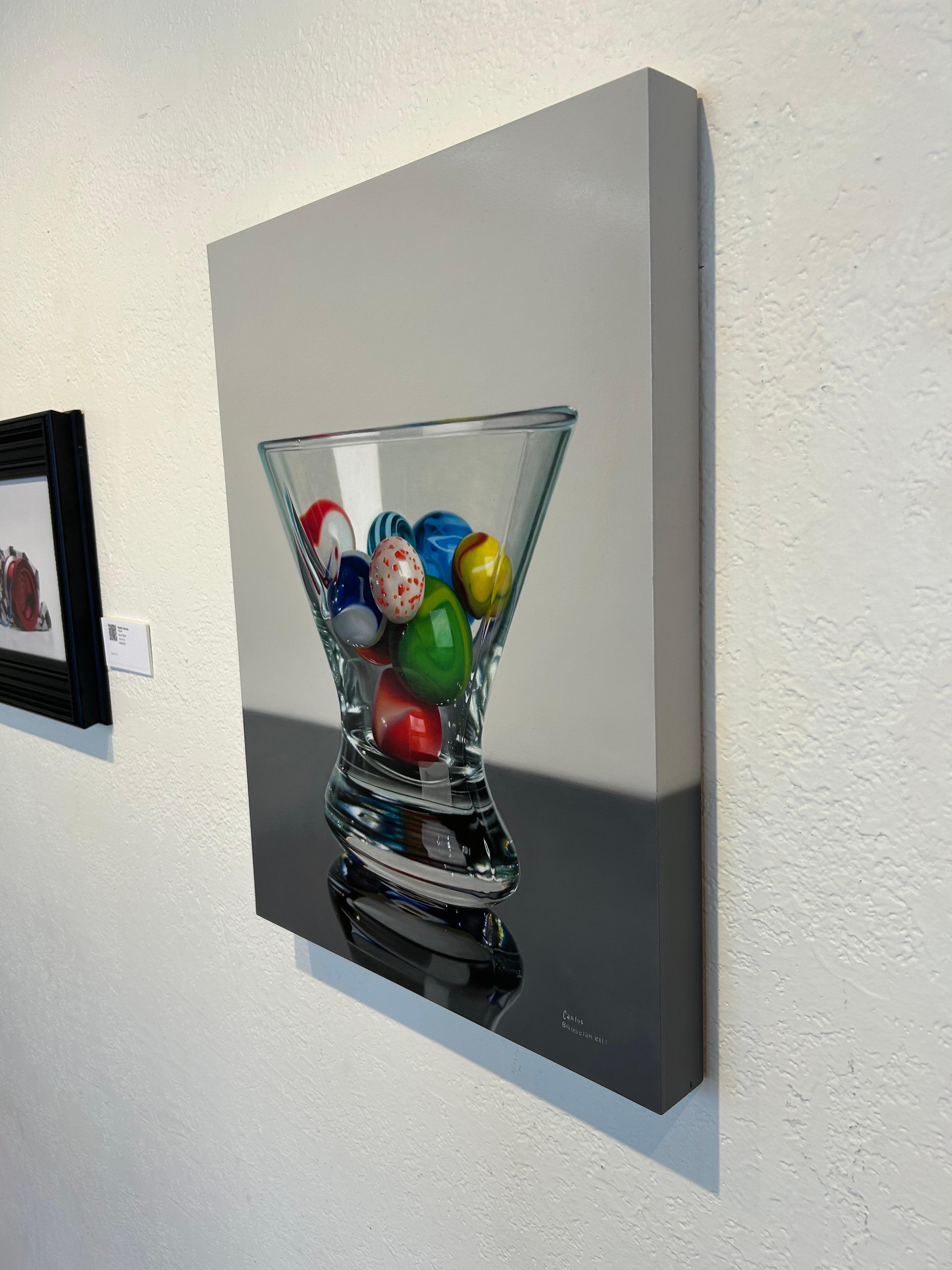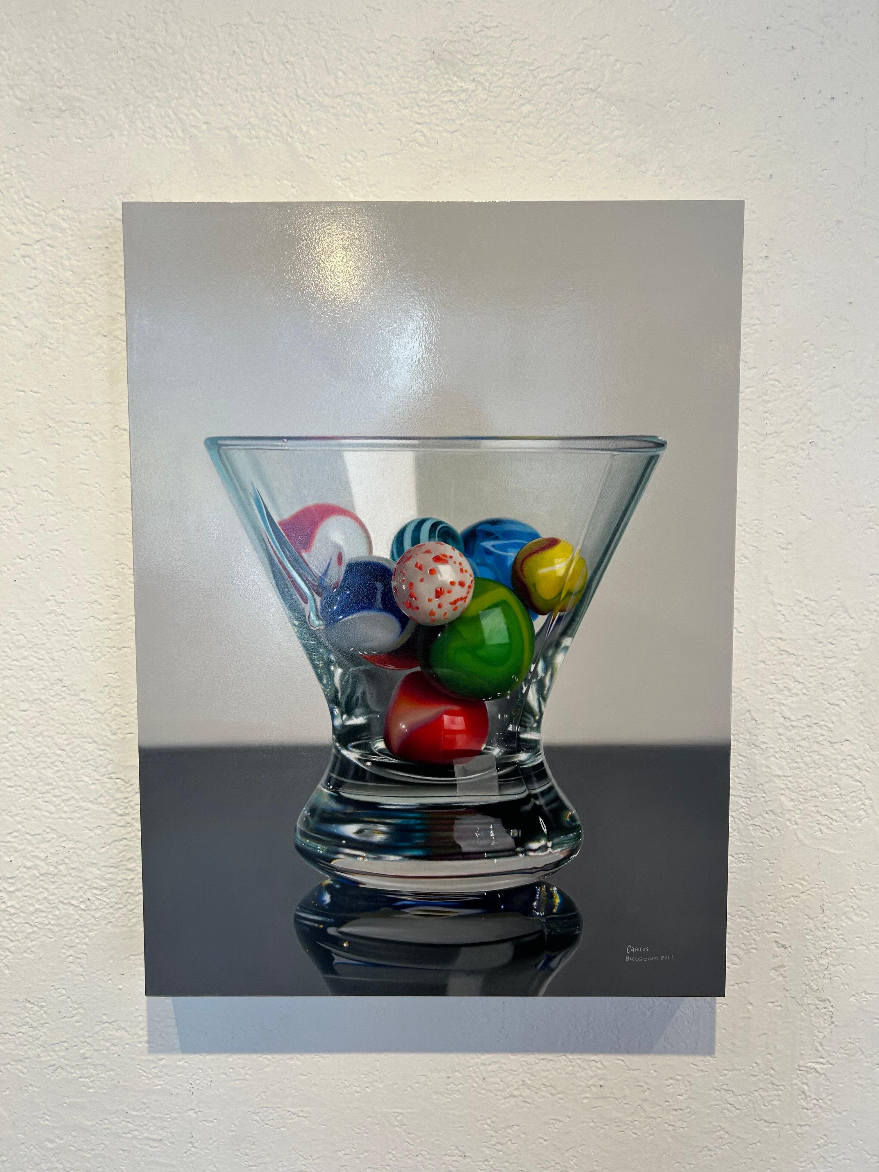 L'œuvre de Carlos Bruscianelli "Marbre dans un verre de Martini" est une peinture à l'huile originale sur panneau, réalisée à la main, qui mesure 24 x 18 pouces sans cadre et qui est prête à être accrochée.
