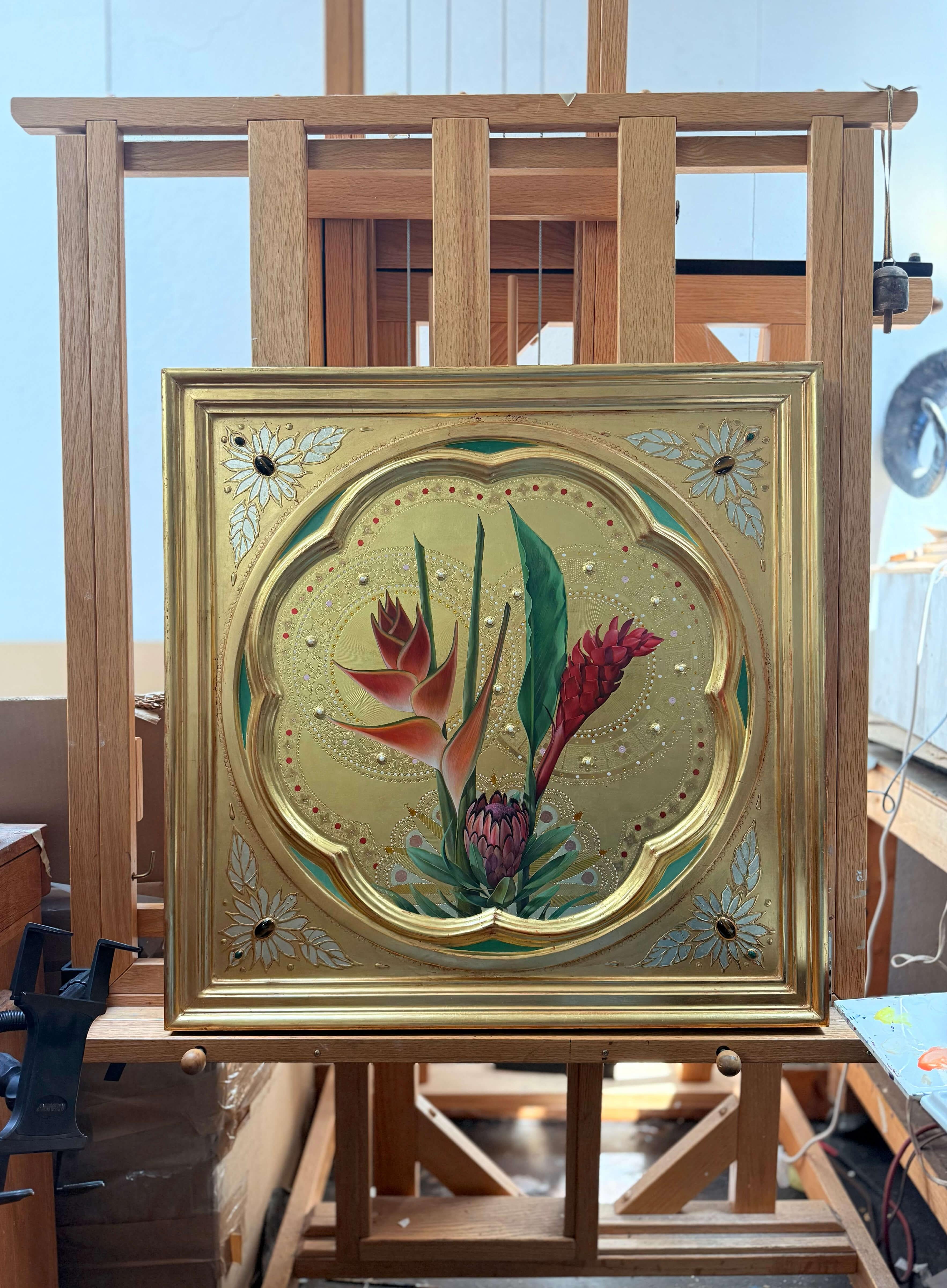 « West Hartford Canna » (2022) par Fred Wessel, peinture Tempera œuf sur feuille d'or