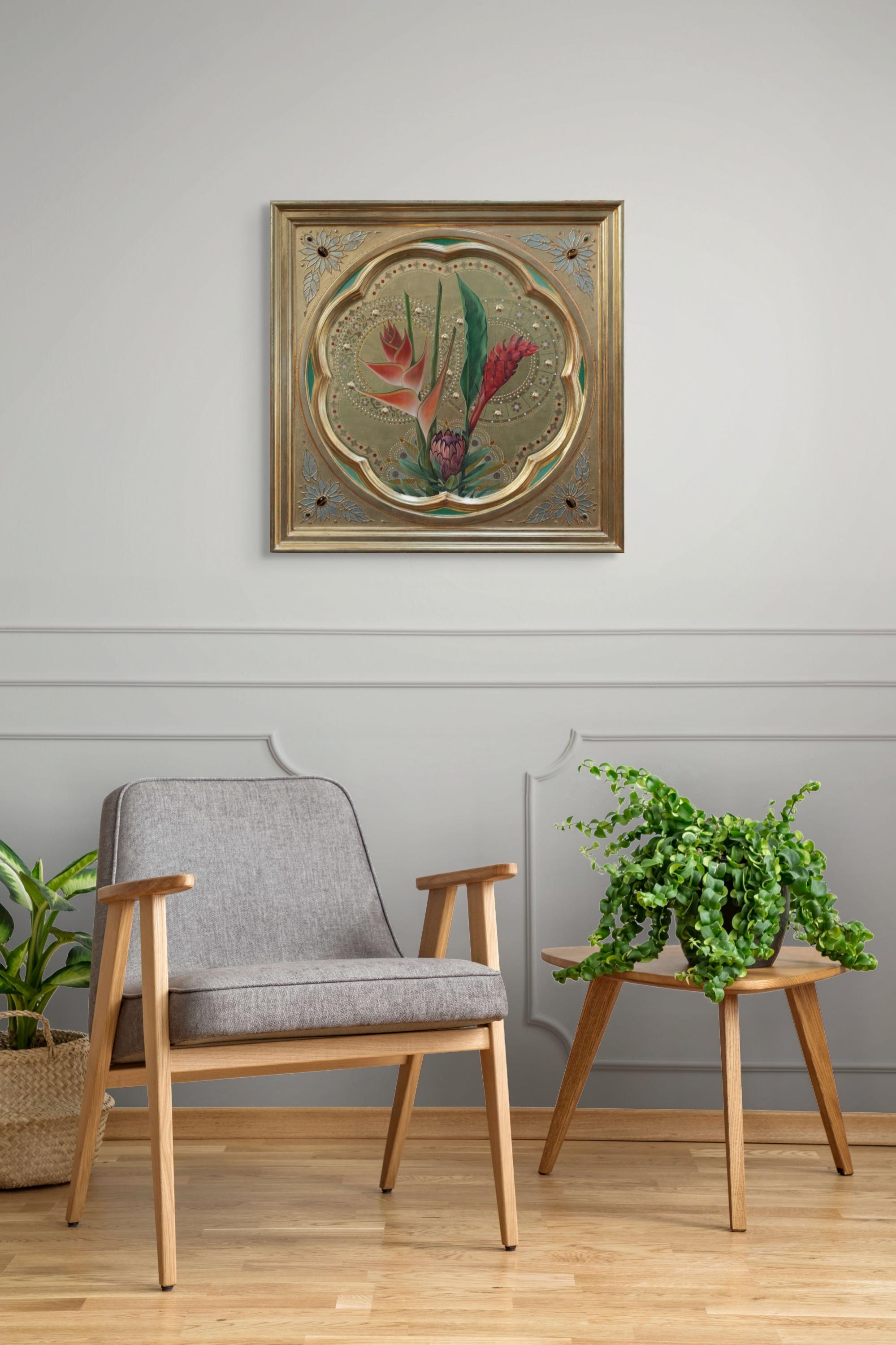 Fred Wessel's "Sienese Icon (Tropical Trinity)" is an egg tempera painting with gold leaf, cultured pearls and tiger eye gems on a panel. This piece measures 28 x 28 inches and is ready to hang.