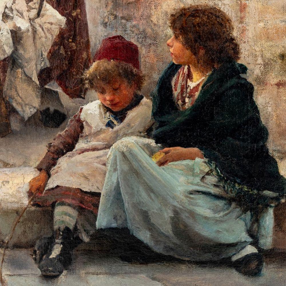 École italienne, " Bobinage de la laine ", huile sur toile, XIXe siècle, représentant deux jeunes femmes bobinant de la laine avec un paysage méditerranéen à l'arrière-plan, étiquett...