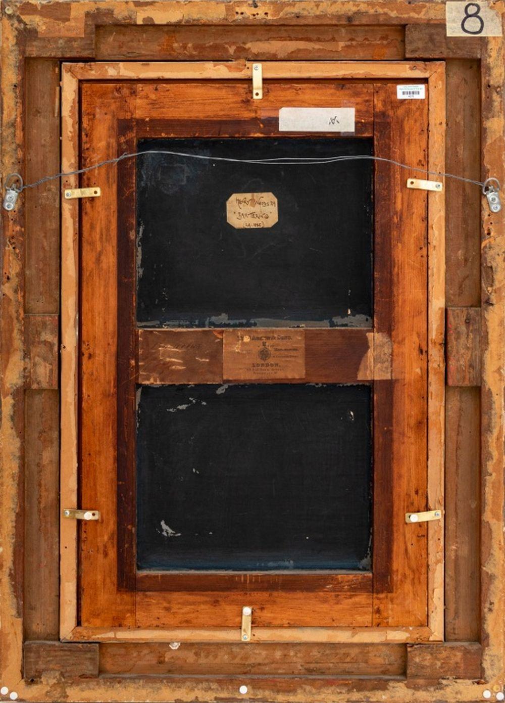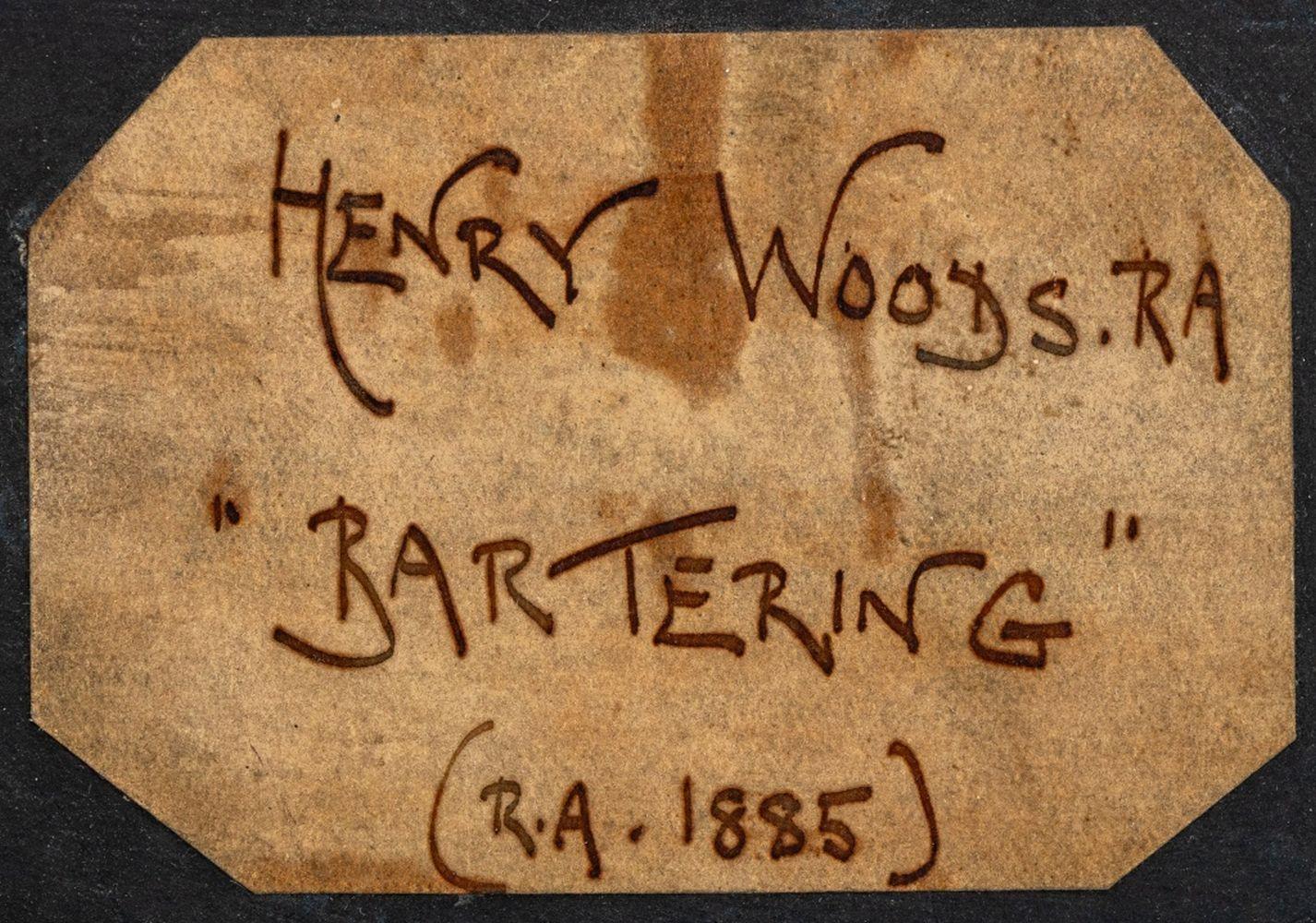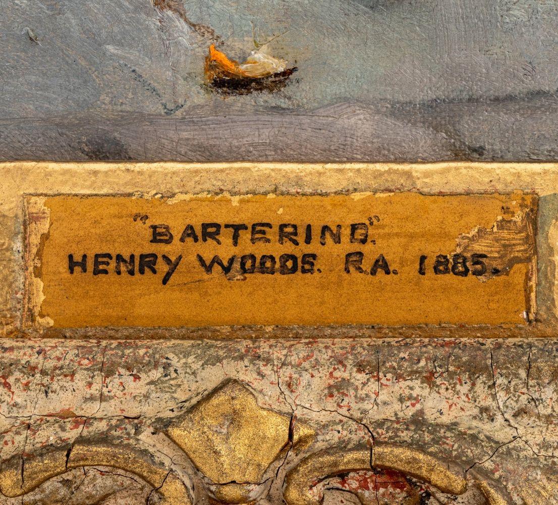 Henry Woods (anglais, 1846-1921), "Bartering", huile sur toile, 1885, signée et datée en bas à gauche, étiquettes de Thomas Agnew & Sons et Levy and Dweck Rare Antiques & Fine Art au verso, cadre en bois doré. Image : 28,5" H x 18" L ; cadre : 38" H x 27.25" L x 2.75" P. Provenance : Thomas Agnew & Sons, Londres. Christie's, New York, 27 octobre 2004, lot 8. Provenant d'une Collectional de la Cinquième Avenue. Expositions : Londres, Royal Academy, 1885, n° 350.