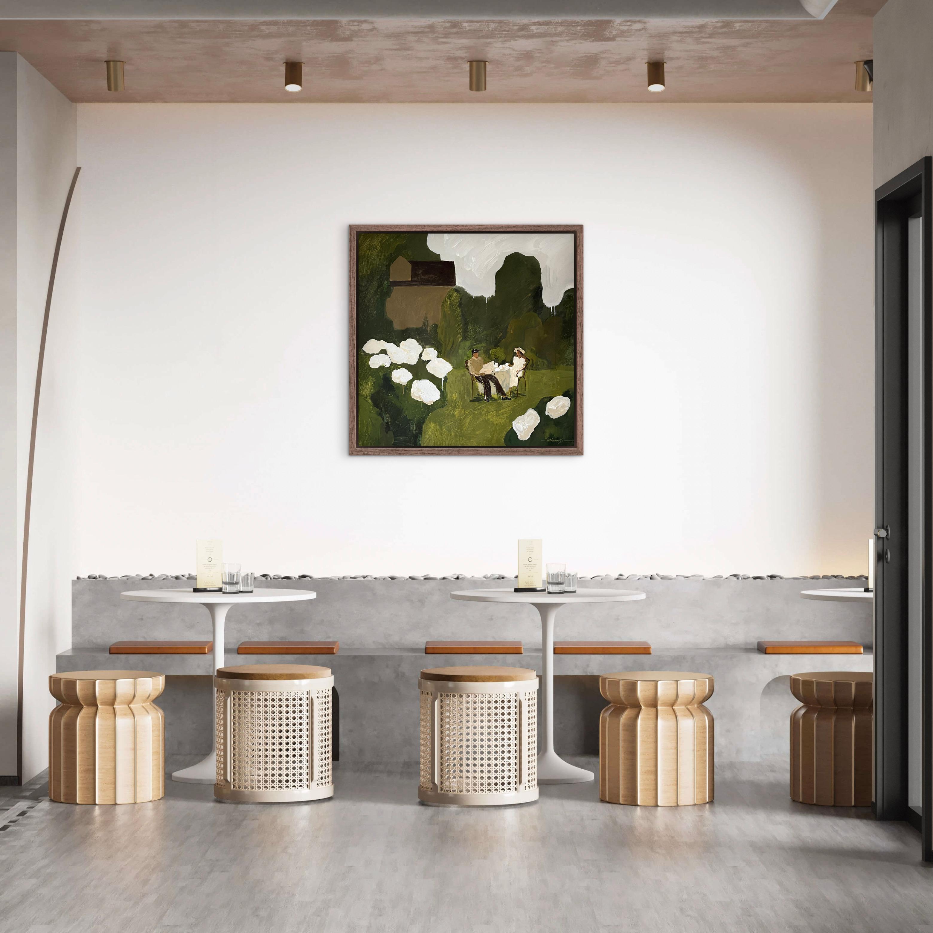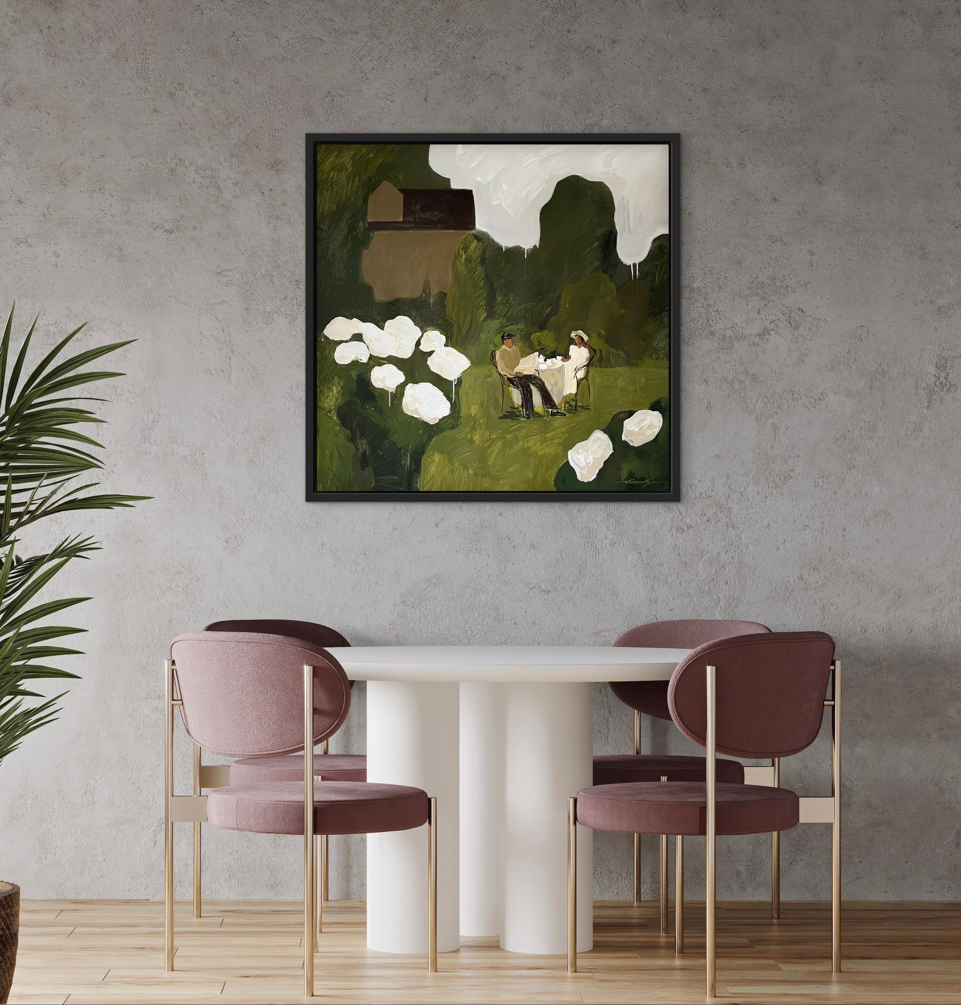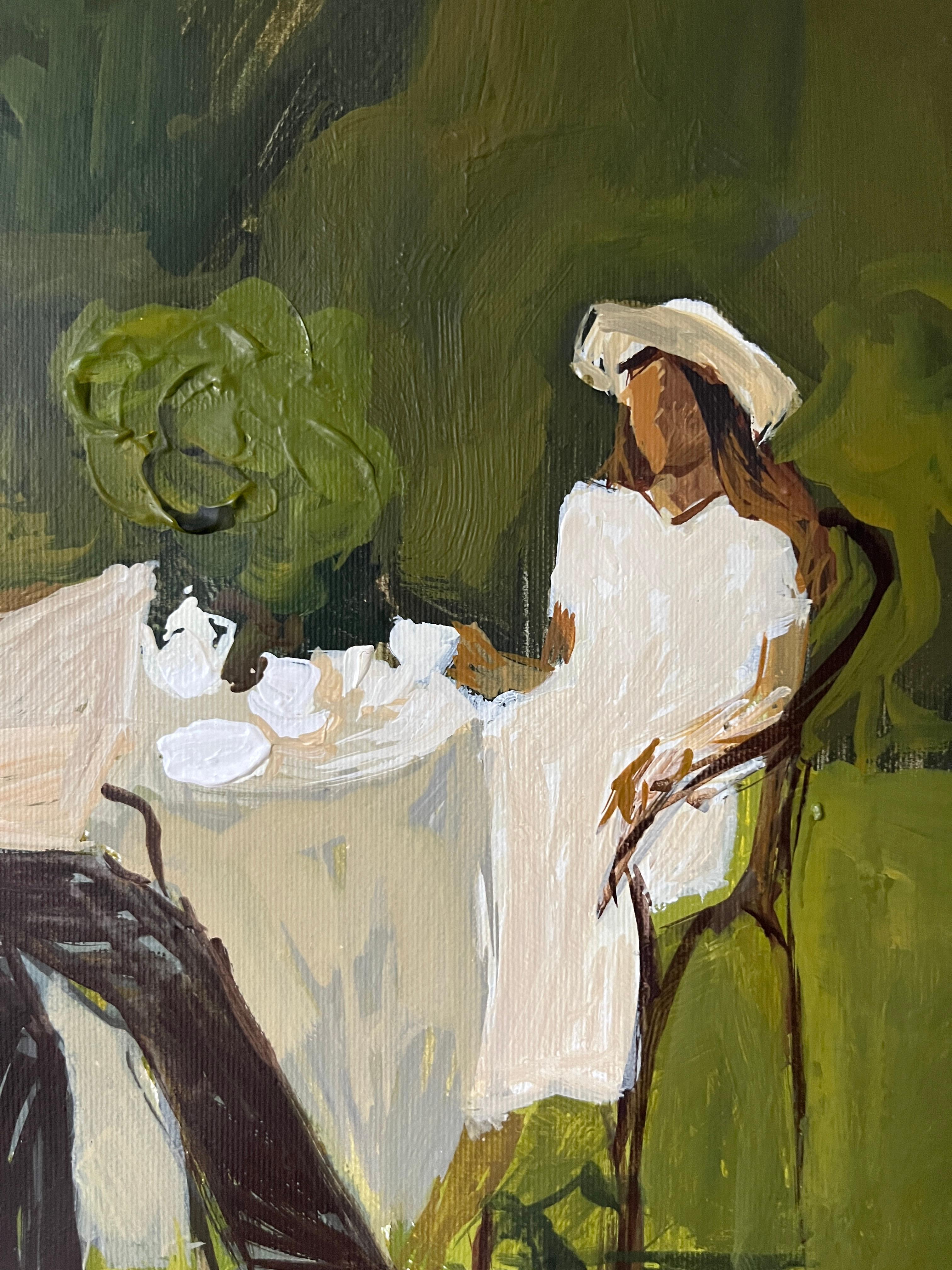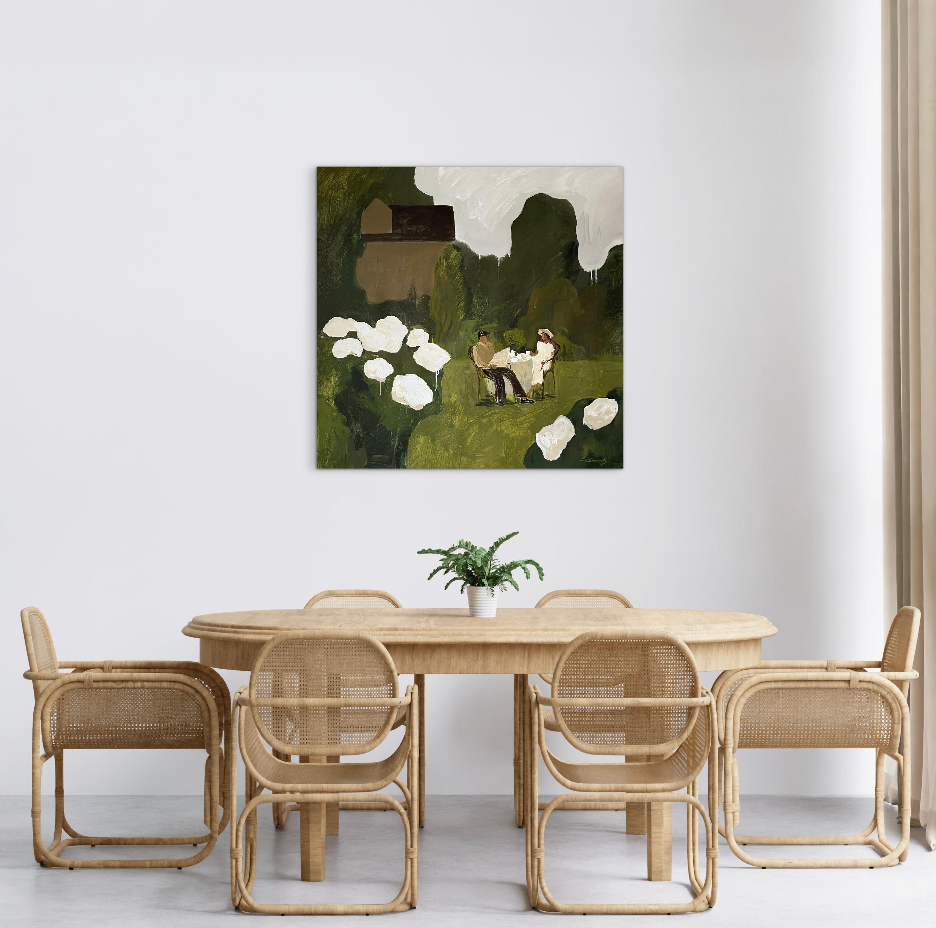 La douce palette de verts et de blancs crée une atmosphère de calme et de pureté, tandis que les coups de pinceau expressifs apportent chaleur et vie à la scène. Cette peinture est une ode à la tranquillité - un rappel de la beauté qui réside souvent dans le silence, la simplicité et le temps ralenti.