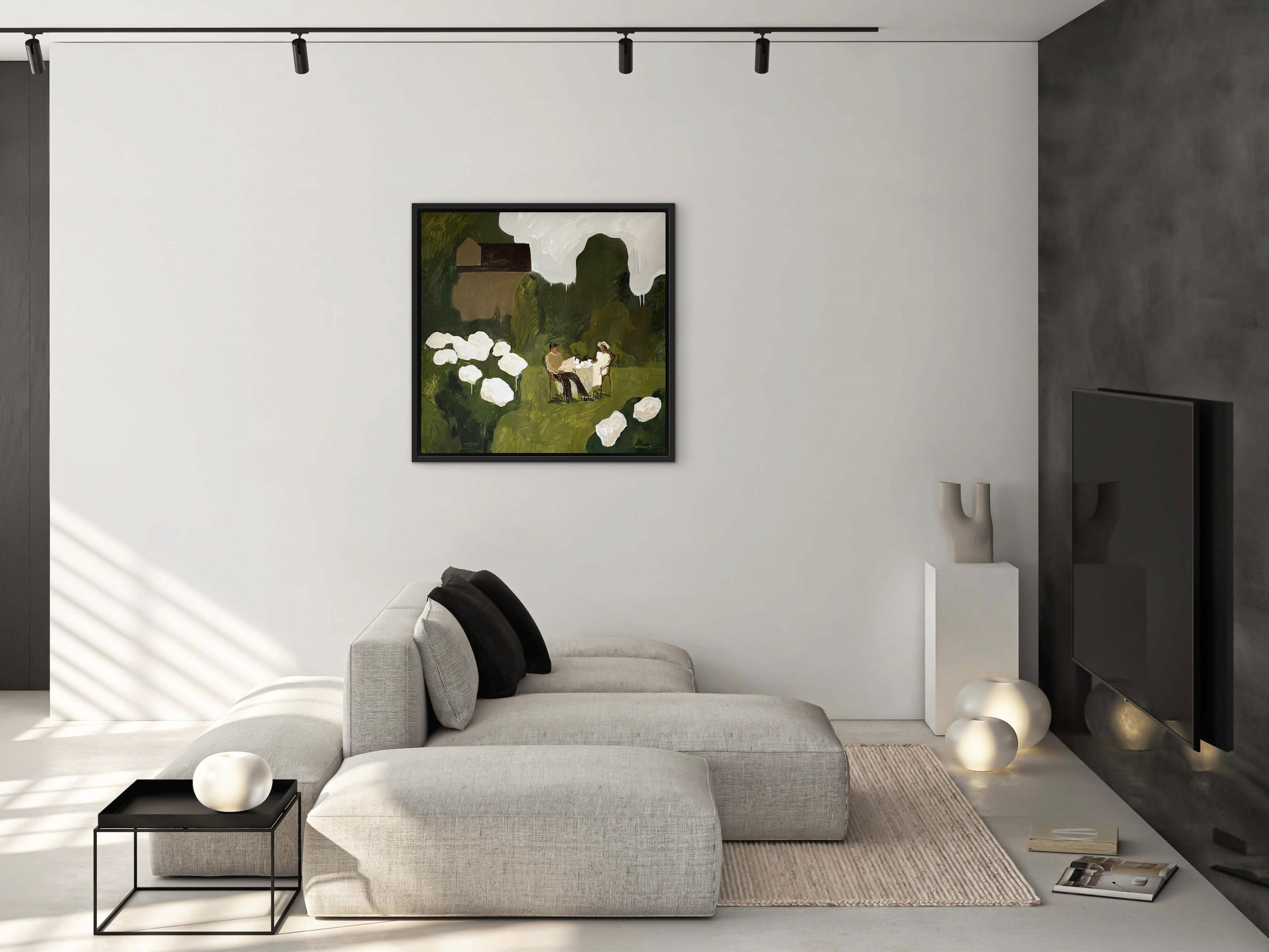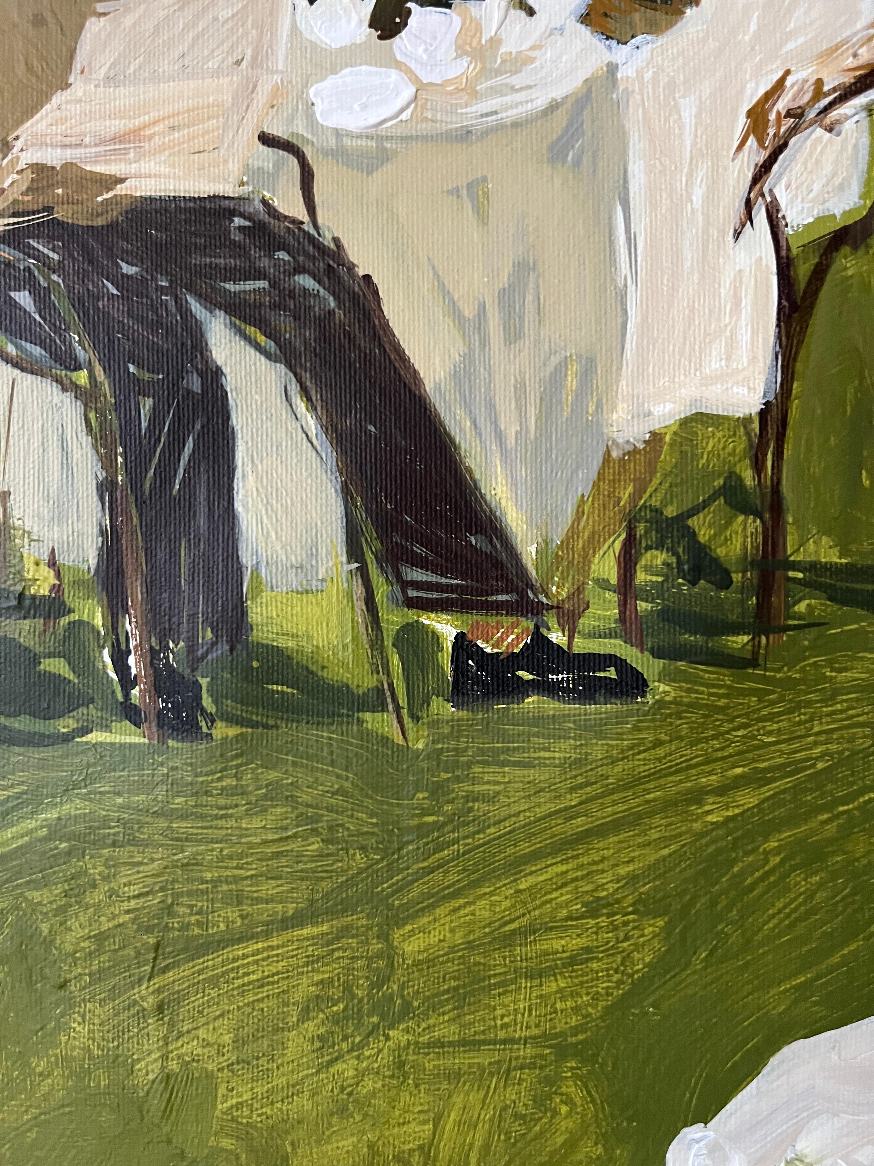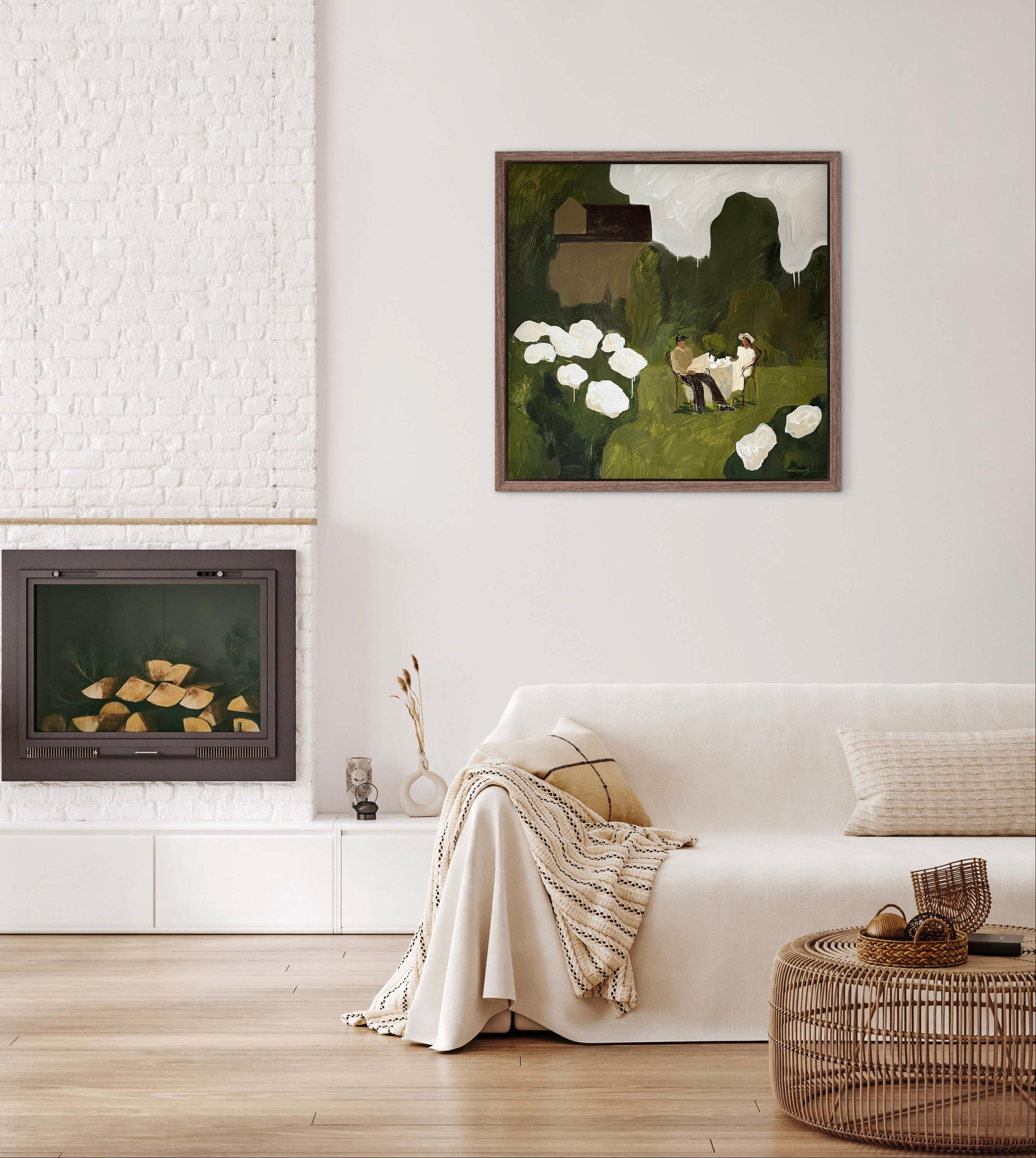 La douce palette de verts et de blancs crée une atmosphère de calme et de pureté, tandis que les coups de pinceau expressifs apportent chaleur et vie à la scène. Cette peinture est une ode à la tranquillité - un rappel de la beauté qui réside souvent dans le silence, la simplicité et le temps ralenti.