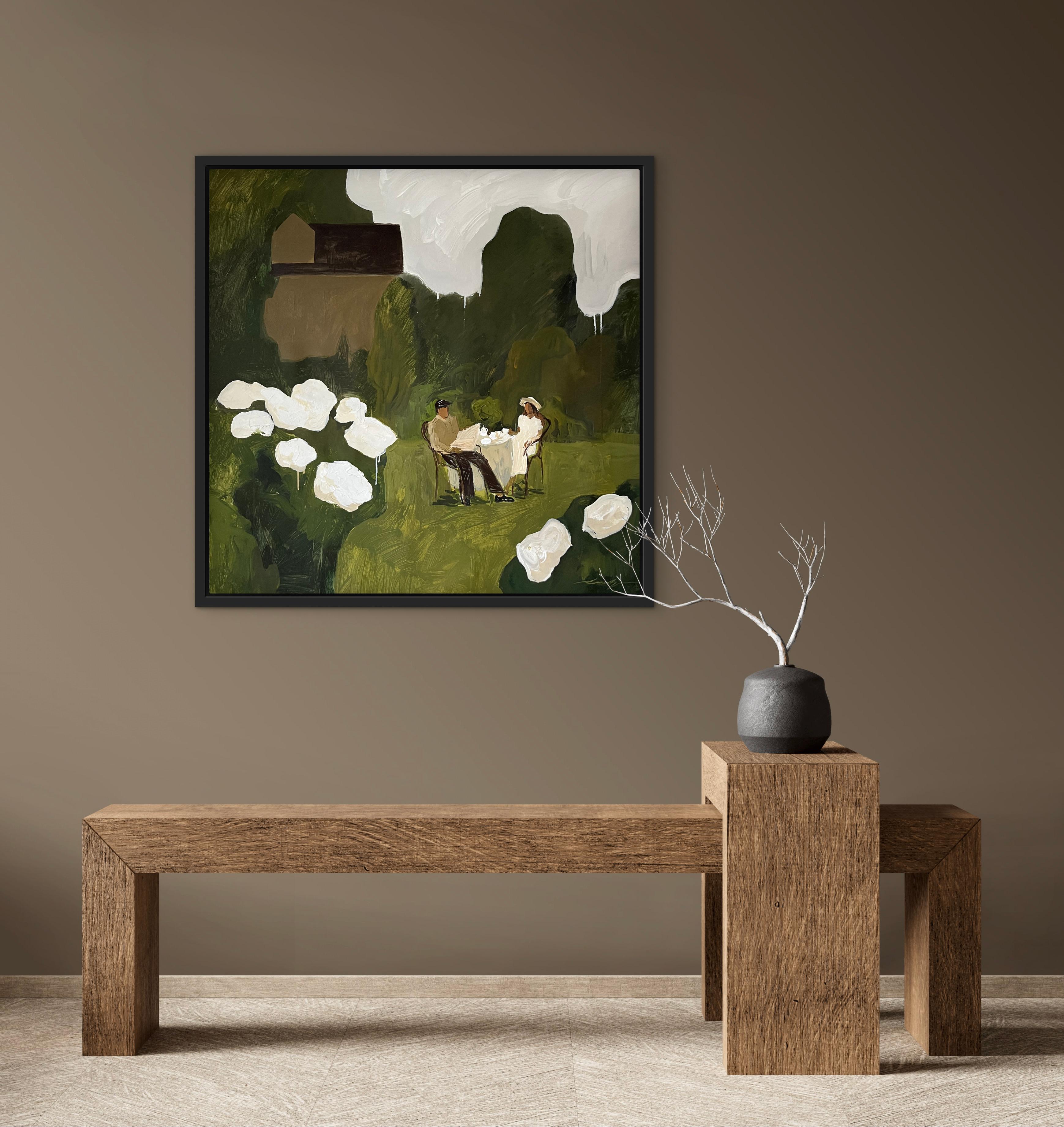Le temps des hortensias blancs capture la grâce tranquille des jours d'été - lorsque la lumière, la verdure et l'immobilité se fondent en un moment serein. Un couple est assis à une petite table blanche entourée d'hortensias en fleurs, partageant un après-midi paisible au rythme doux de la Nature.