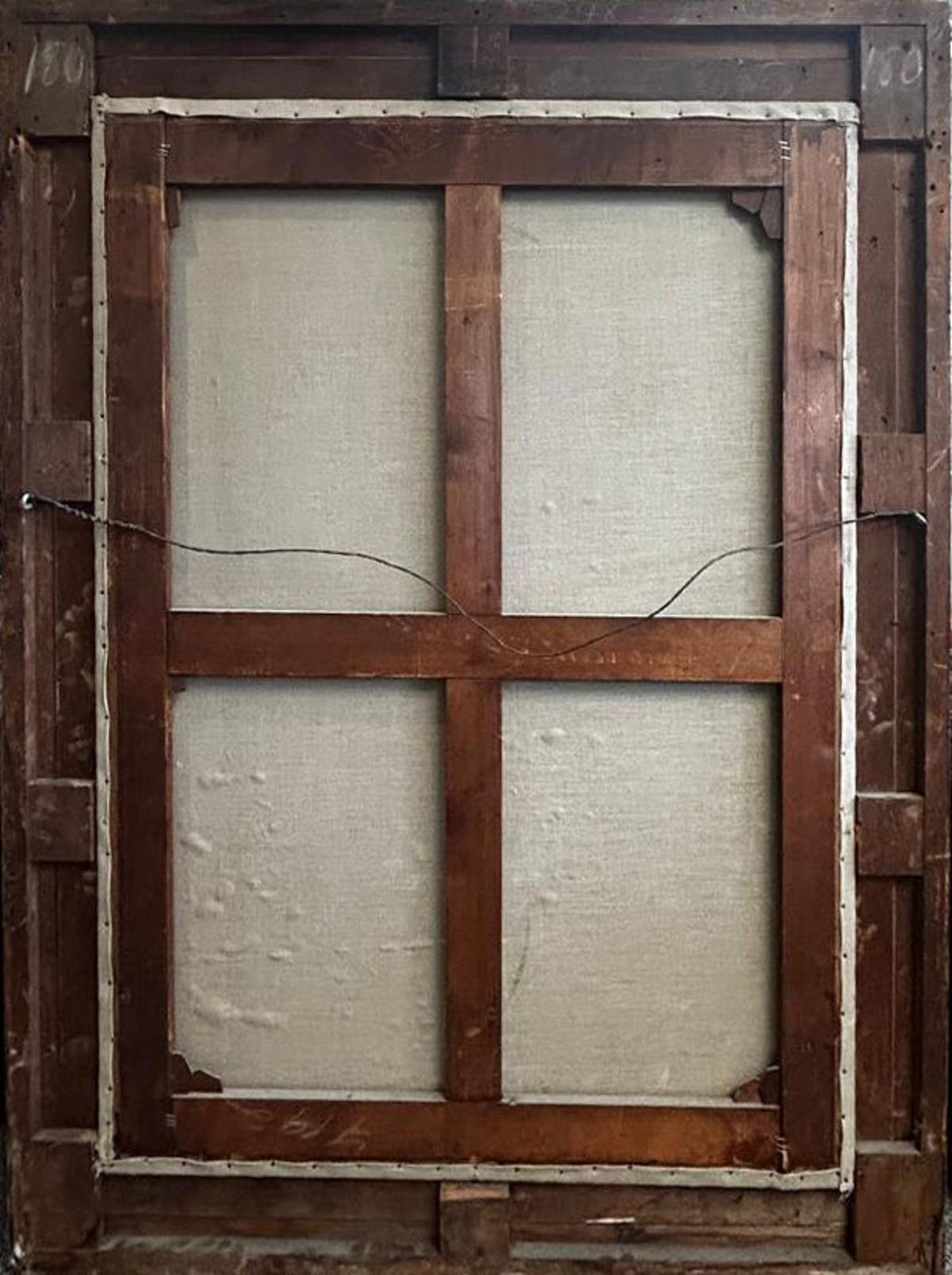 Une photographie scannée du dos de la toile prise avant le regarnissage montre l'inscription "Fanny Adams / peint par / Mary J. Peale / ...