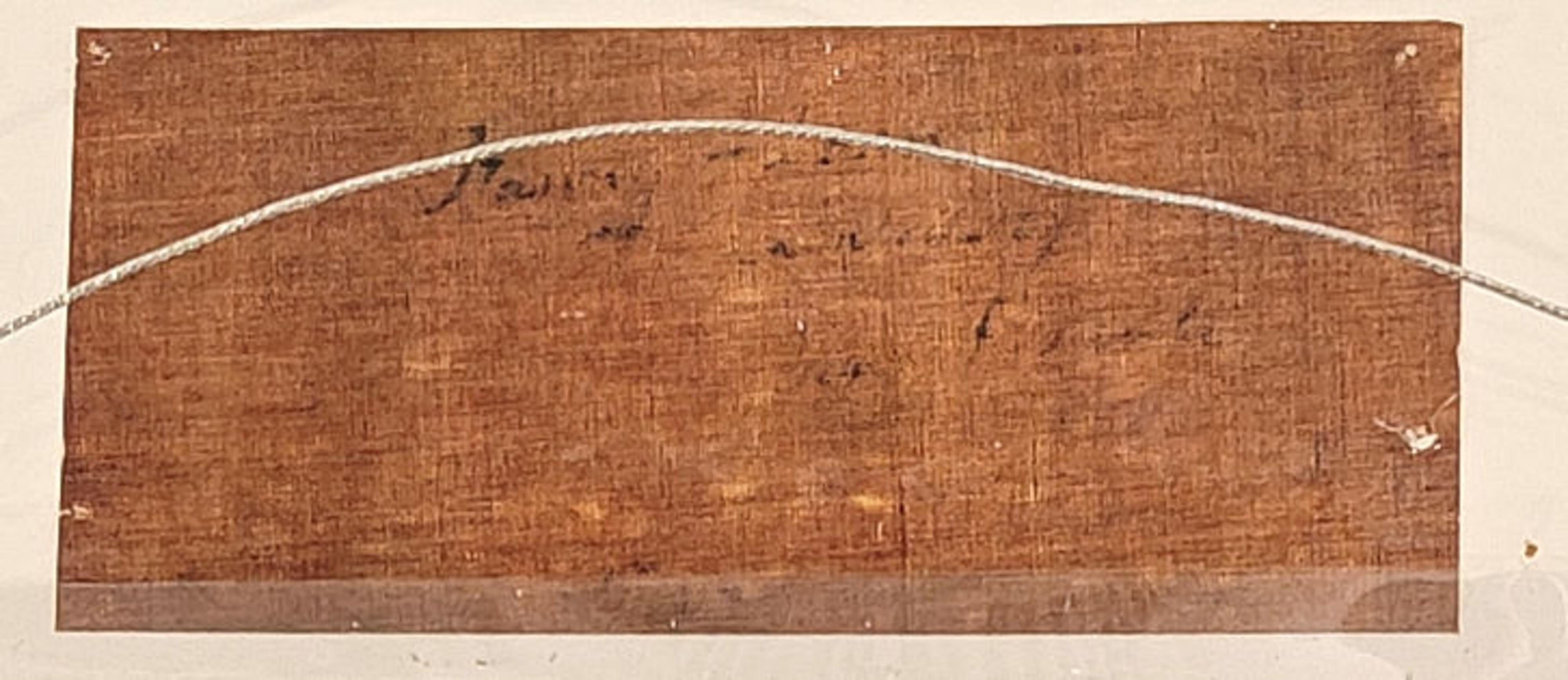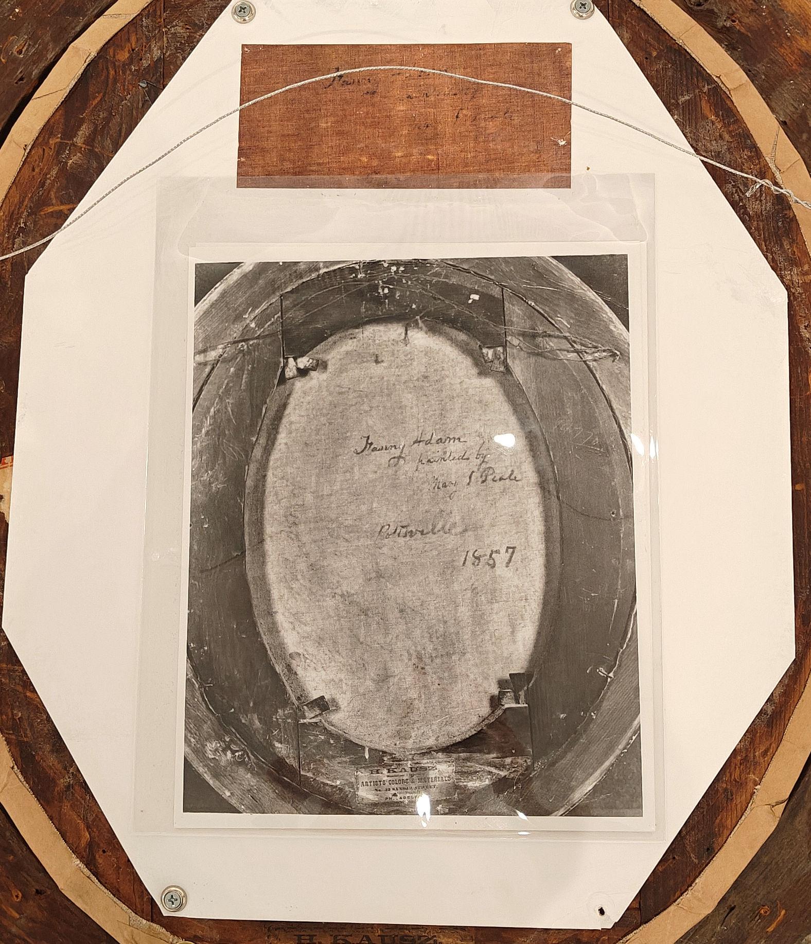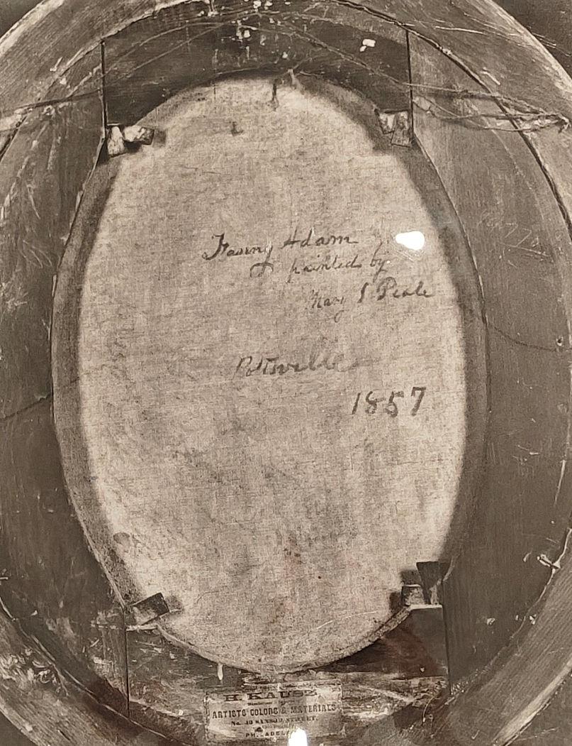 Une photographie scannée du dos de la toile prise avant le regarnissage montre l'inscription "Fanny Adams / peint par / Mary J. Peale / Pottsville / 1857"