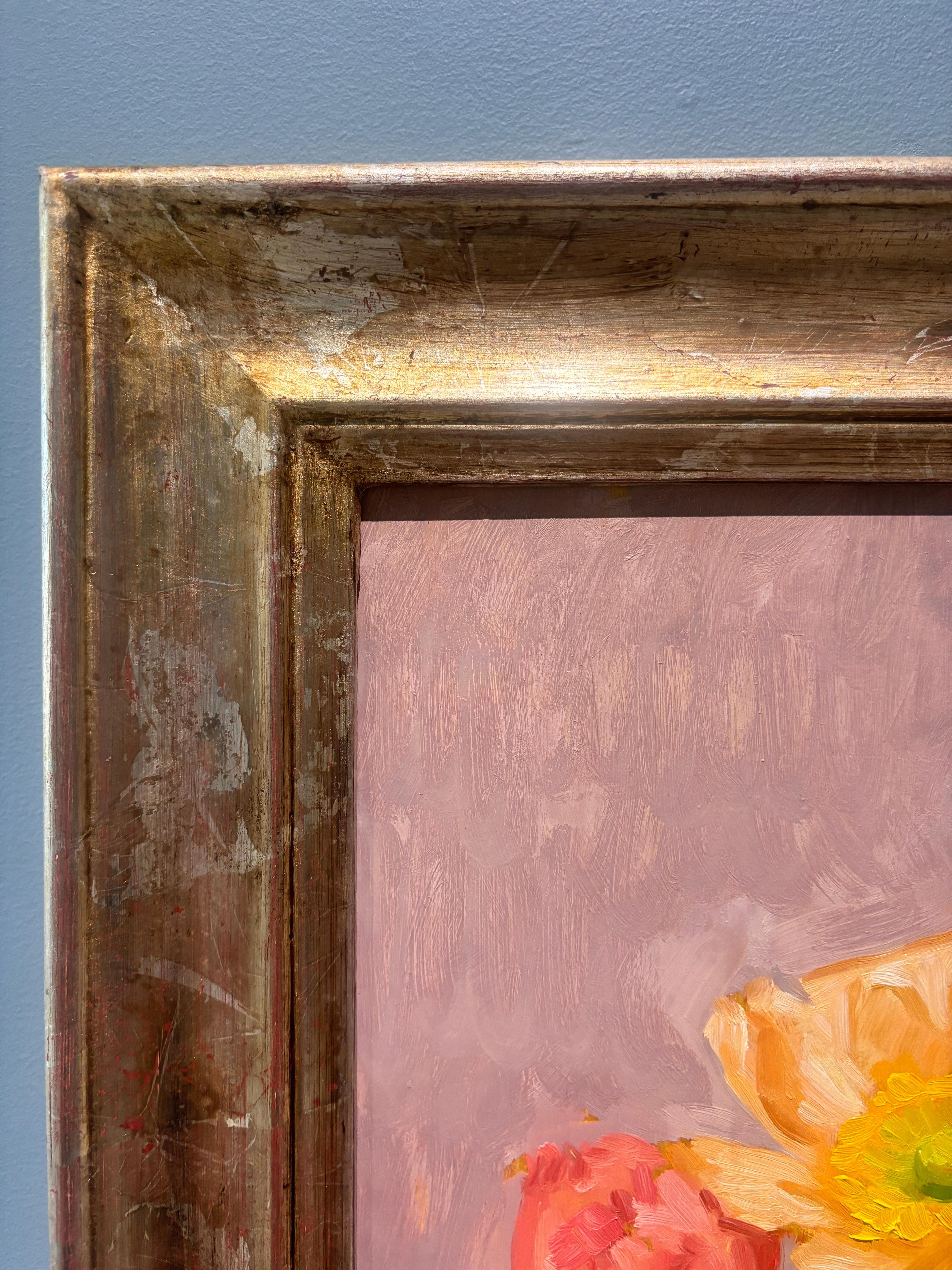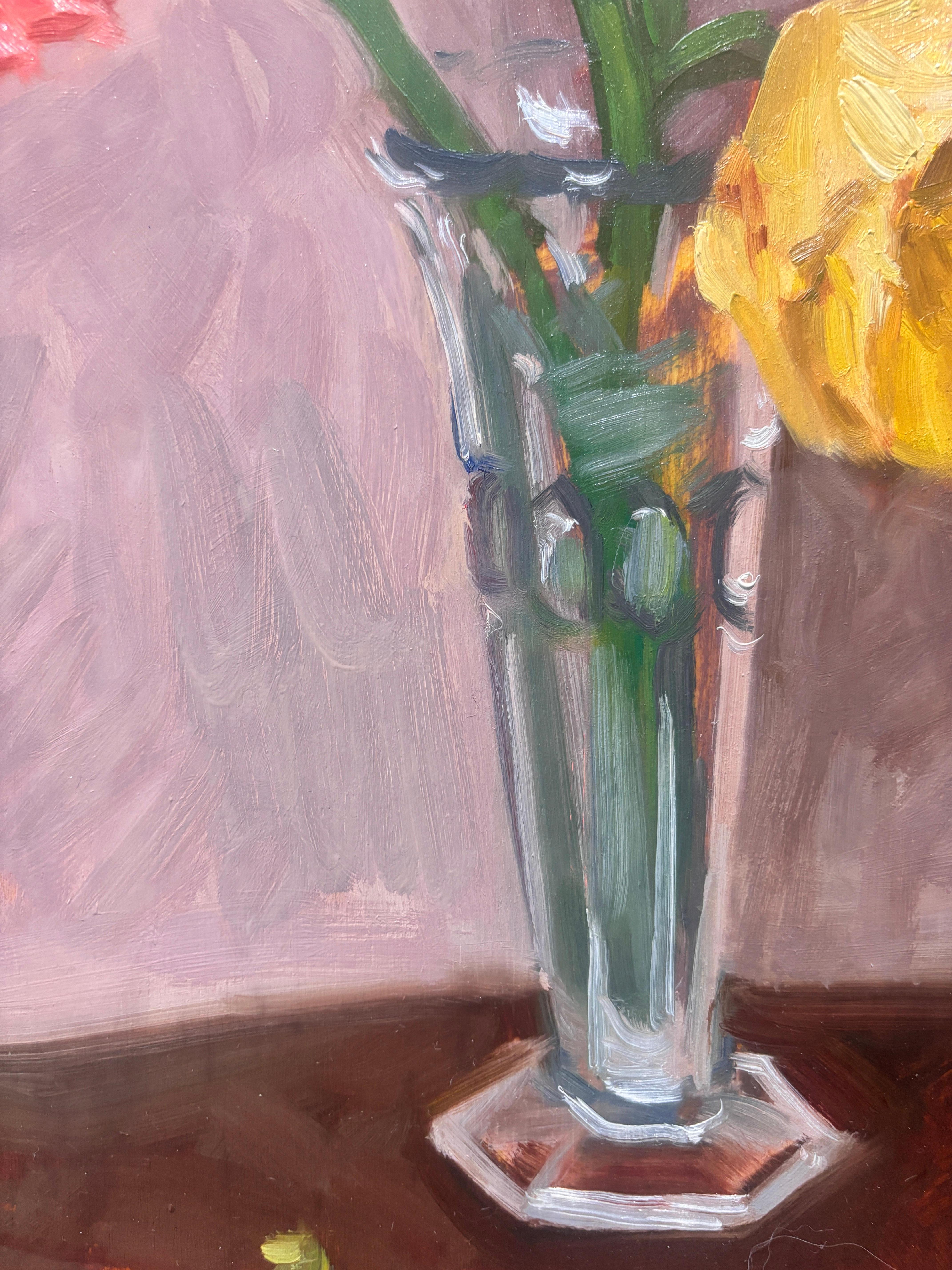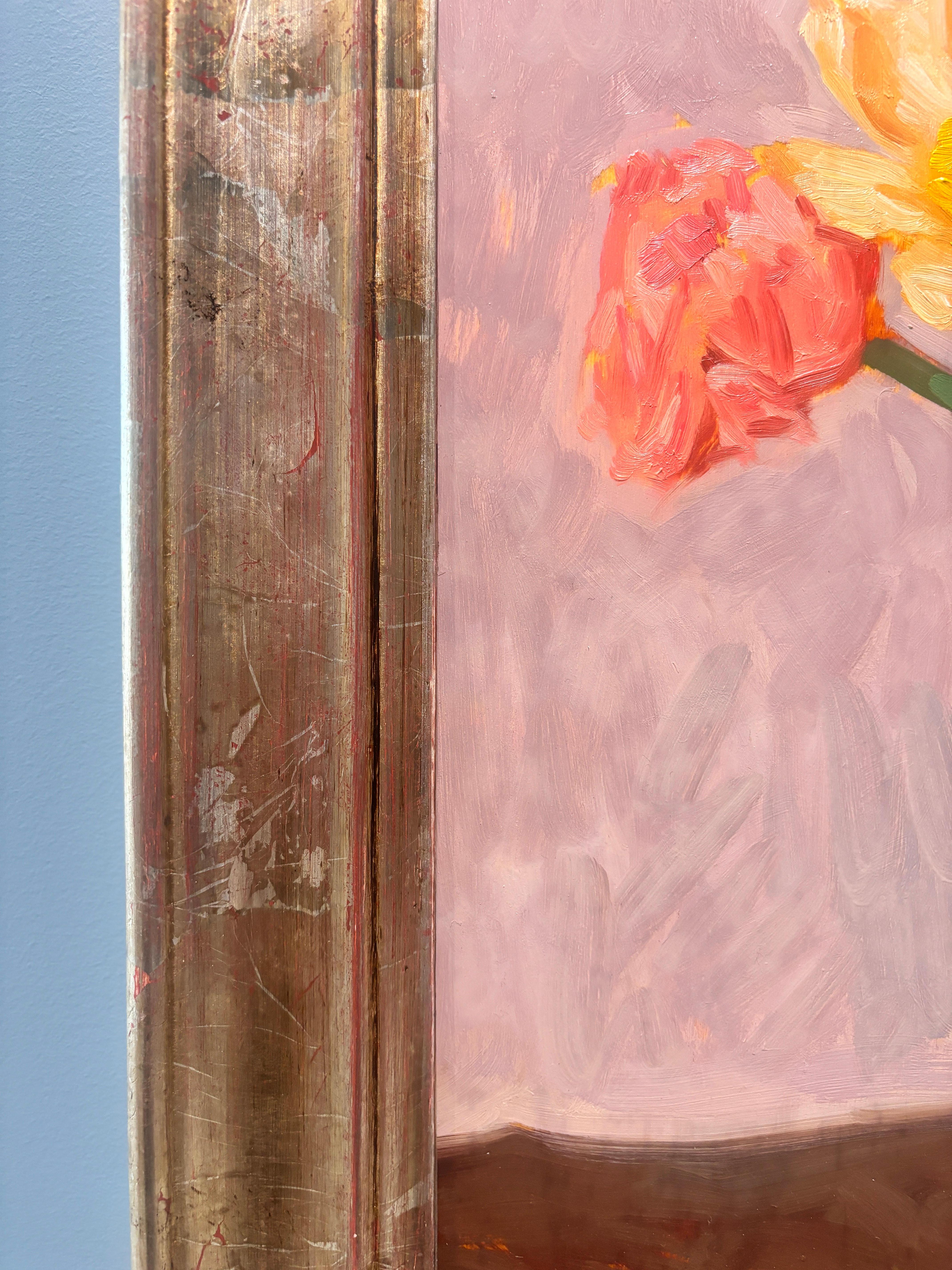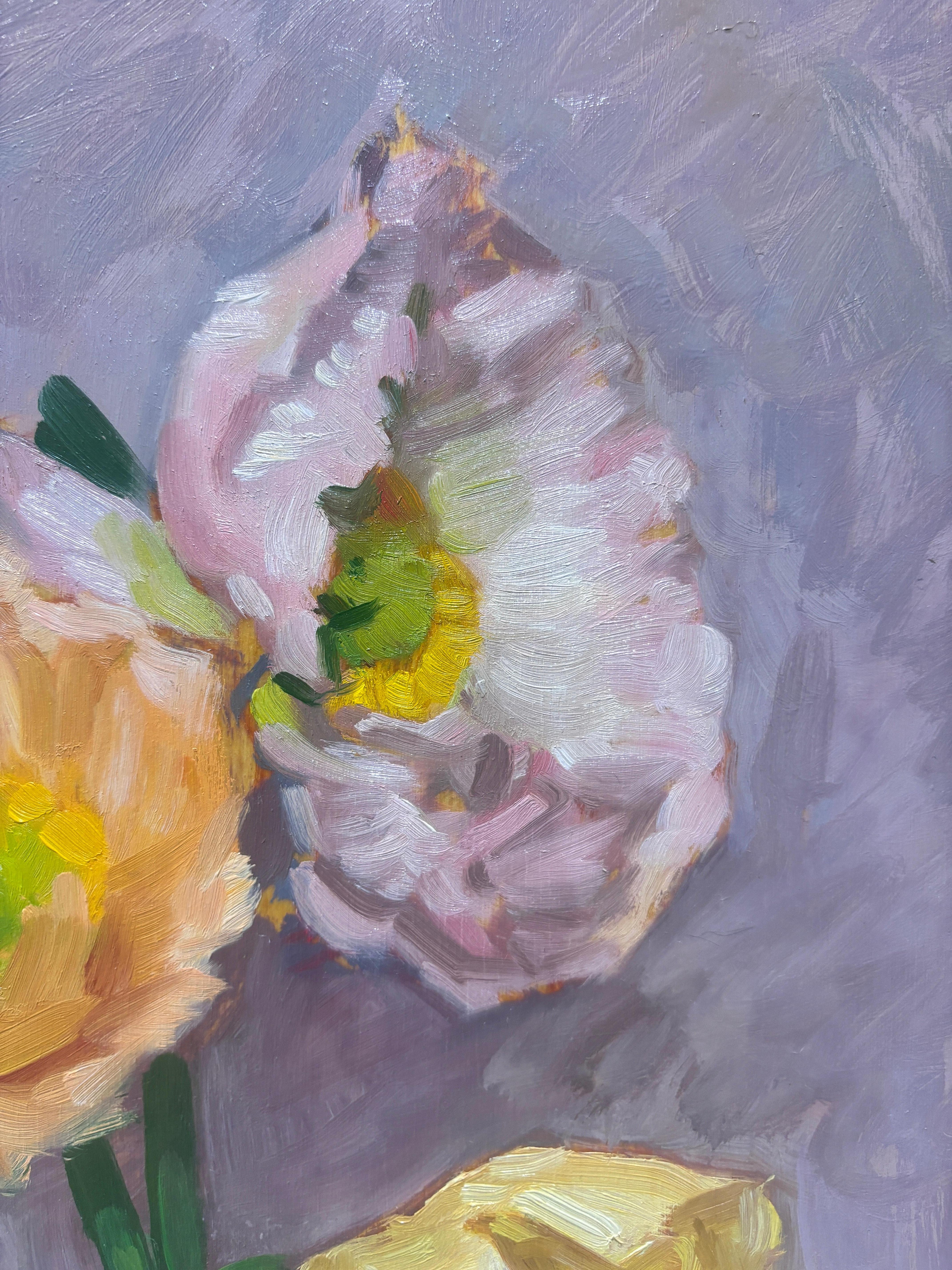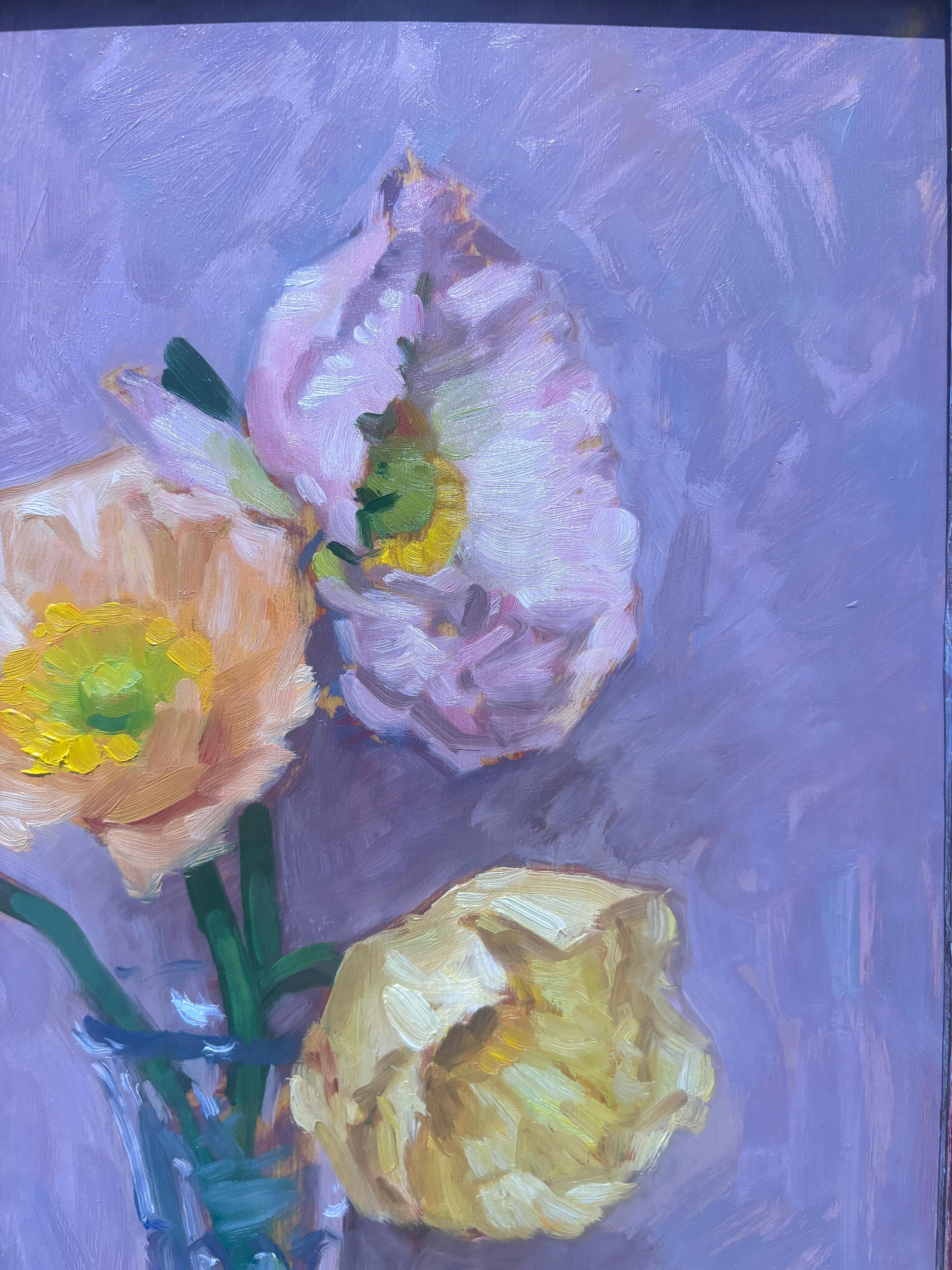 "Peonies" est une nature morte à l'huile représentant des pivoines roses et jaunes dans un vase en verre sur une table en bois devant un mur aux tons rosés. La vidéo illustre le plus fidèlement la couleur.