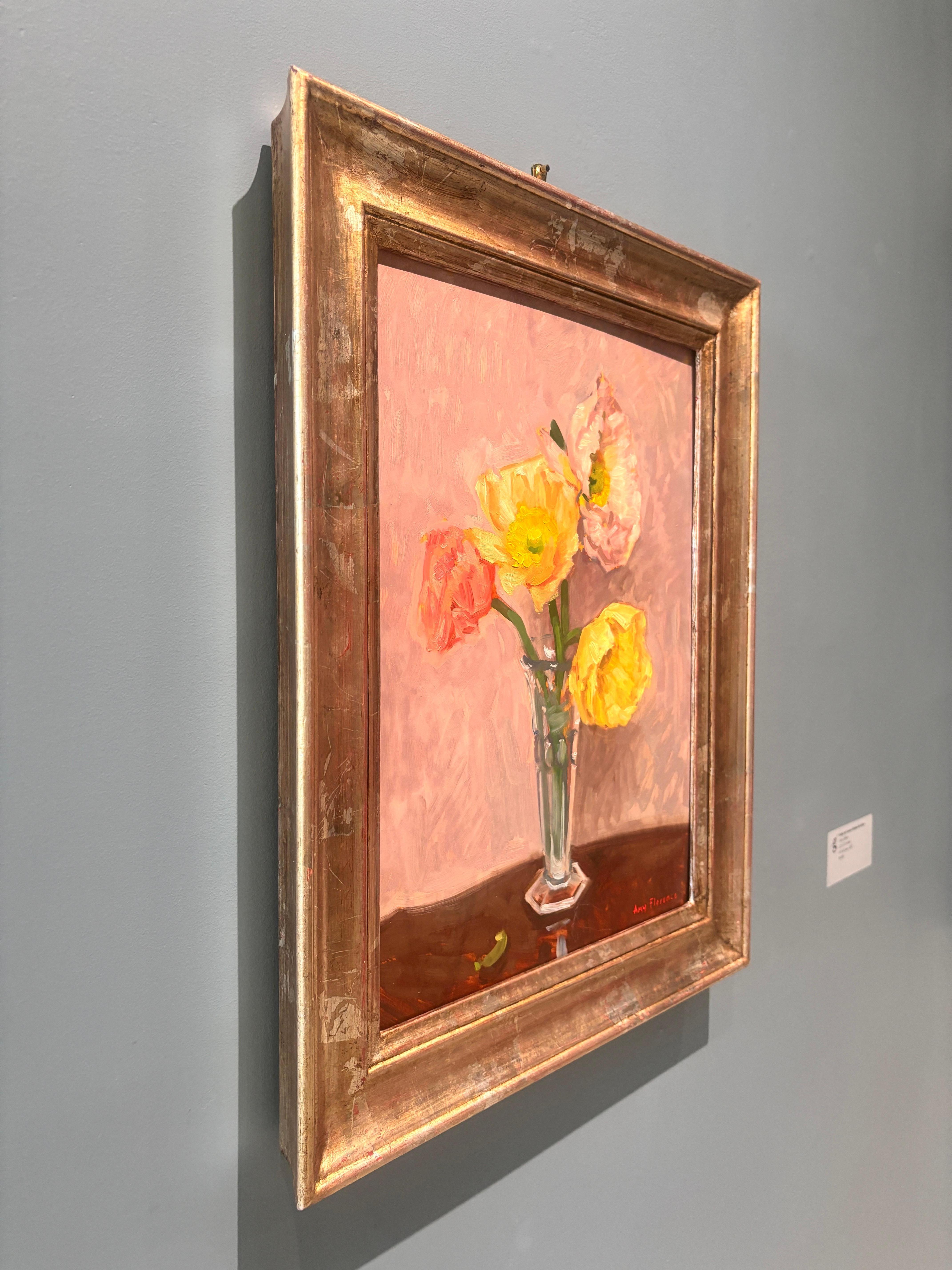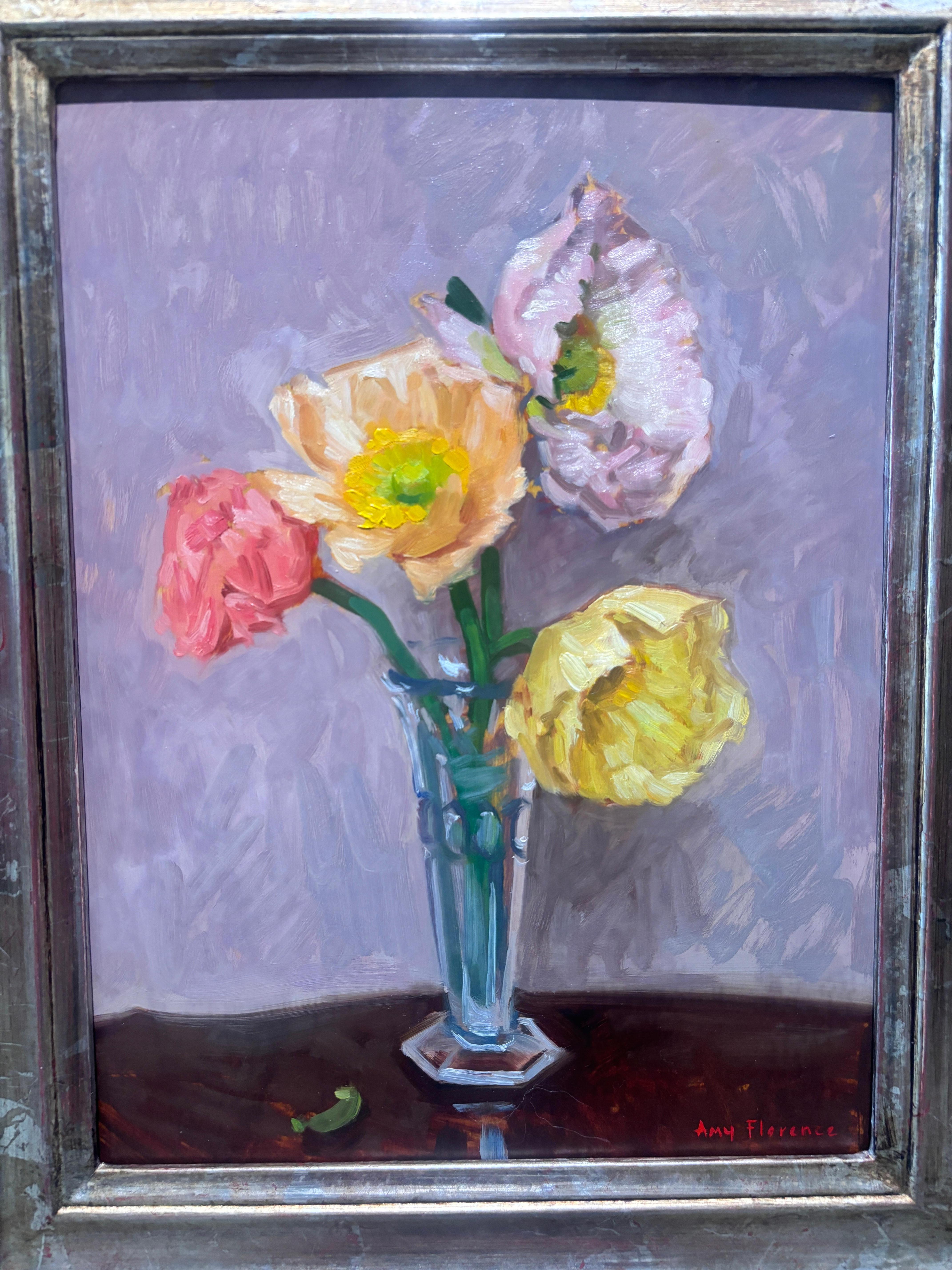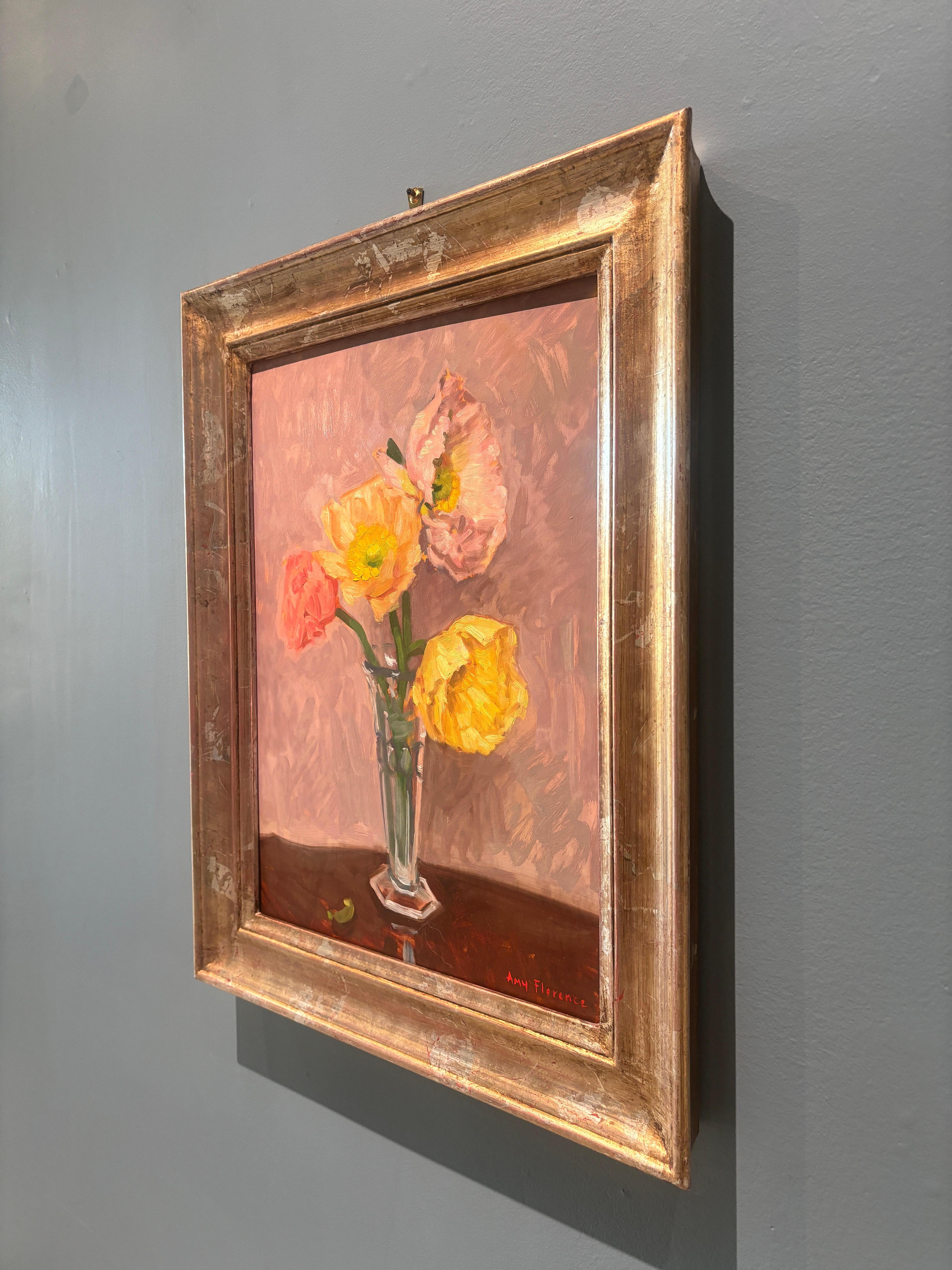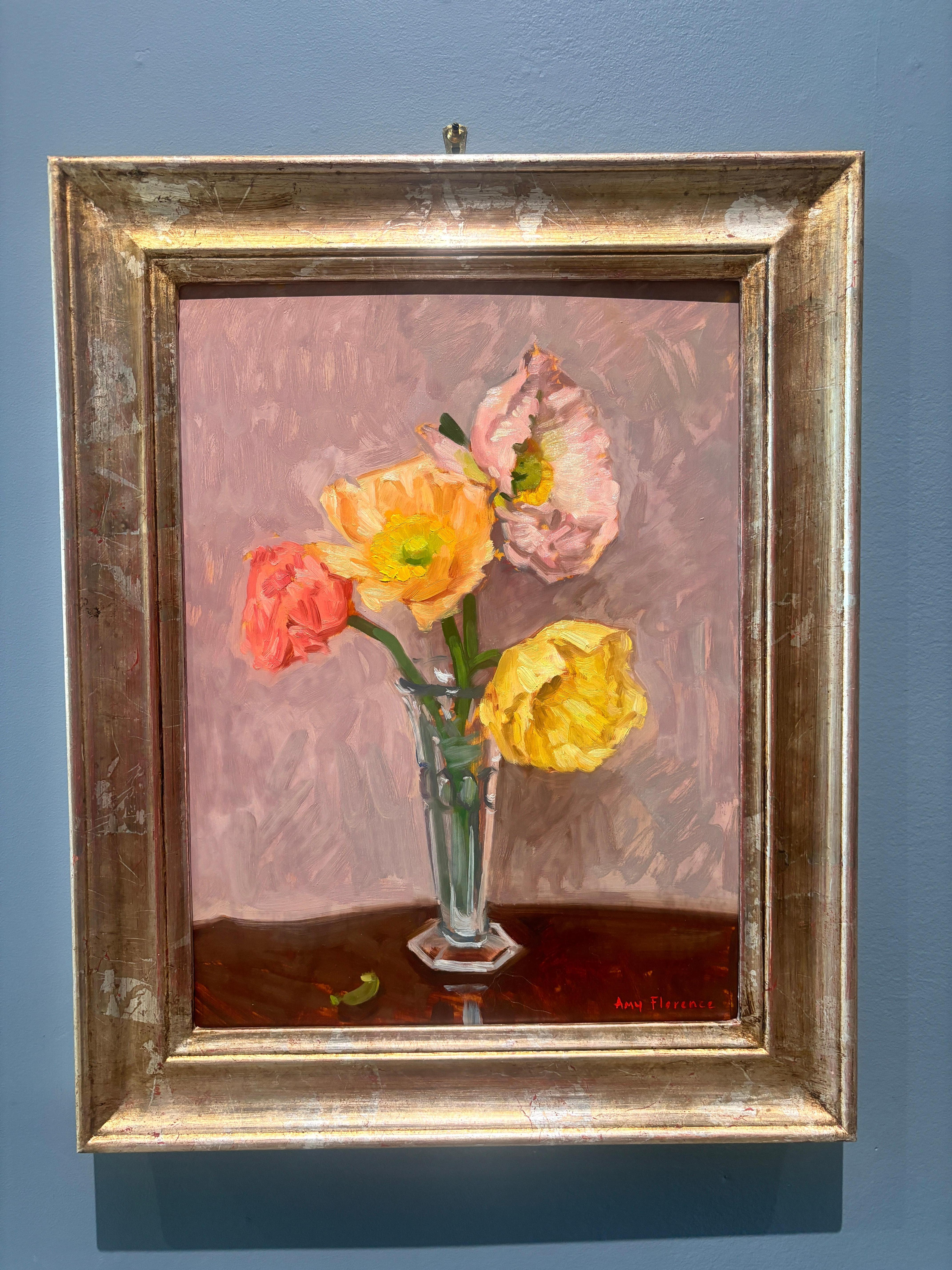 Amy Florence"Poppies" peinture à l'huile, nature morte, fleurs sauvages dans un vase en verre, signée et encadrée2025