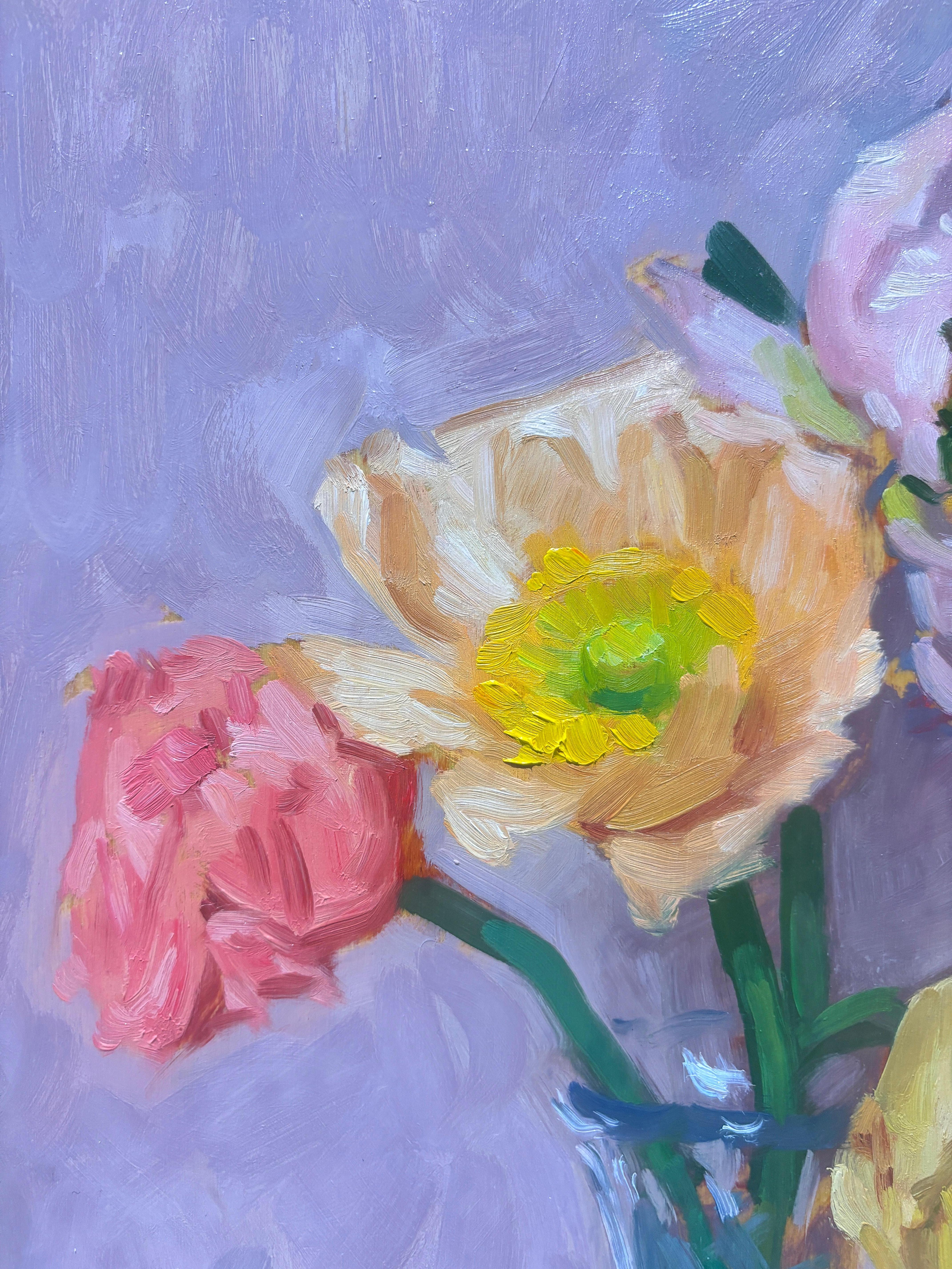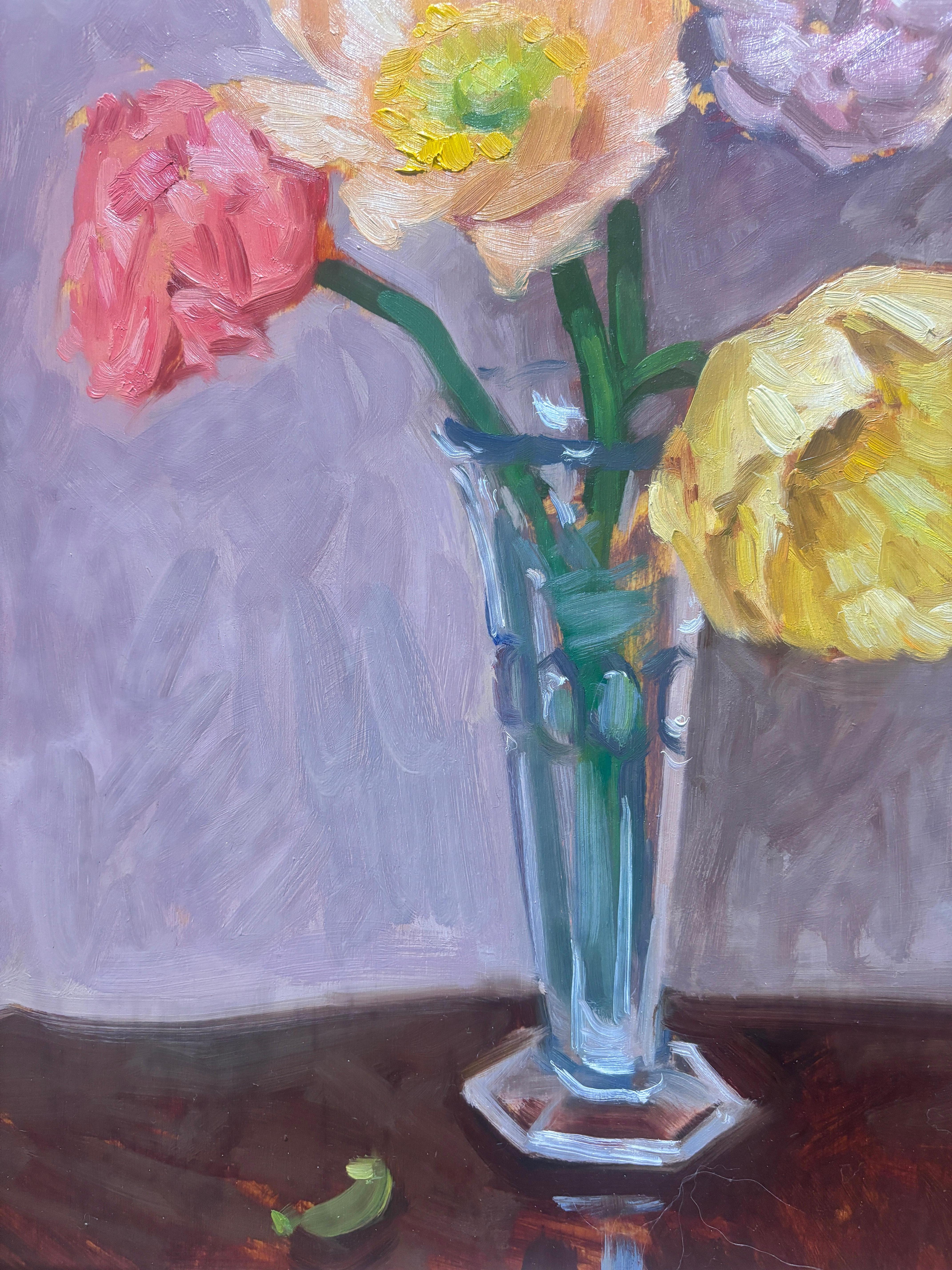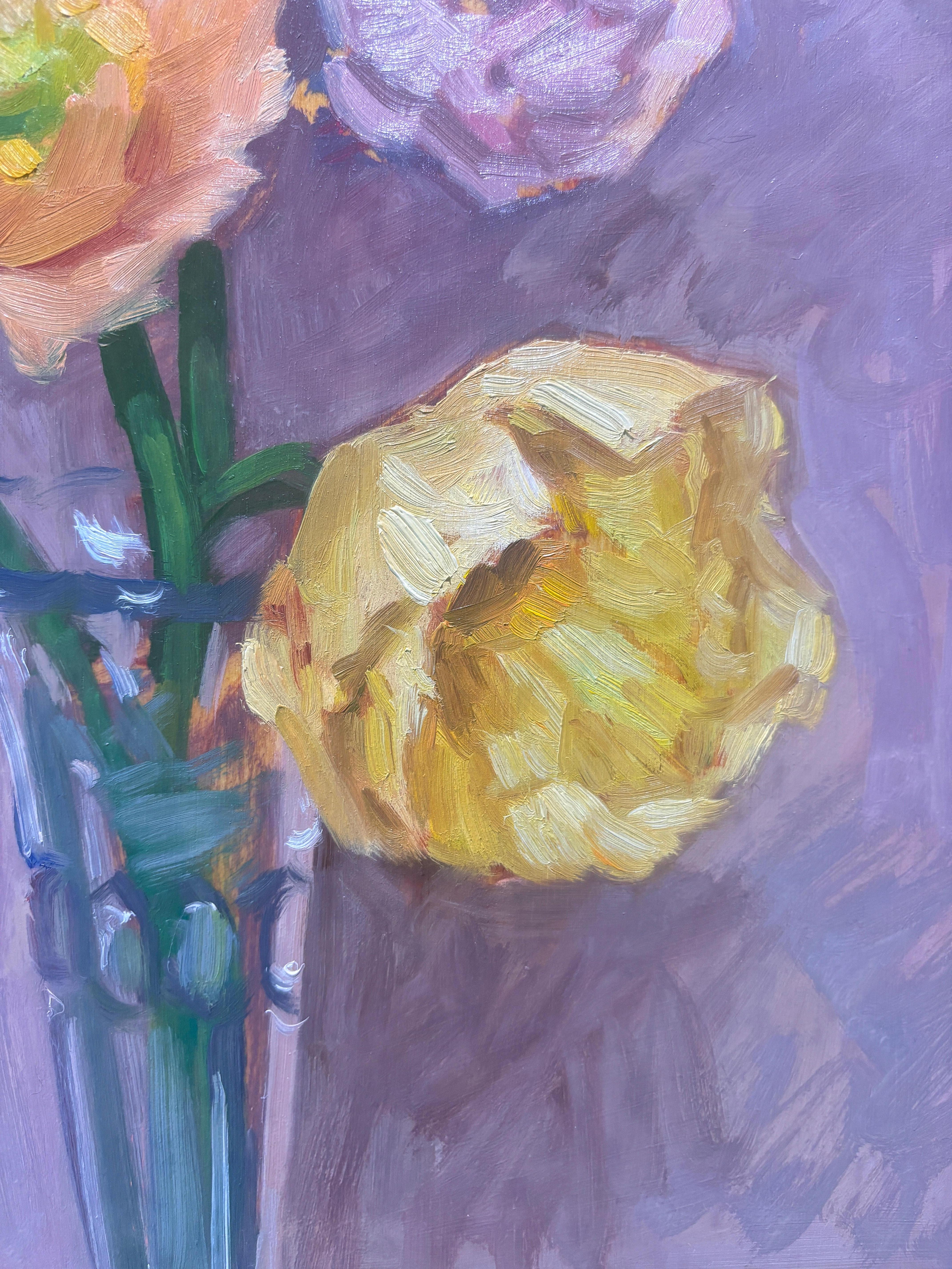 Nature morte fleurie impressionniste contemporaine lumineuse "Renoncules et roses".