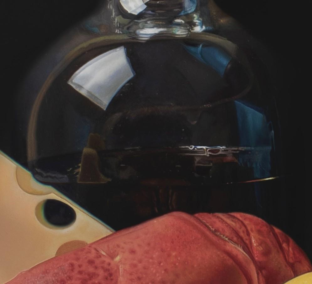L'œuvre "While You Weren't Looking" (2025) de David Cheifetz est une peinture à l'huile originale sur panneau d'aluminium, réalisée à la main, qui représente une nature morte luxuria...