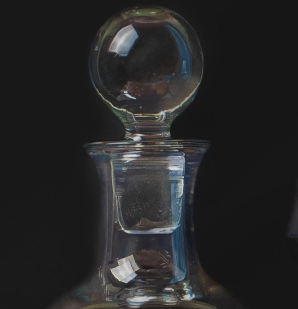 "Primaries" est une nature morte contemporaine délicieusement détaillée de Karina Rodríguez, rendue à l'huile sur panneau en 2019 et représentant trois bocaux en verre avec un liquid...