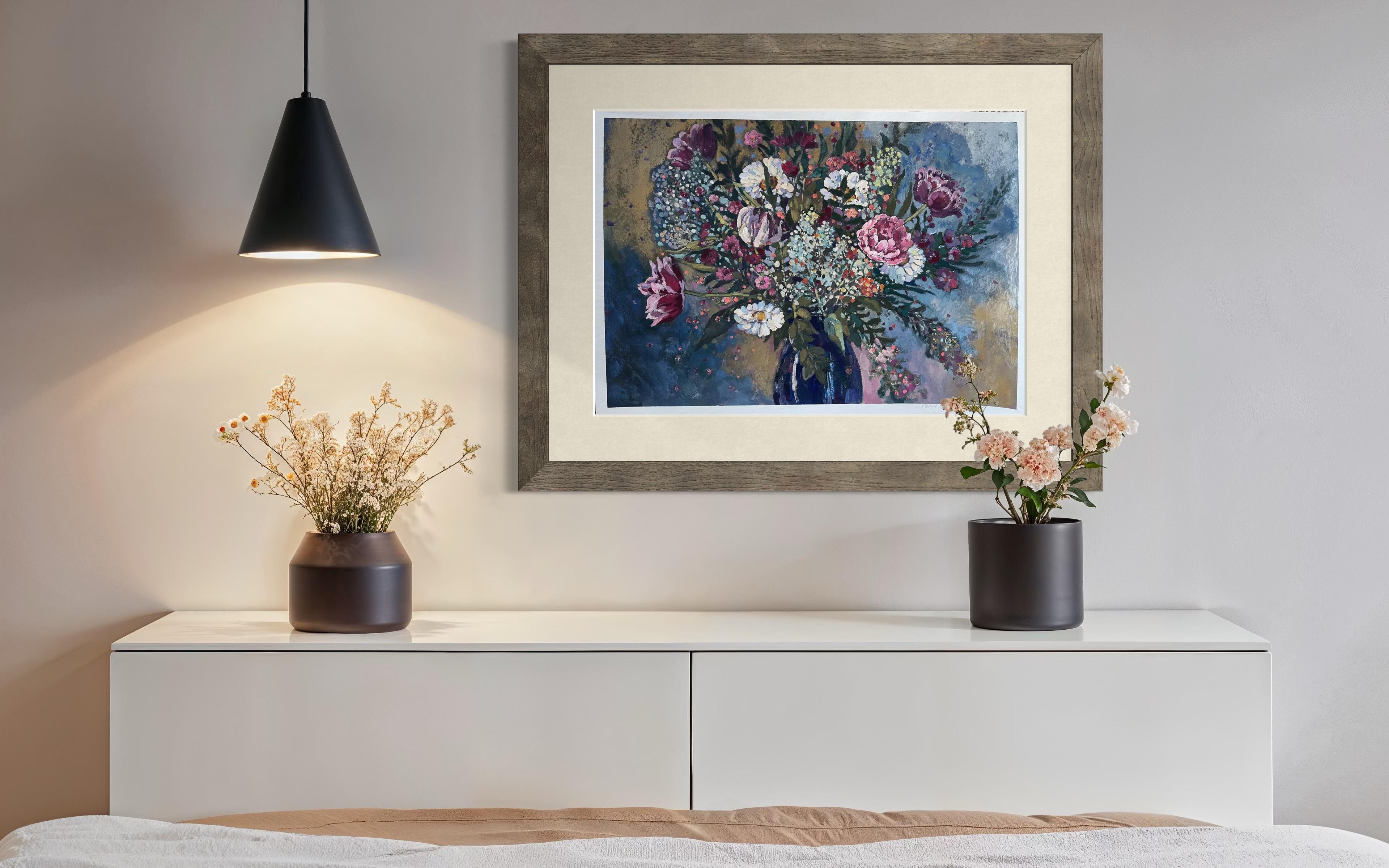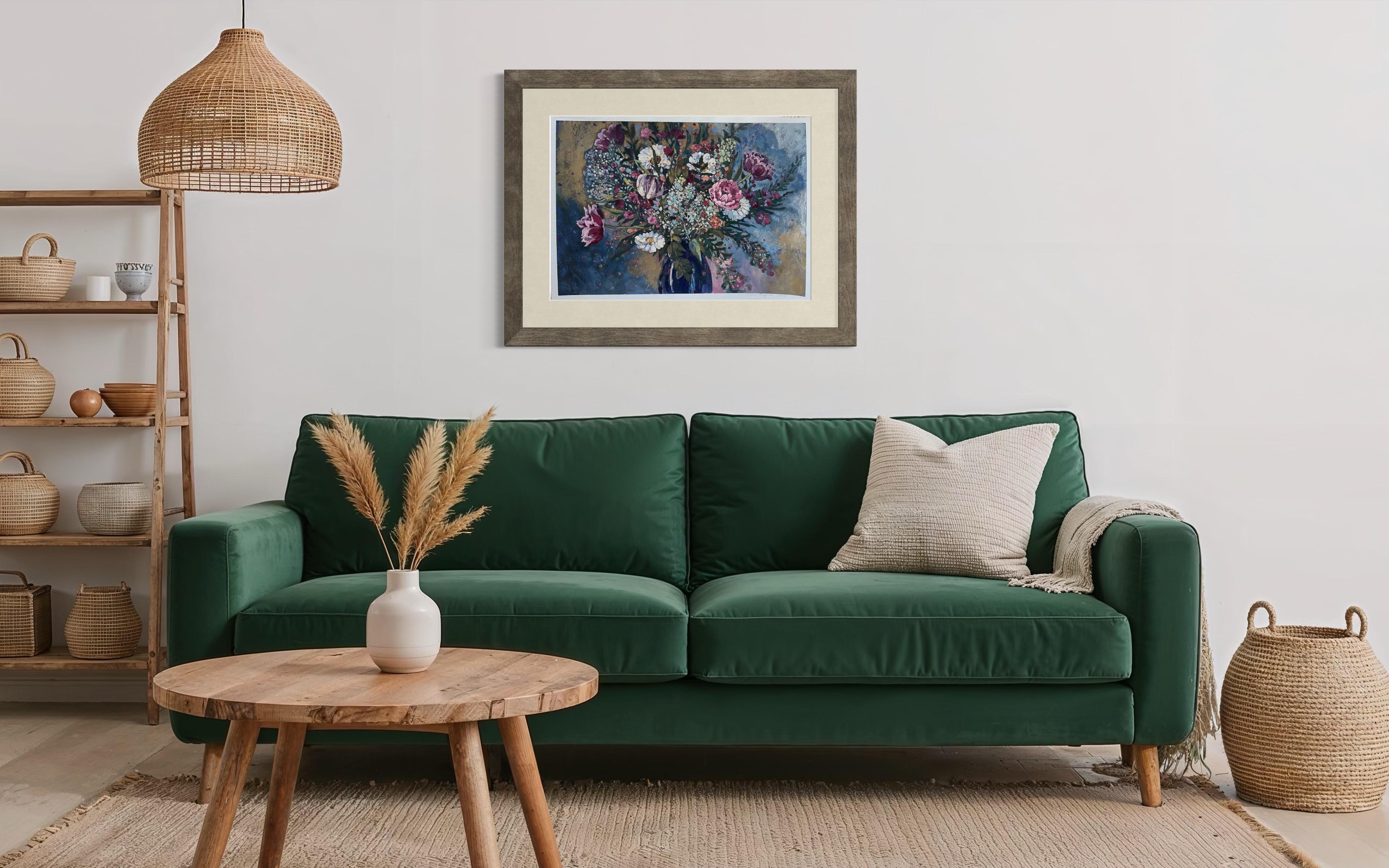 Cette œuvre d'art vibrante est une nature morte magistrale représentant un bouquet luxuriant logé dans un vase sombre et élégant. Les fleurs vives et audacieuses, telles que les pivoines et les tulipes, s'épanouissent avec une présence frappante, leurs roses et leurs blancs riches contrastant avec les subtiles teintes bleues et violettes de l'arrière-plan. De délicats brins d'haleine de bébé ajoutent de la texture et de la légèreté, se faufilant à travers le dense éventail de fleurs. L'utilisation de tons sombres et terreux dans le feuillage accentue l'éclat des pétales, créant ainsi un équilibre harmonieux. Le peintre utilise habilement un mélange de traits larges et expressifs et de détails fins, conférant à l'œuvre à la fois dynamisme et précision. La toile de fond douce et atmosphérique met en valeur l'arrangement luxuriant et opulent, attirant l'œil du spectateur sur le jeu exquis des couleurs et des formes. Cette œuvre d'art captive par ses riches textures et ses contrastes vibrants, présentant une célébration intemporelle de la beauté naturelle.