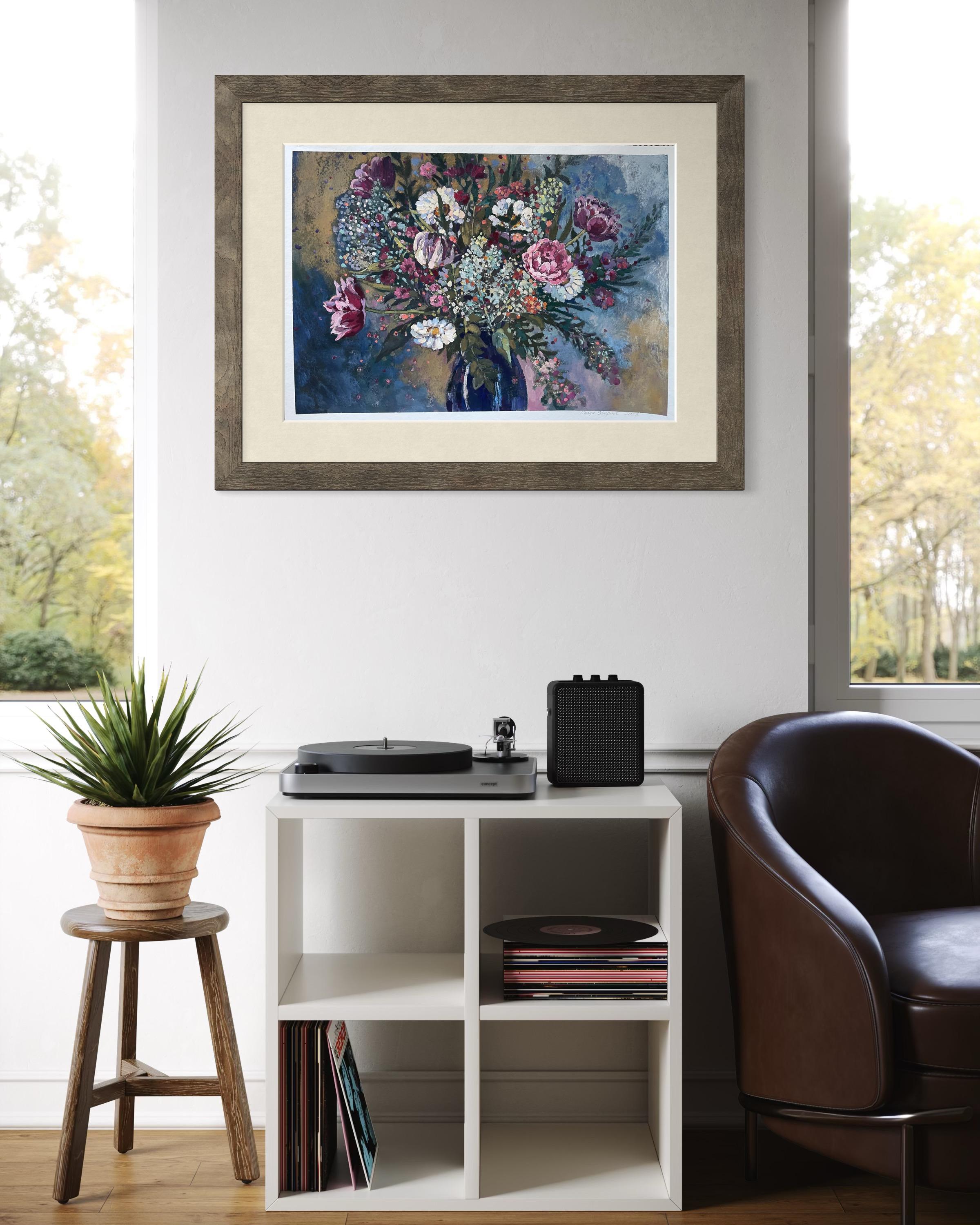 Cette œuvre d'art vibrante est une étonnante nature morte qui capture l'essence de l'abondance florale. Un robuste bouquet de fleurs, dominé par des rouges riches, des violets profon...