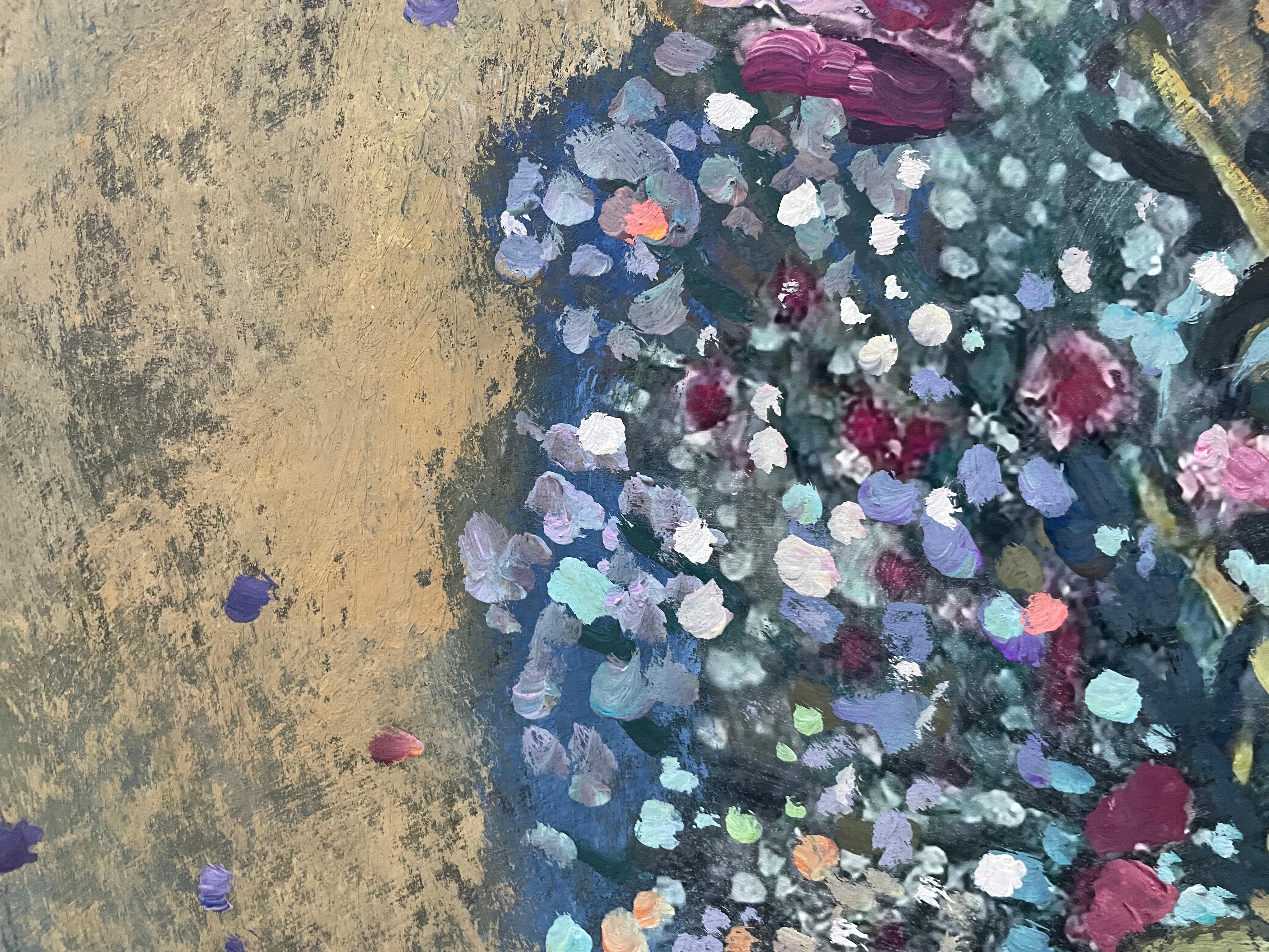 Cette œuvre d'art présente un bouquet de fleurs vibrant, méticuleusement rendu dans une riche tapisserie de couleurs et de textures. L'artiste utilise une technique d'empâtement auda...