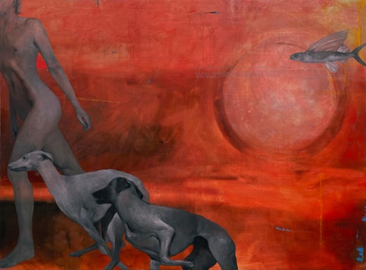 Grande peinture à l'huile figurative avec lévriers nus et paysage rouge surréaliste