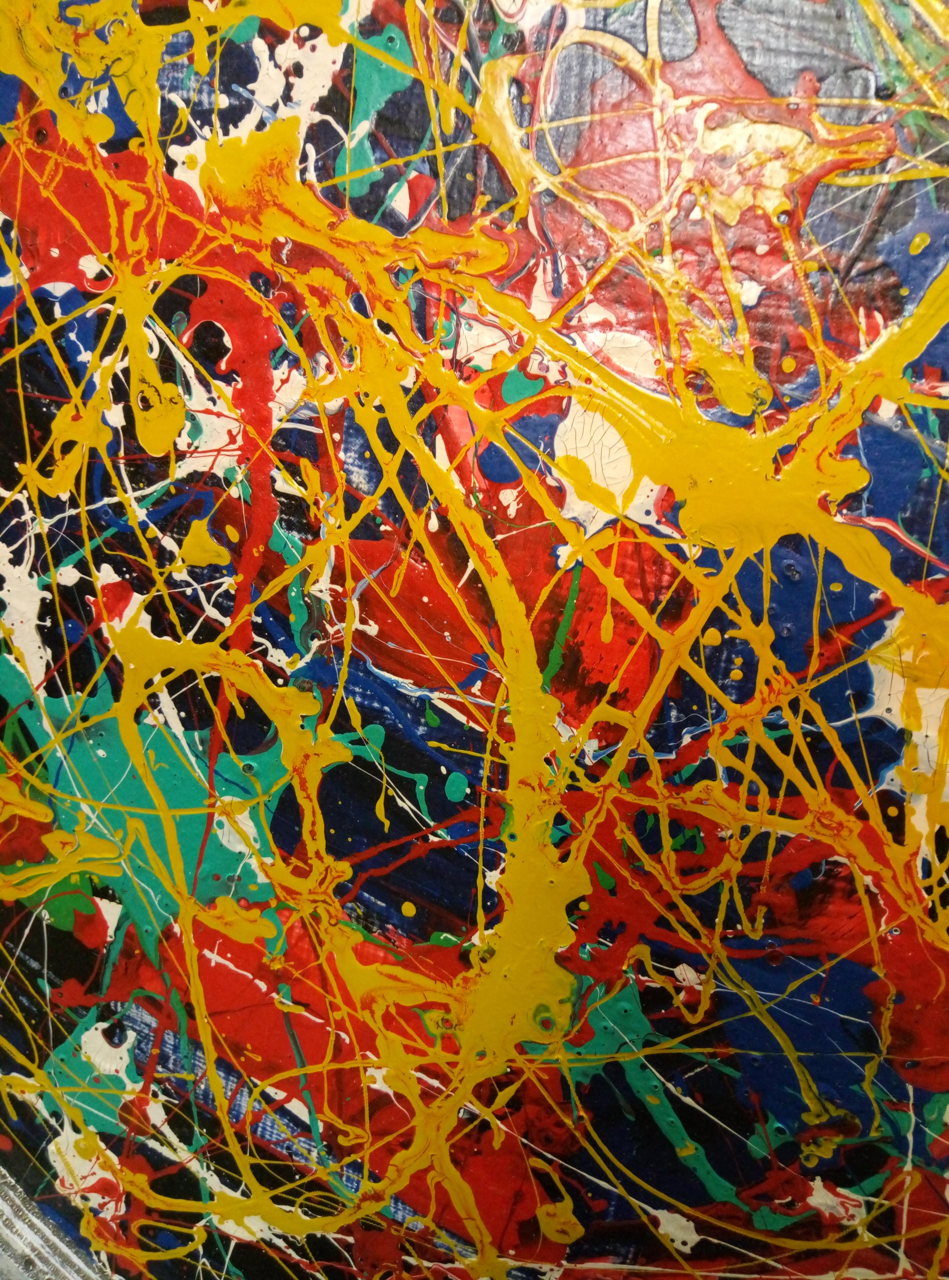 Peinture abstraite dans le style de J. Pollock par M&M. Je suis constamment à la recherche de techniques, de couleurs et de matériaux différents à expérimenter, et je m'efforce touj...