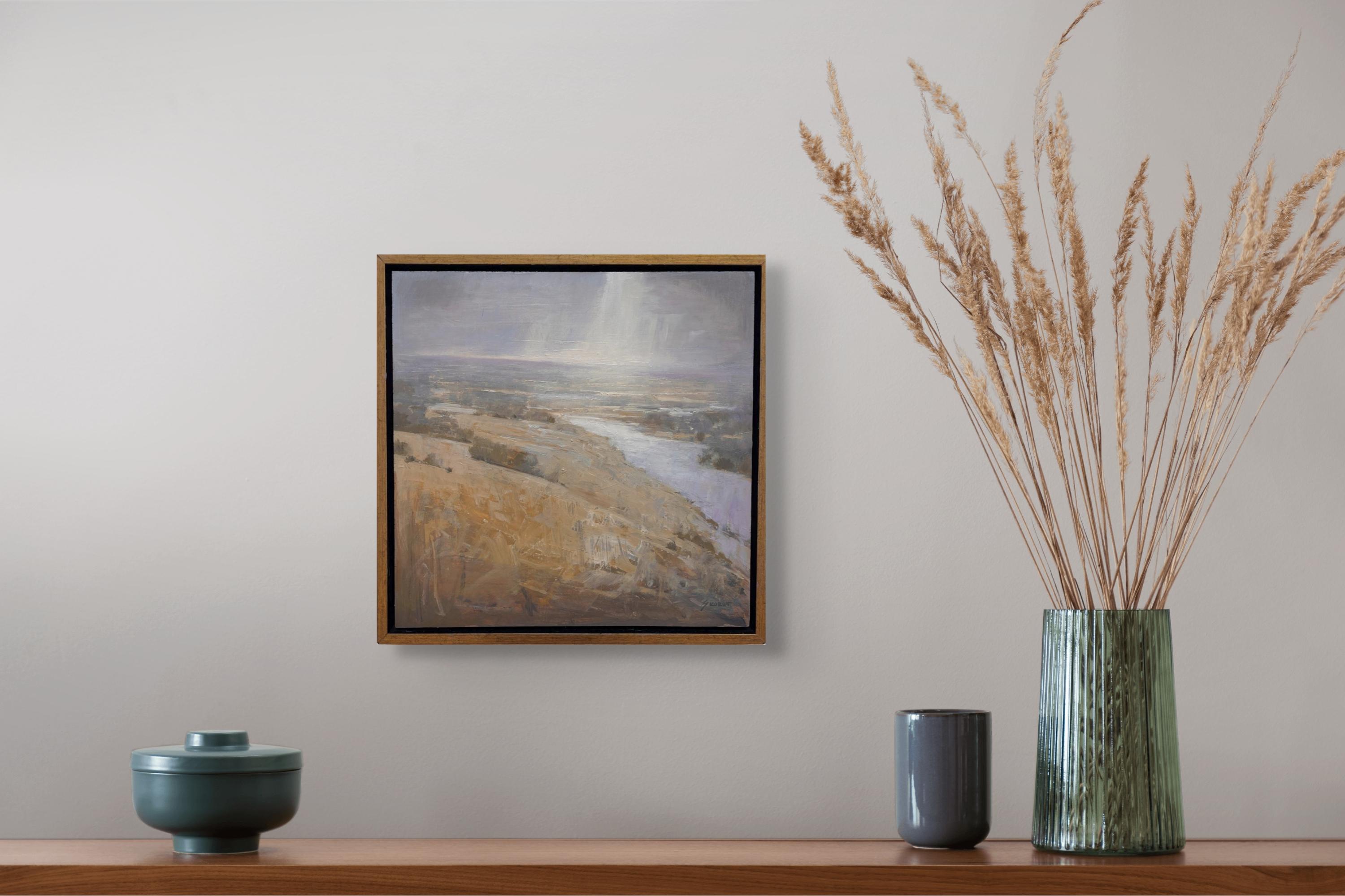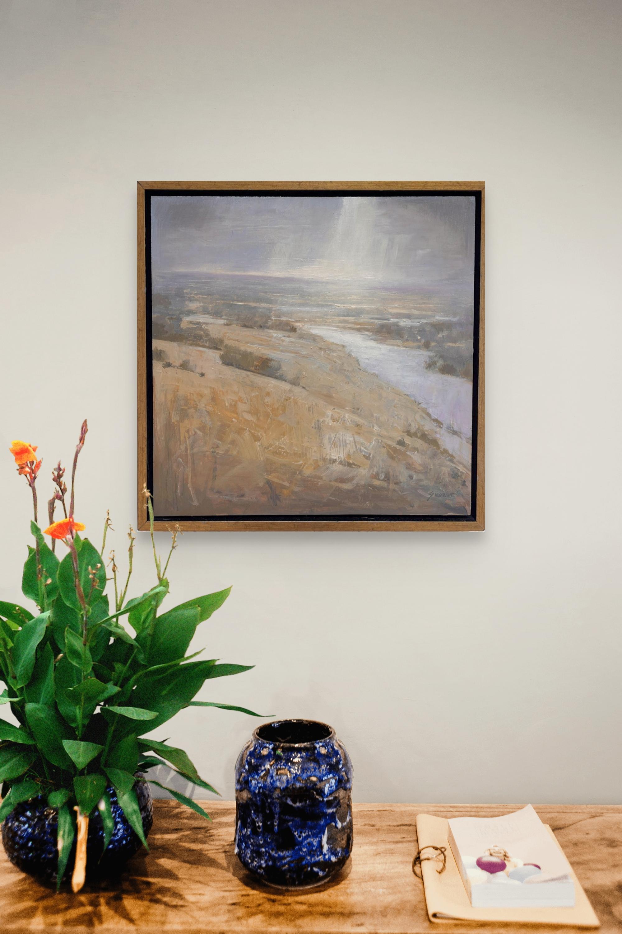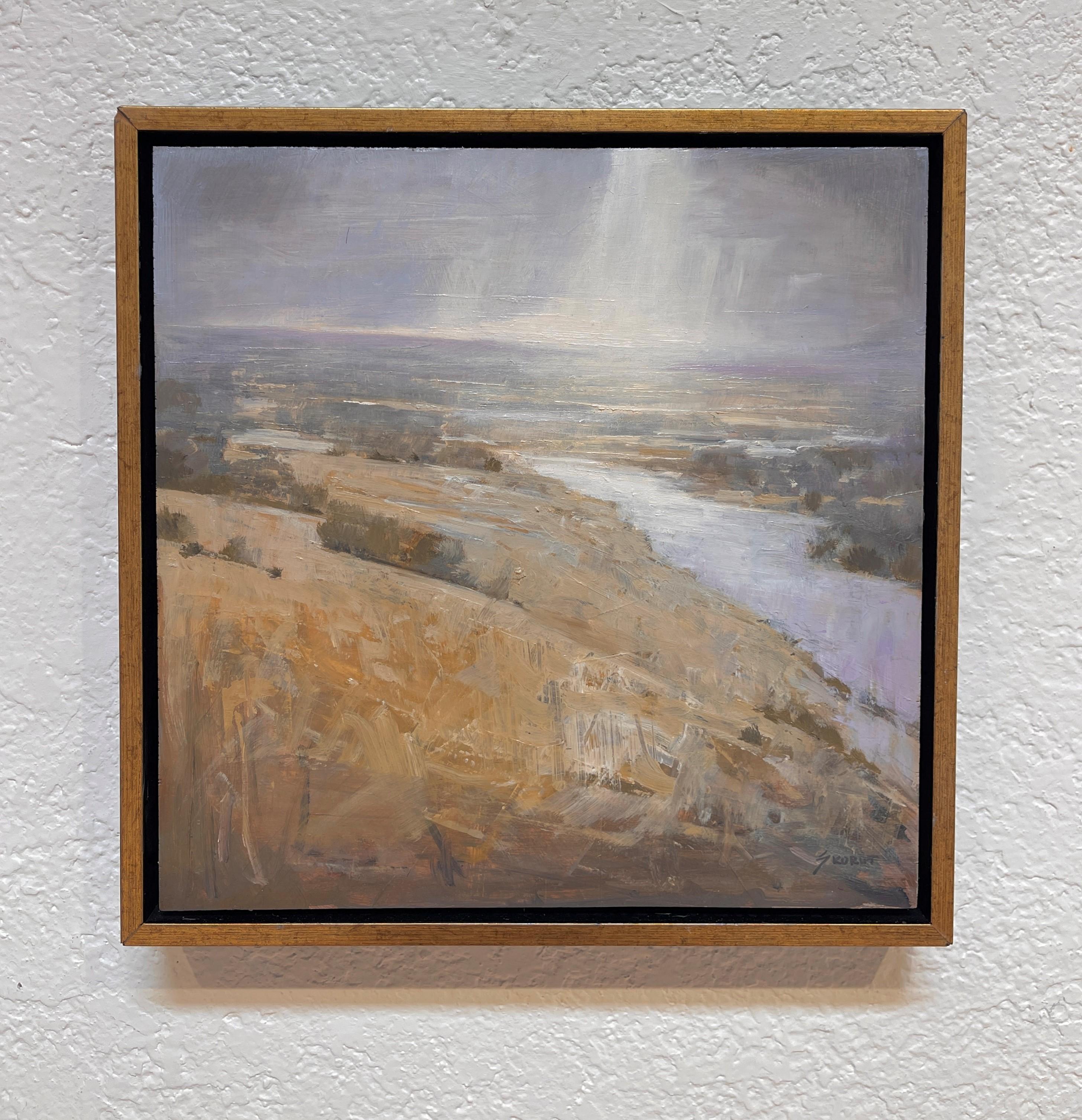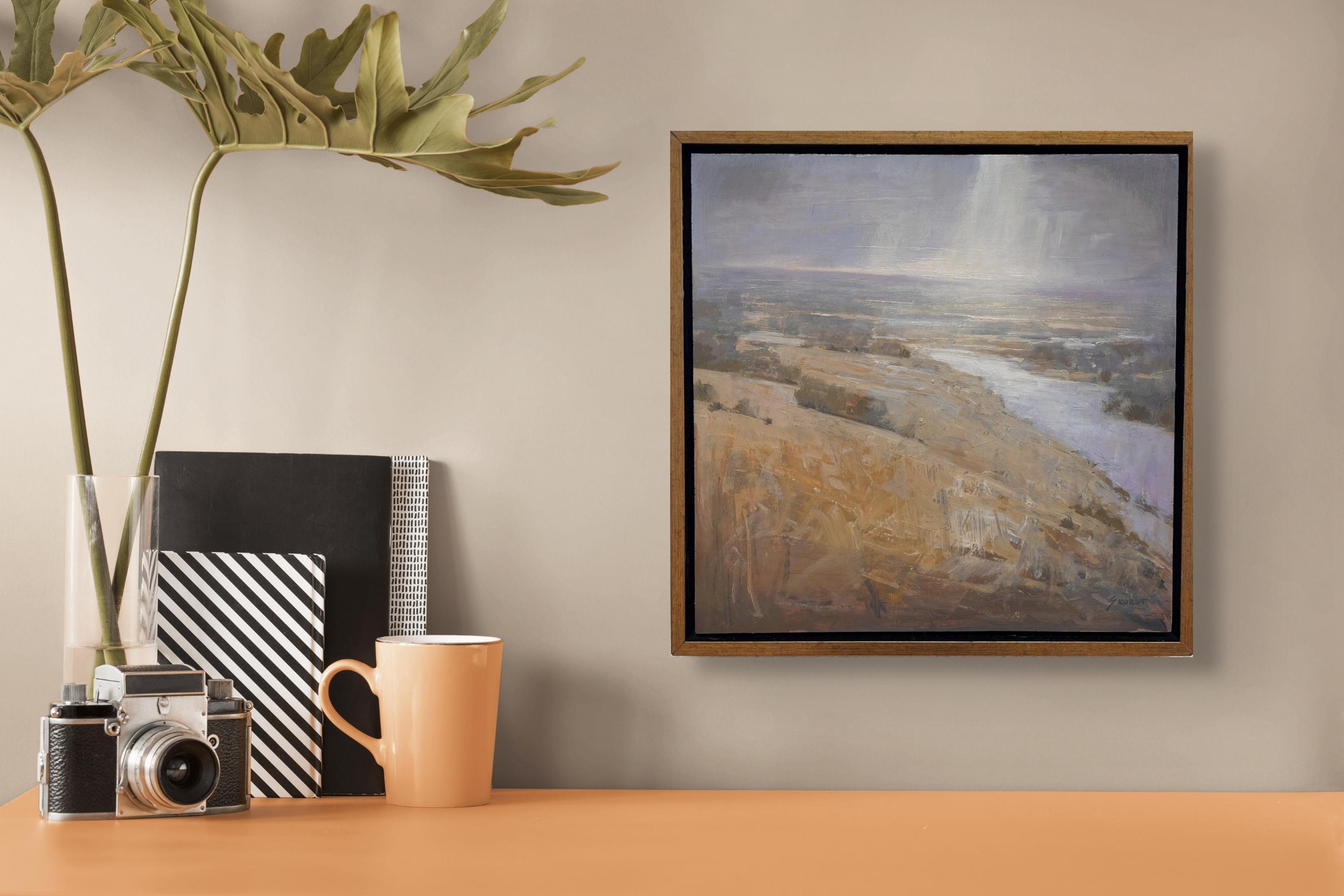 Bend of the River" d'Andrzej Skorut est une impressionnante peinture à l'huile de paysage de 12 x 12 pouces sur toile tendue, et encadrée de 13.5 x 13.5 pouces, prête à être accrochée.