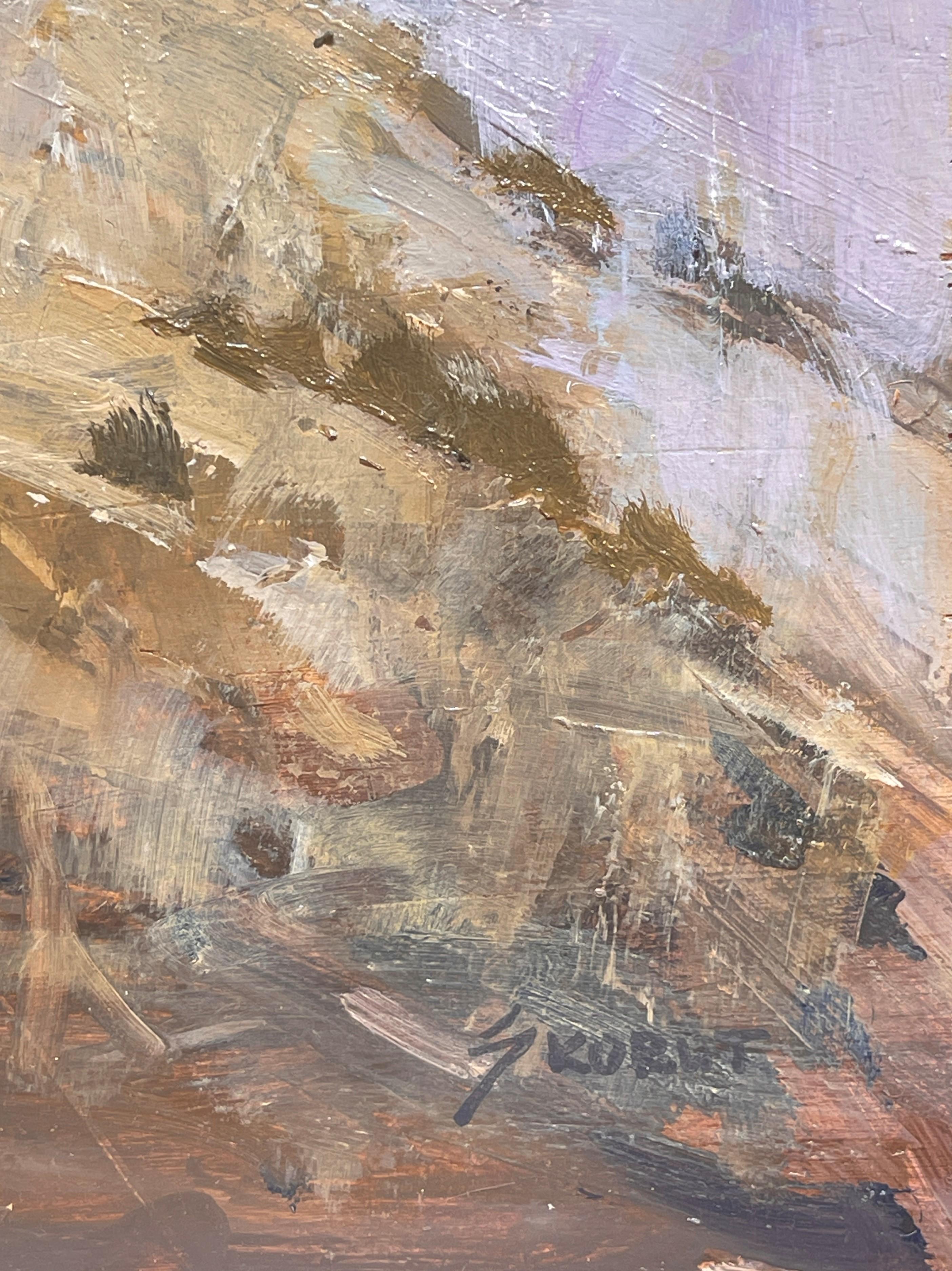 Last Light" d'Andrzej Skorut est une peinture à l'huile qui représente des nuages se profilant au-dessus de vastes plaines avec des montagnes lointaines à l'arrière-plan. Cette œuvre...