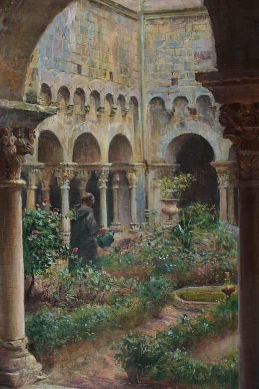 Peinture impressionniste française à l'huile sur toile, dans un jardin de monastère