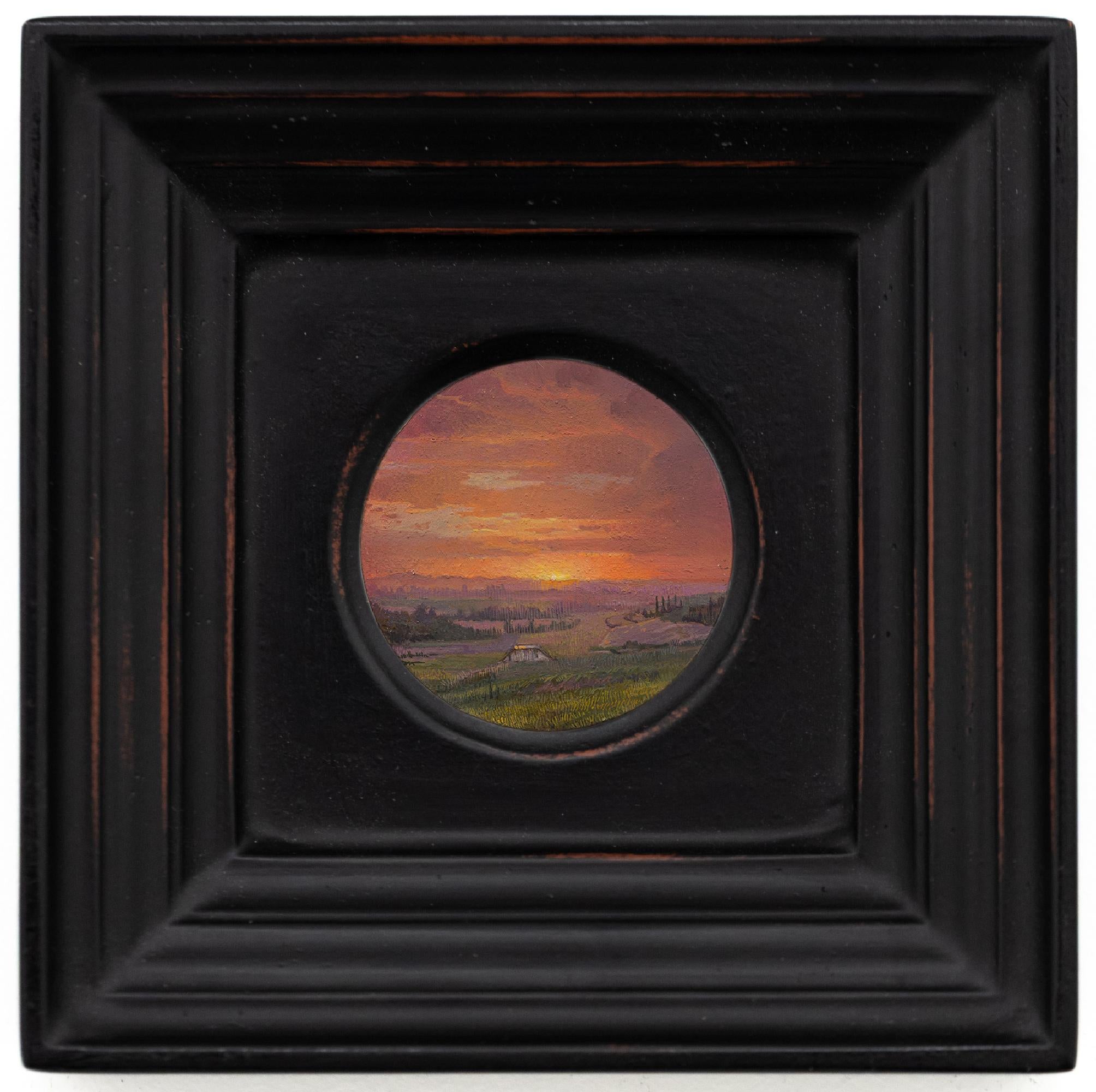 Cette œuvre, intitulée "Coucher de soleil en Toscane", est une peinture à l'huile sur cuivre originale de Dina Brodsky, peinte par l'artiste en Italie. La peinture miniature elle-même mesure 2,5" de diamètre sans cadre, ou 7,5 "h x 7,5 "w x 1,75 "d encadré.
