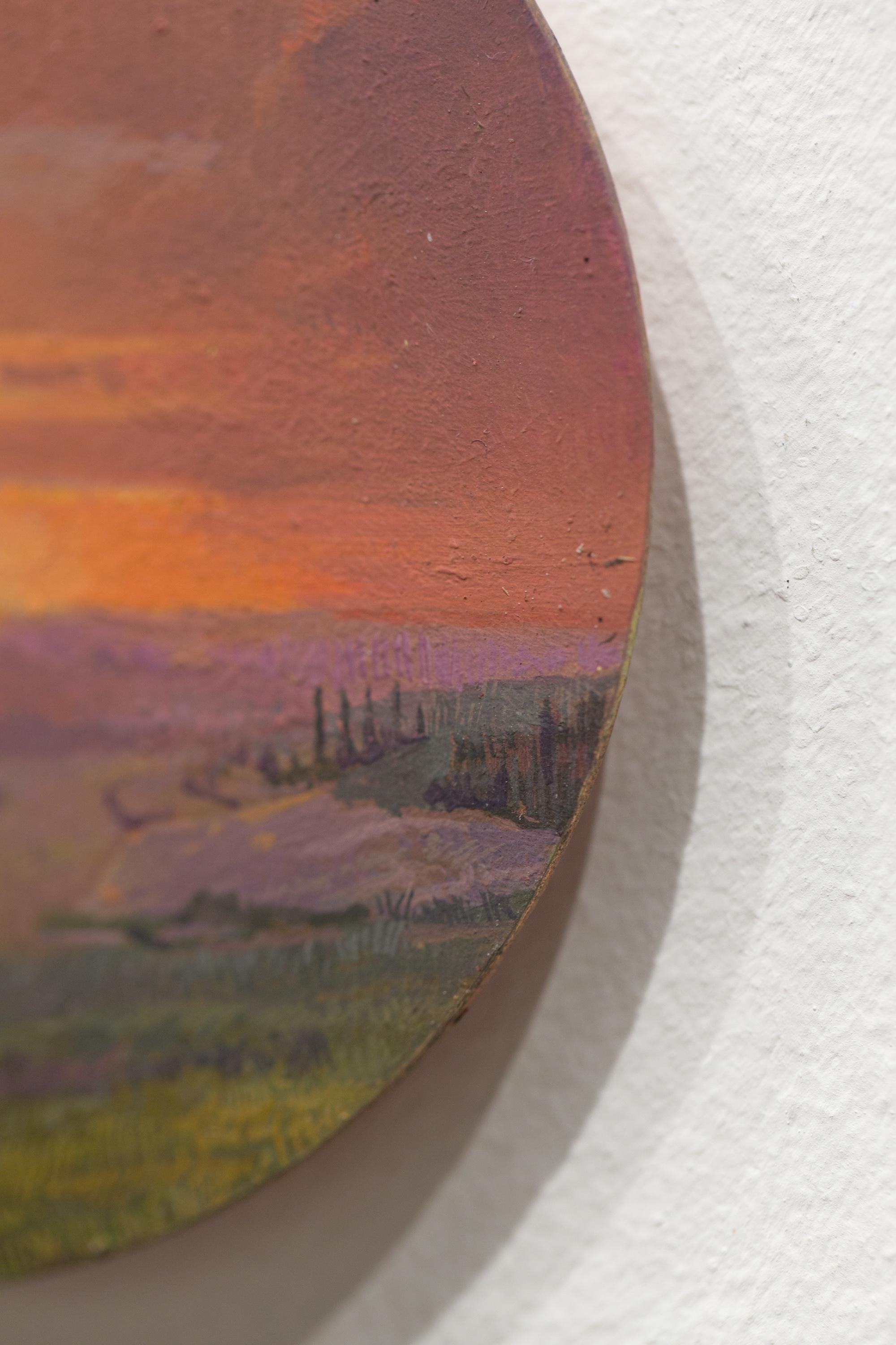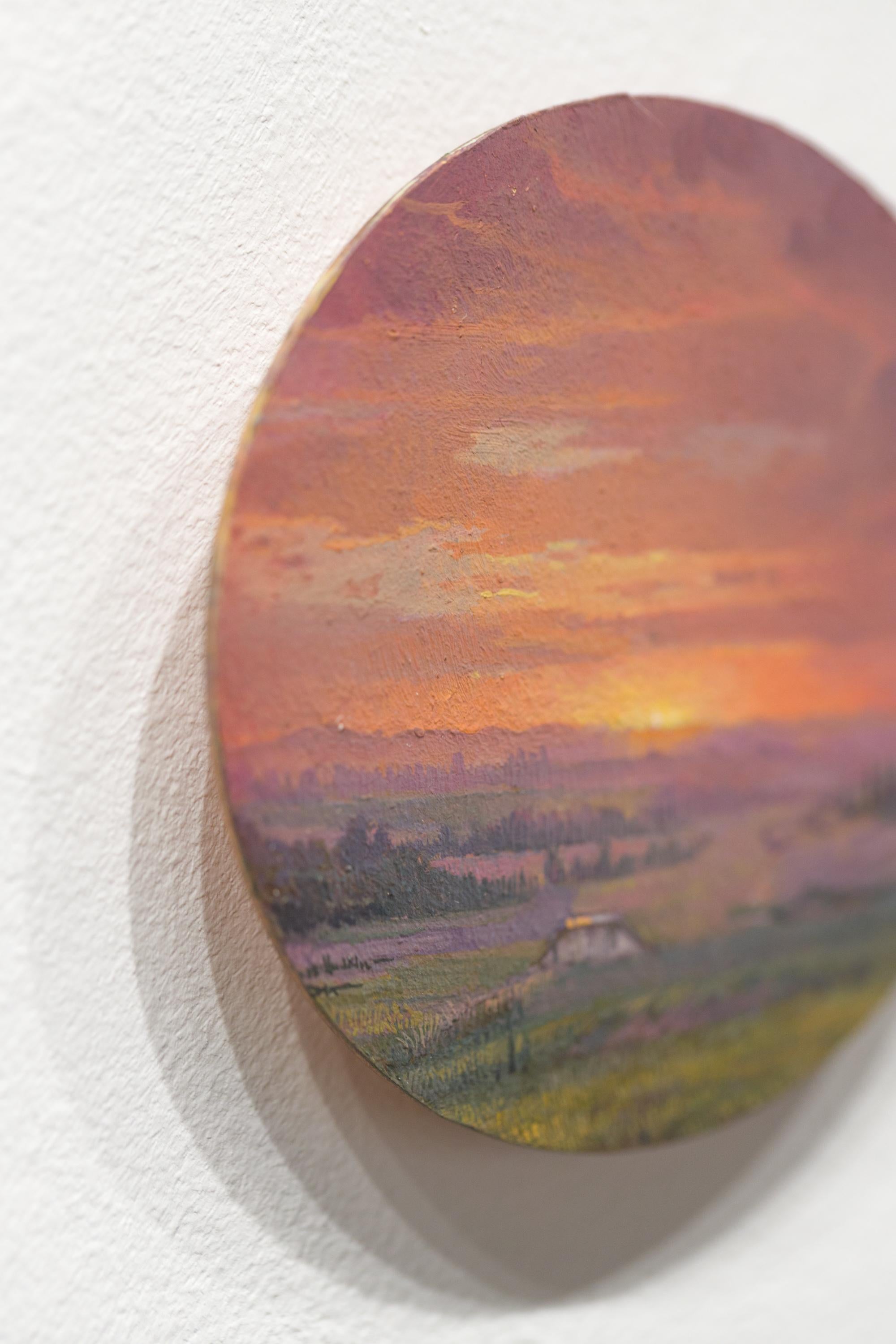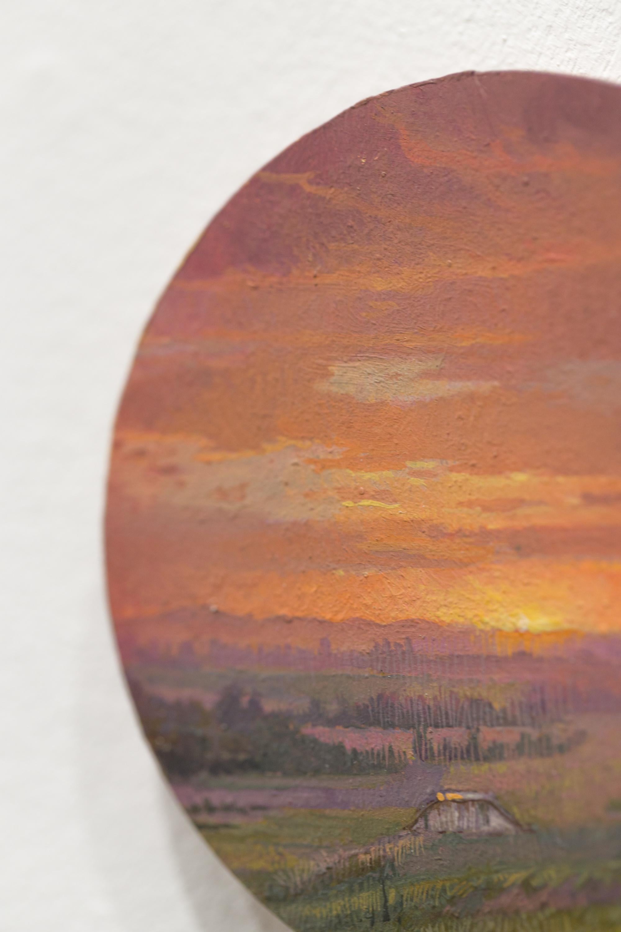 Near Dusk - Peinture circulaire d'un ciel rose sur champ, peinture à l'huile originale