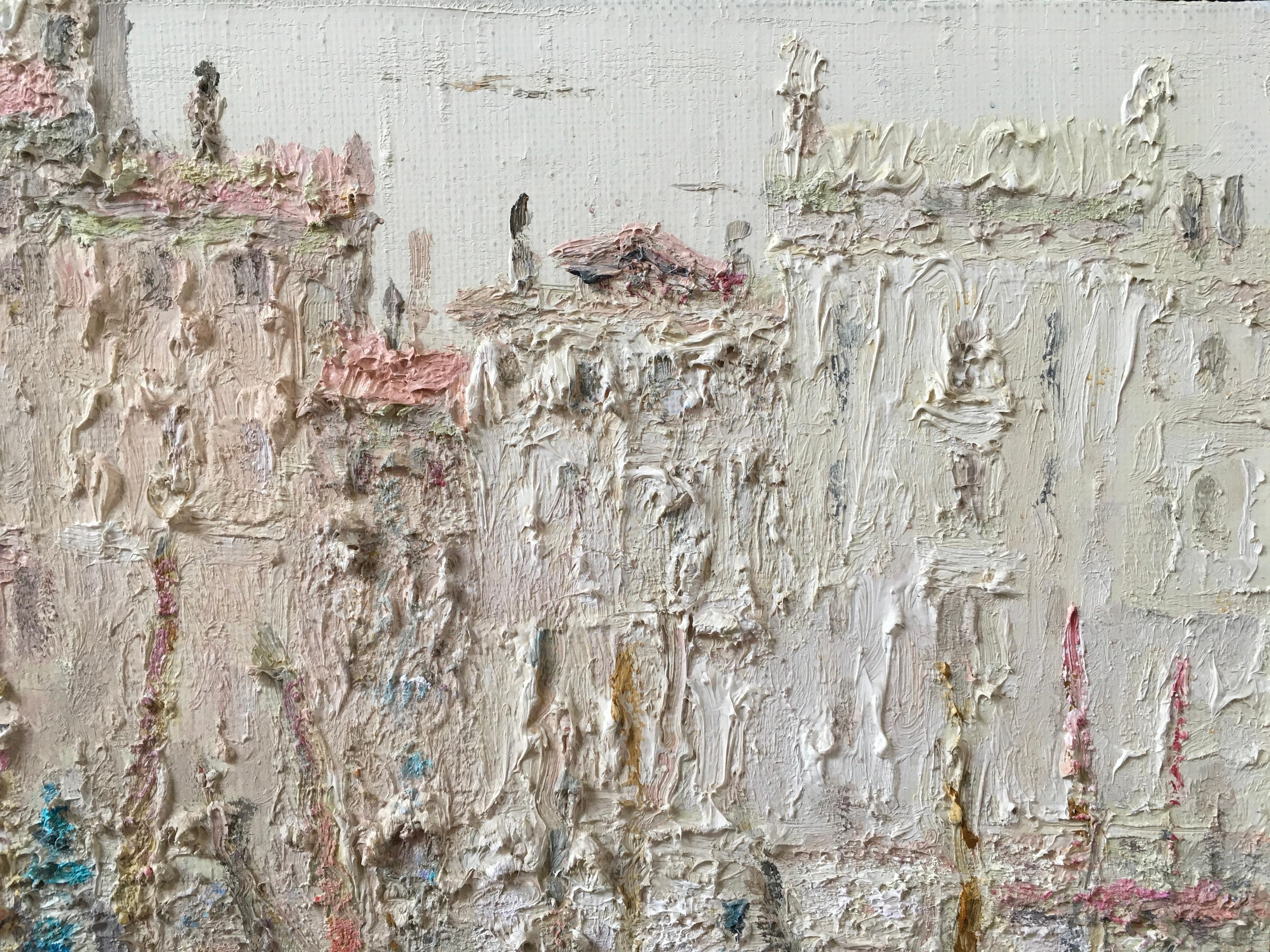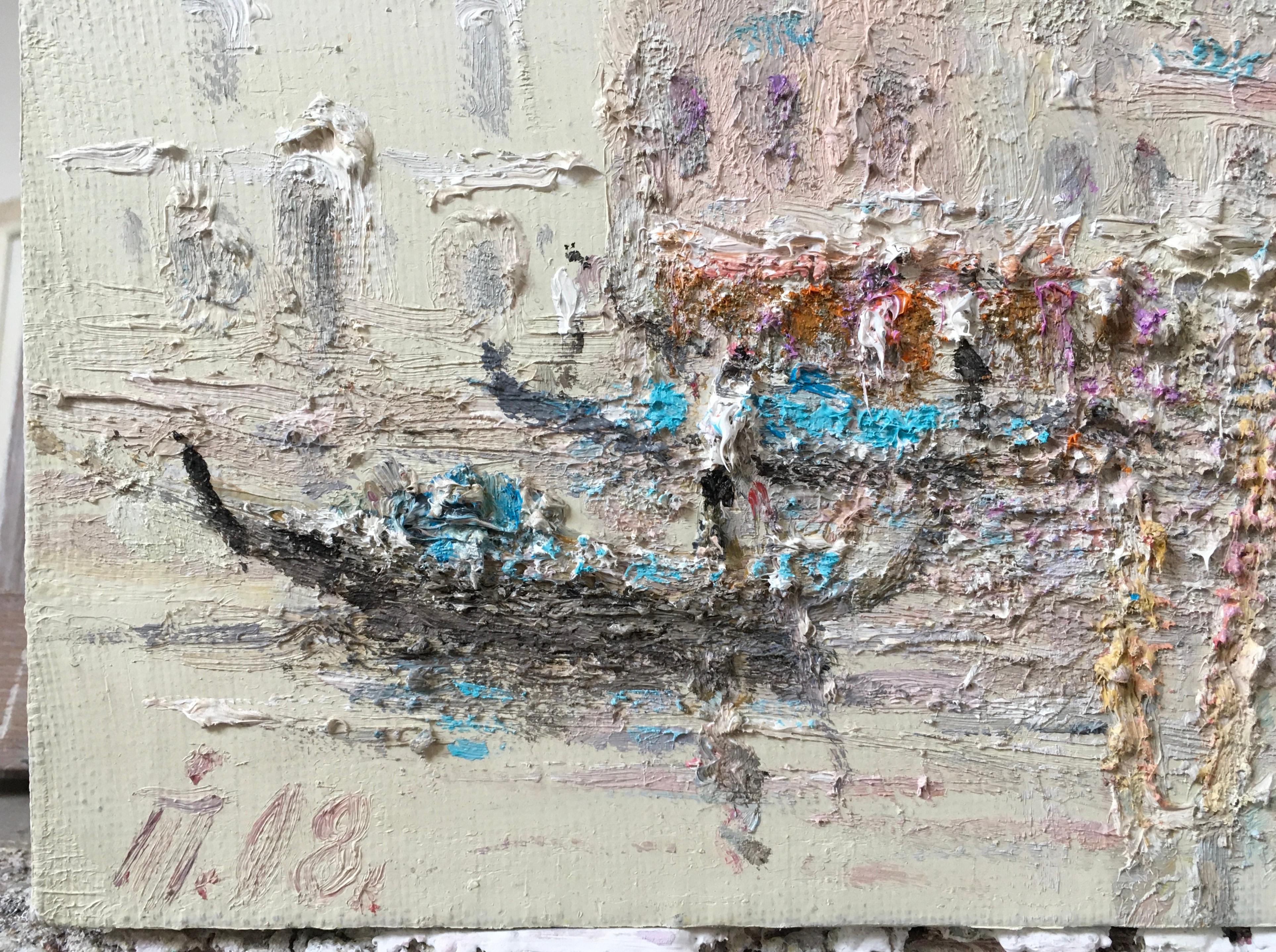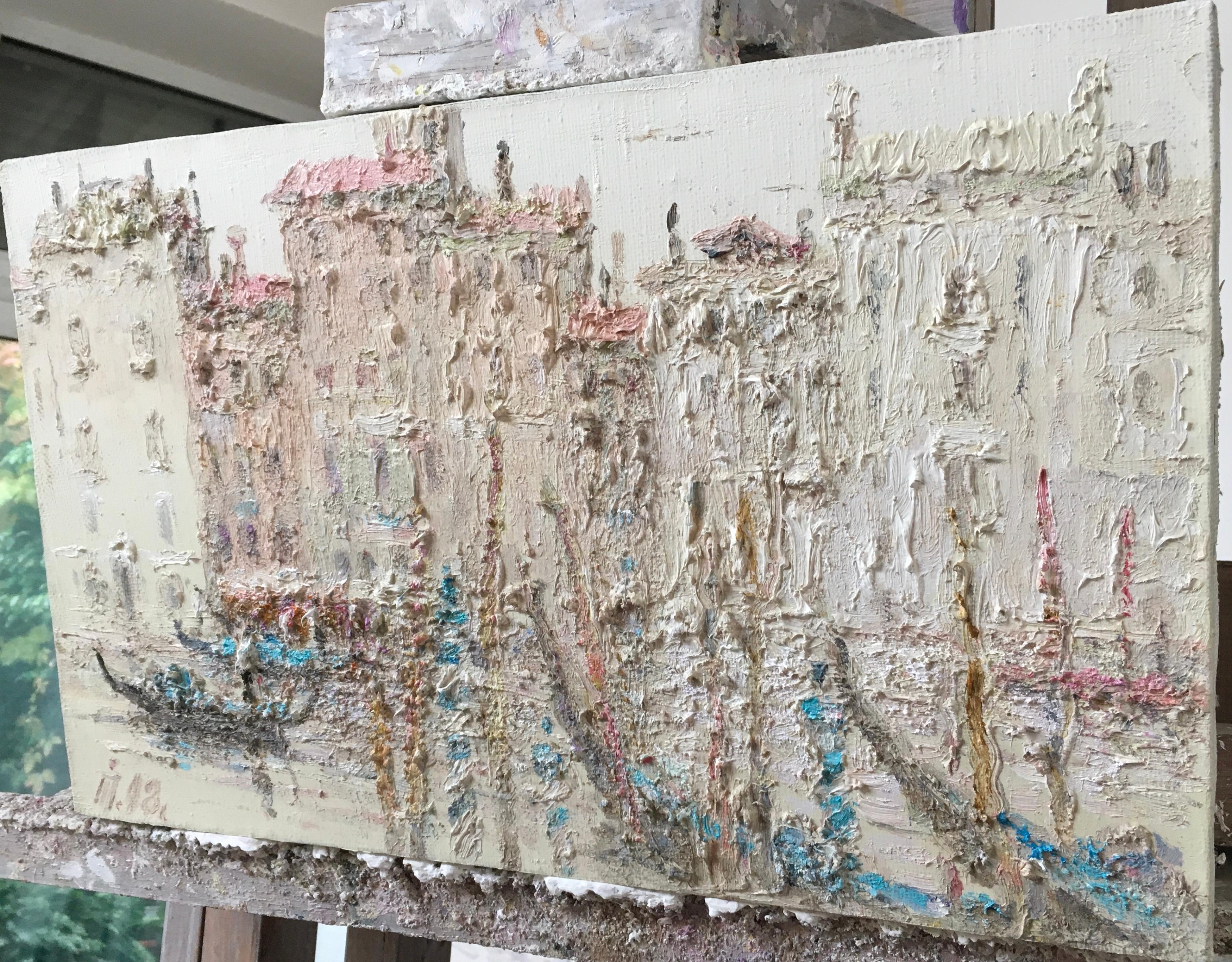 The painting depicts a picturesque scene with gondolas on a canal in Venice. The artist used an impasto technique: thick strokes of paint create a relief, almost sculptural surface of the canvas. Thanks to this, the architecture and water seem to merge into a single soft texture.