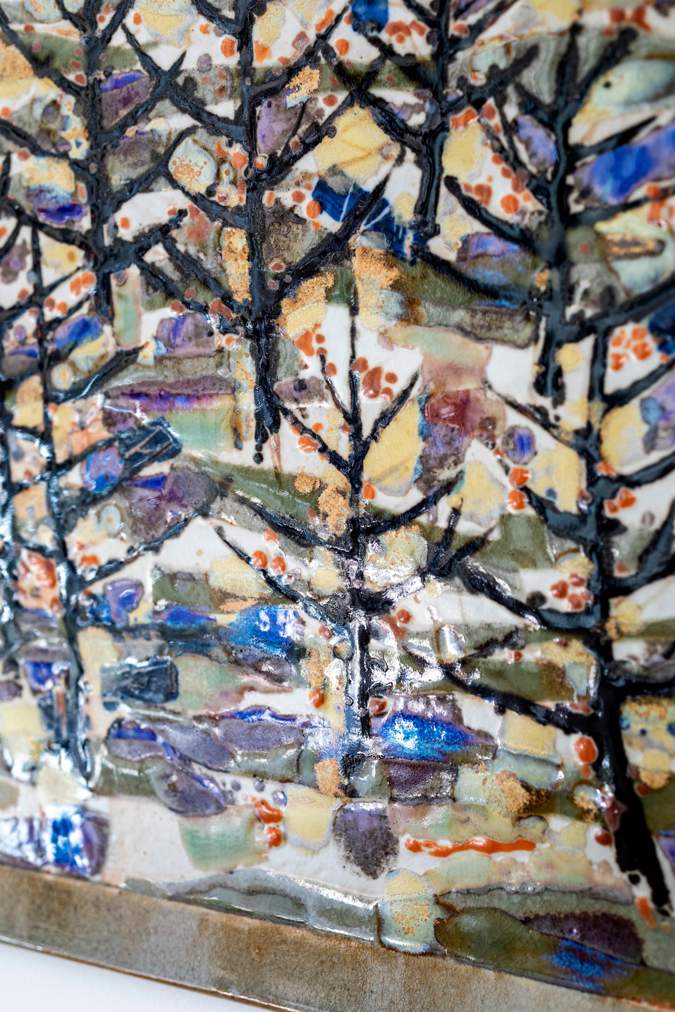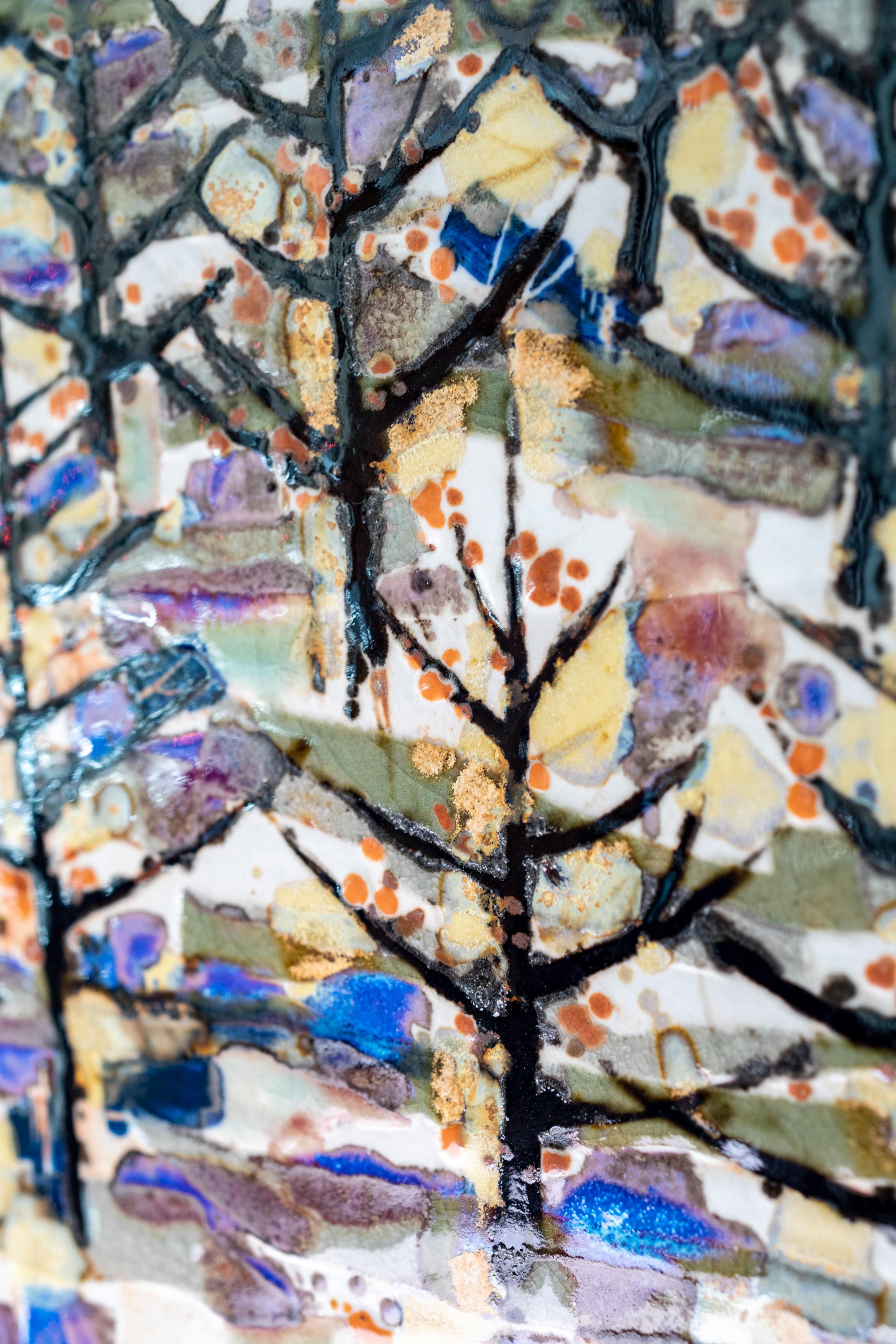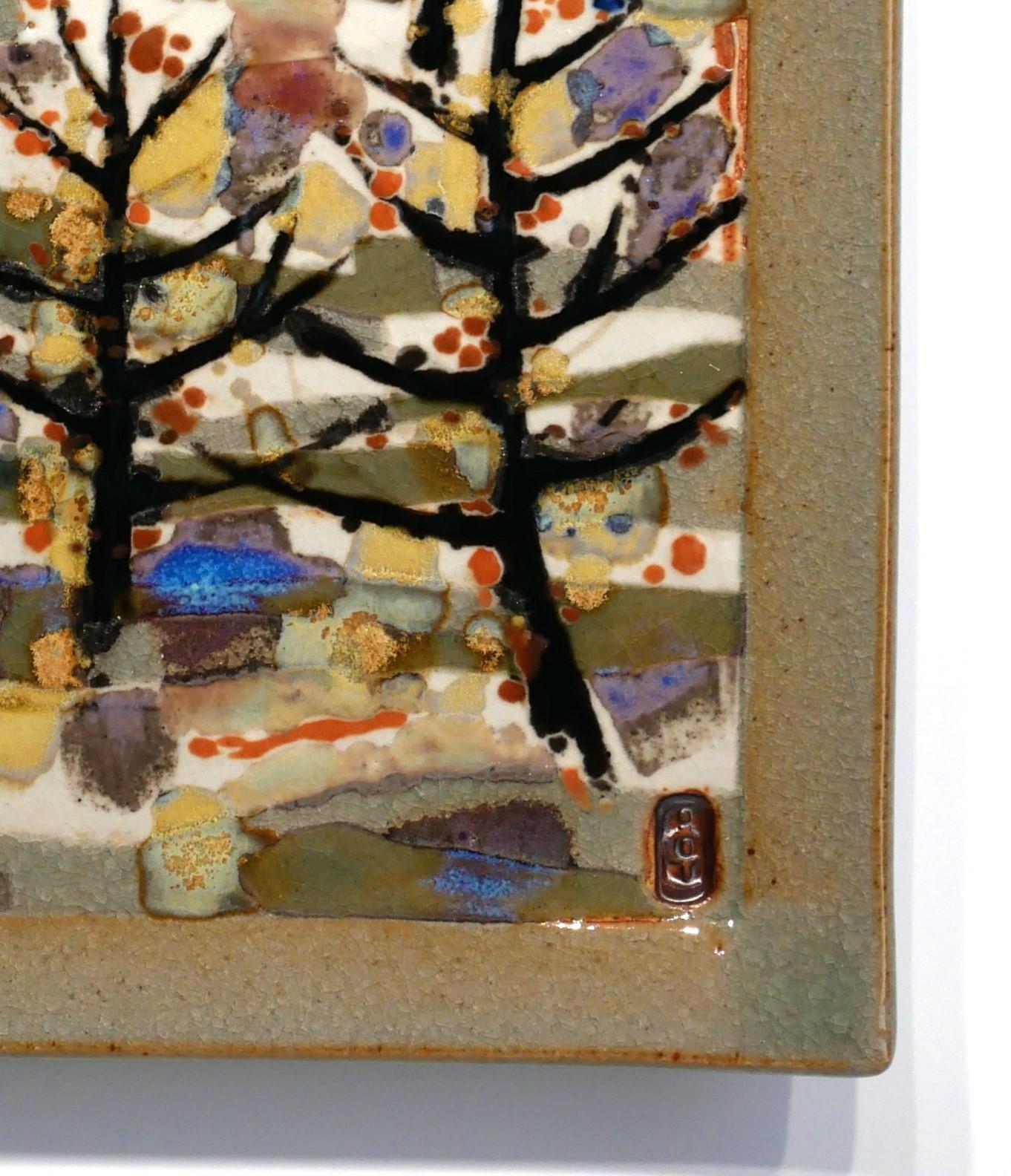 Cette œuvre en grès émaillé est une évocation poétique d'un paysage cher à Jean-Claude Lande, inspirée par un souvenir des terres provençales près du Mont Ventoux. Les silhouettes des arbres, semblables à des traits de calligraphie, immortalisent un moment suspendu.