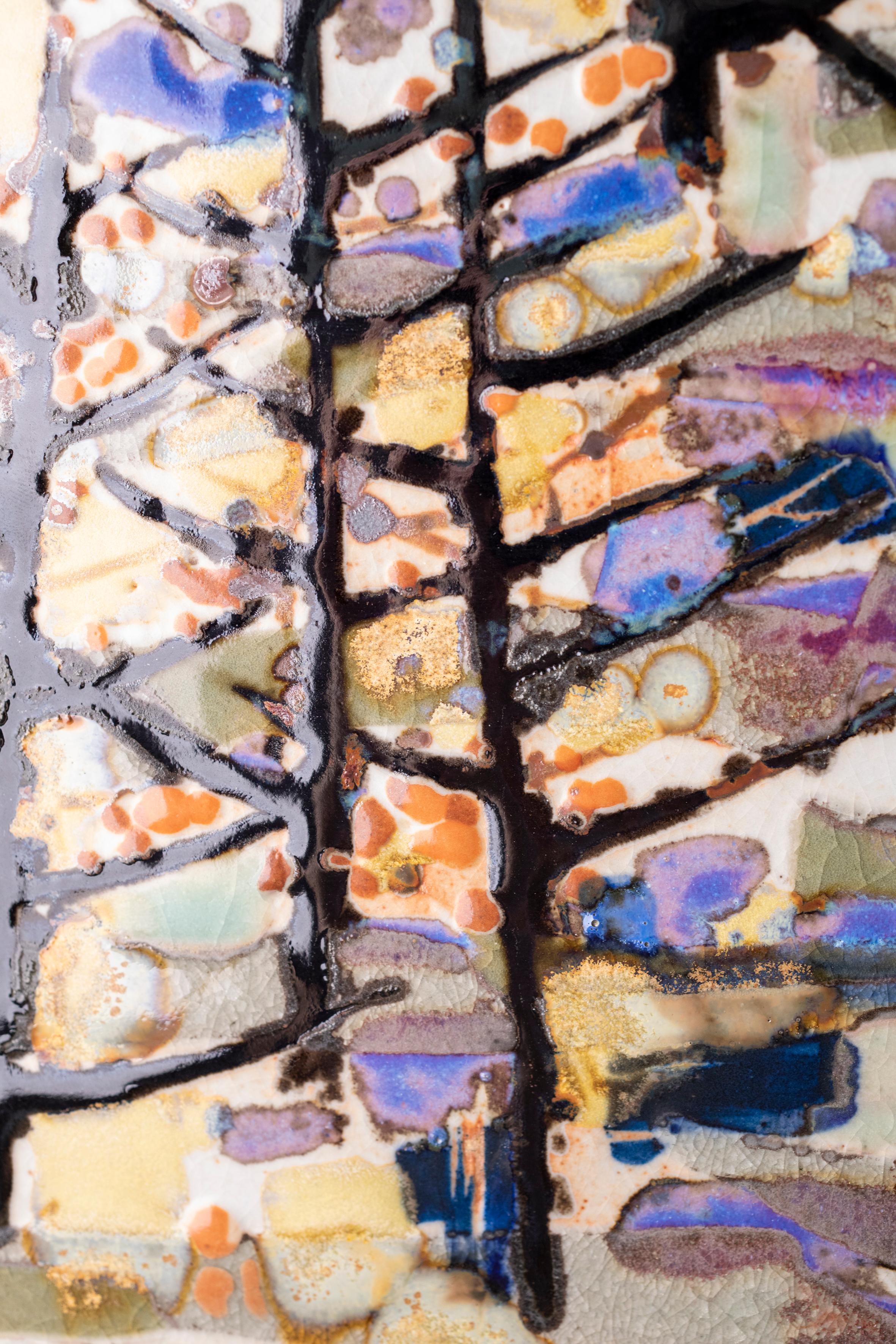 Ce tableau en grès émaillé est un très long travail de préparation, à la fois pour la conception et la création de la forme mais surtout pour la composition des émaux, car toute cette composition d'émaux est cuite en un seul coup. C'est un travail très difficile que de réussir ce type de travail. Jean-Claude Canonne est par ailleurs reconnu par la profession de céramiste pour sa maîtrise exceptionnelle des émaux.