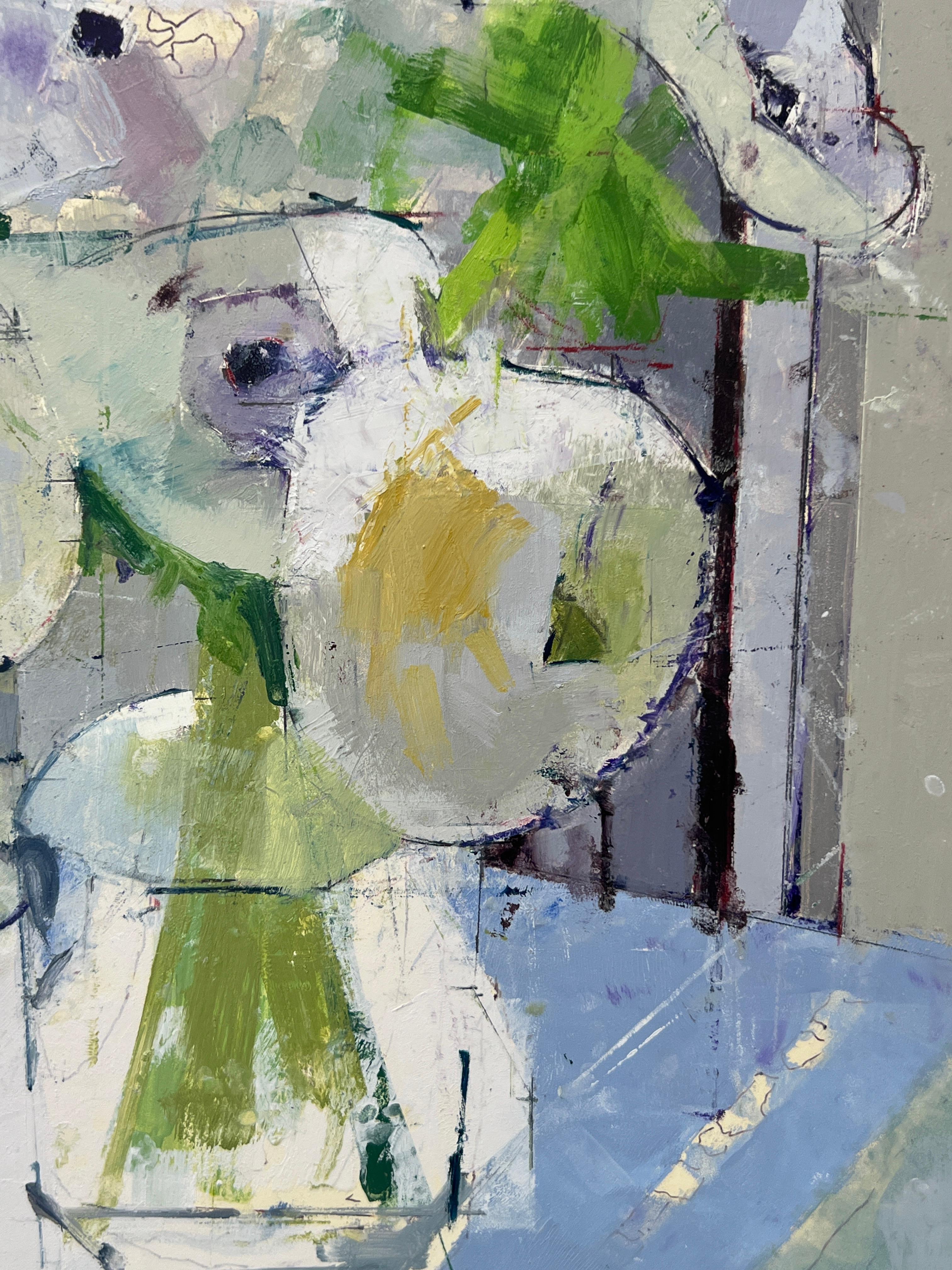 Impasto bouquet de roses, pivoines et lys. "Je voulais peindre un vase de fleurs de rêve avec beaucoup de blanc", explique Judy Mackey. "Le titre vi...