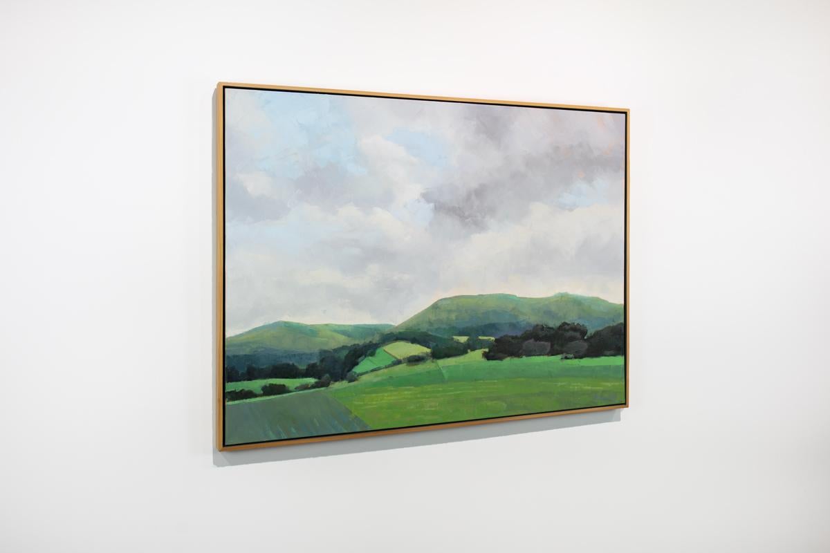 Ce paysage traditionnel peint par Molly Doe Wensberg présente une palette chaude, capturant une scène de collines ondulantes d'un jaune luxuriant et de taches d'arbres d'un vert prof...