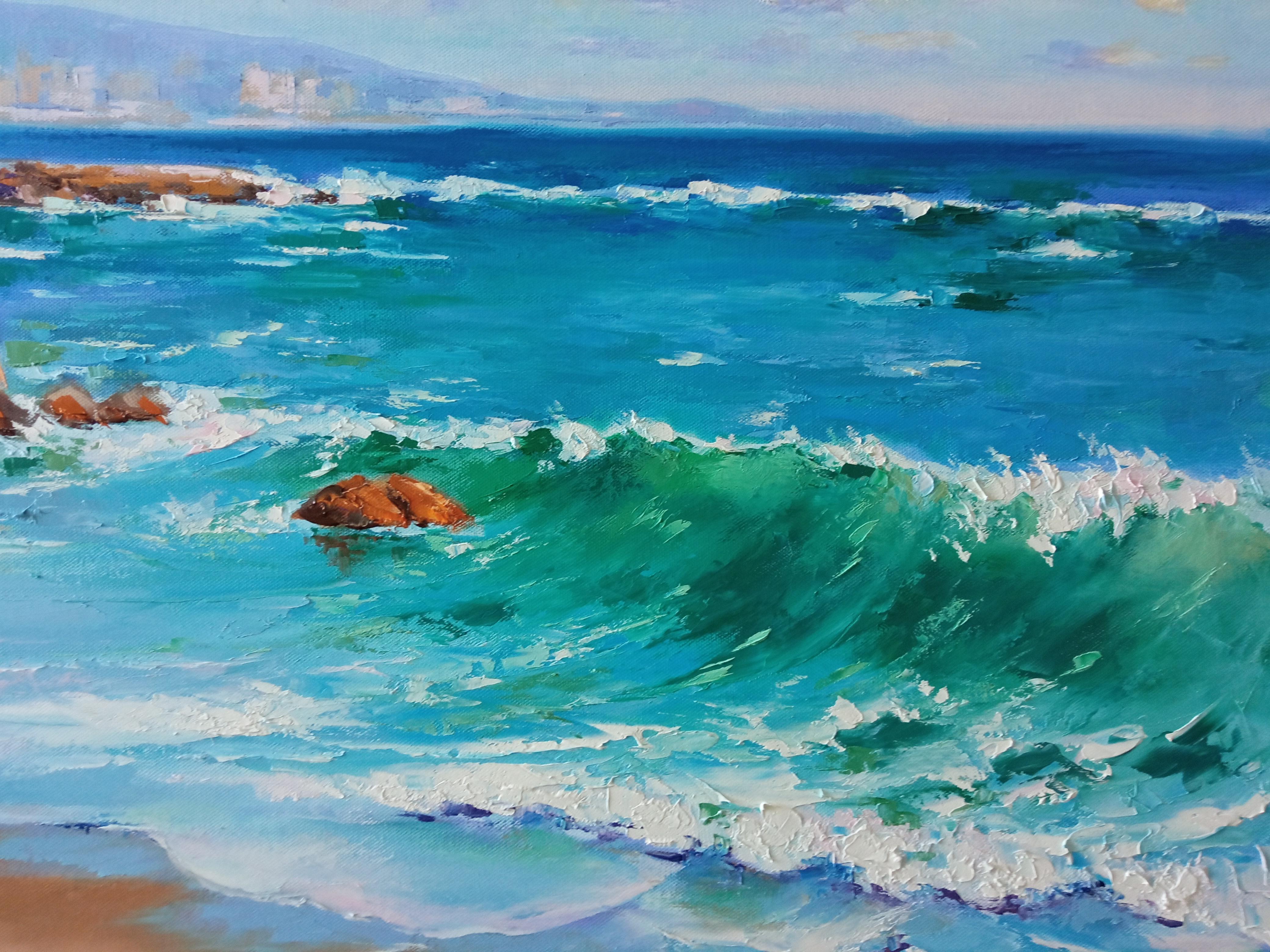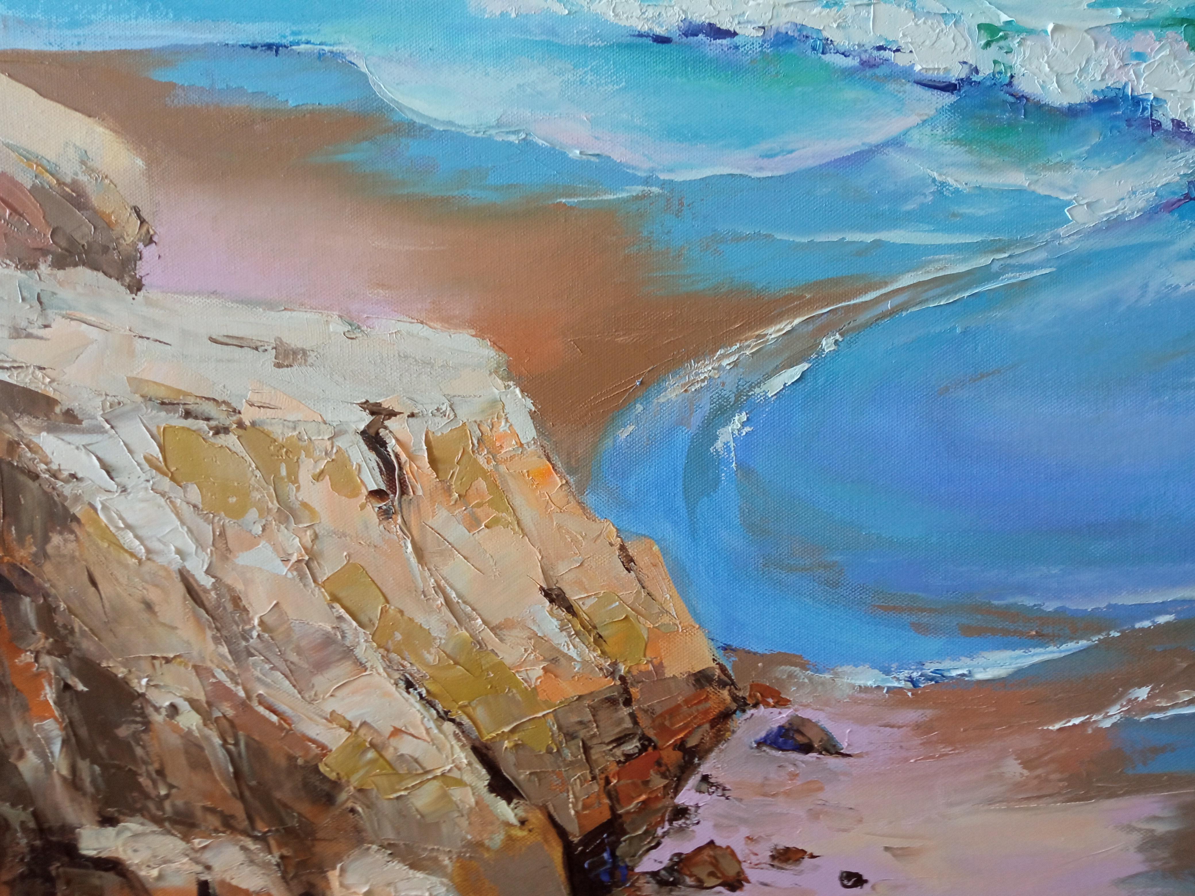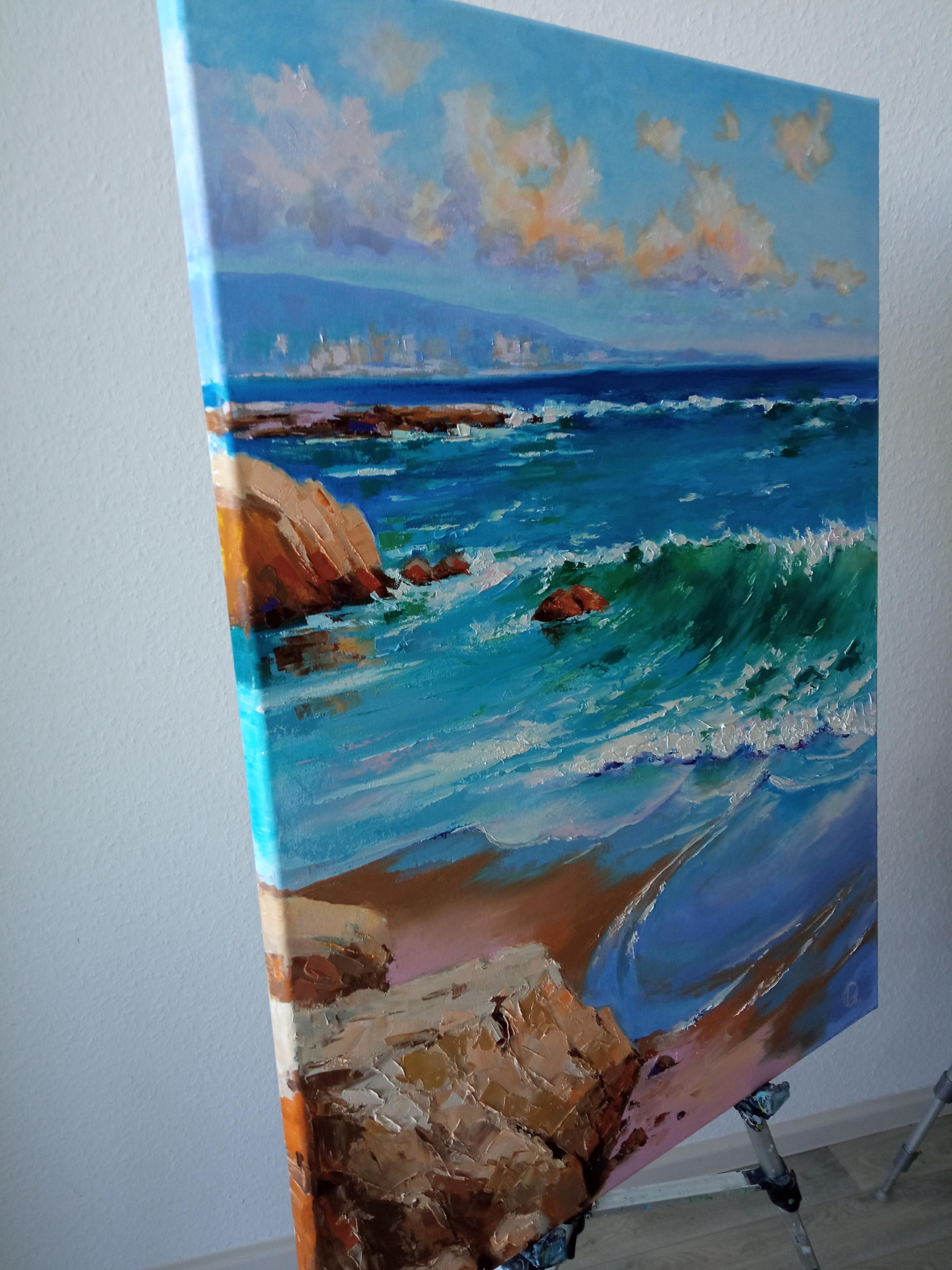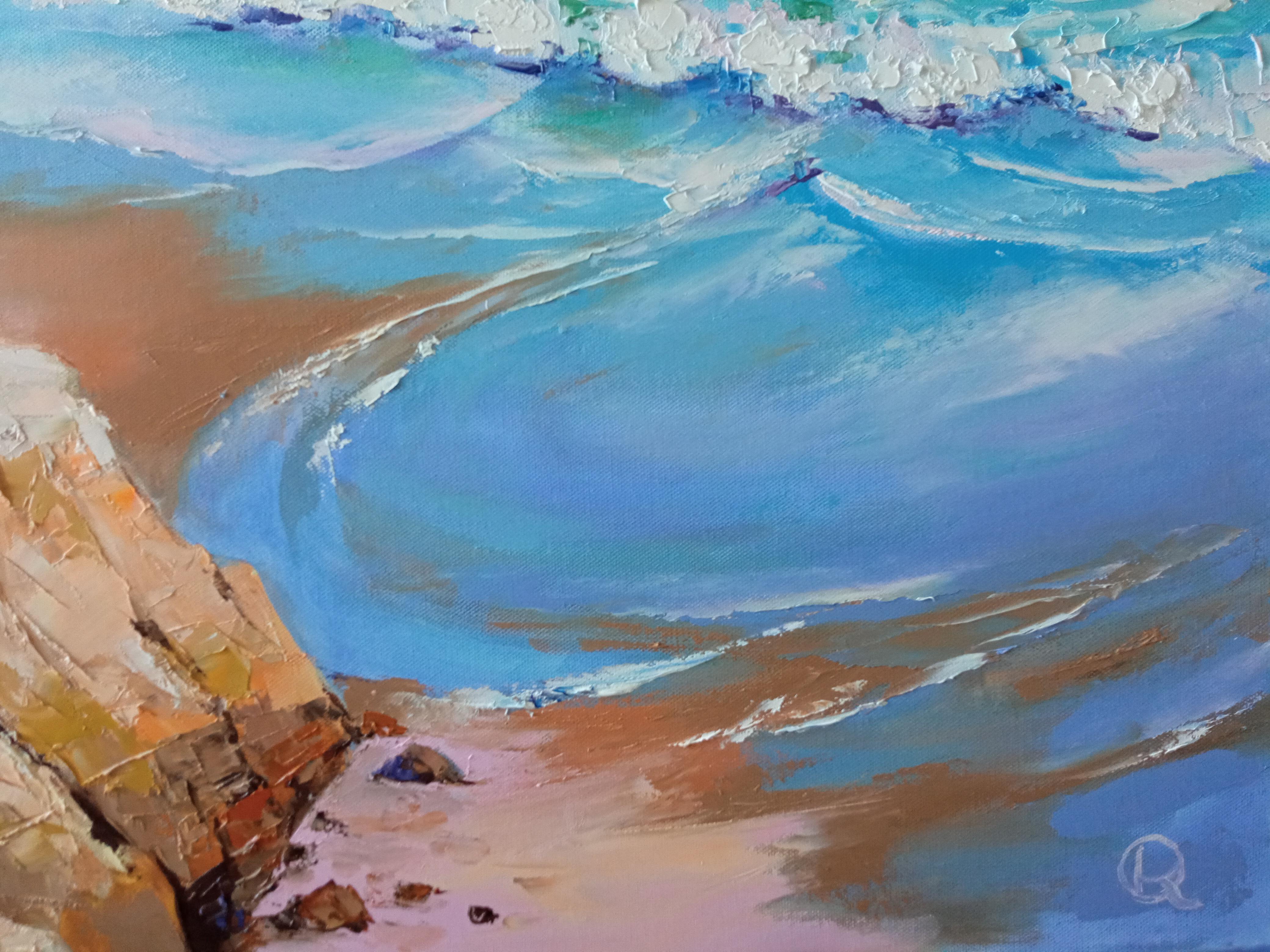 Cette peinture capture le souffle de la liberté et de la tranquillité. L'artiste transmet l'énergie vivante des vagues de la mer - leur transparence et leur mouvement éternel. La lumière du soleil danse sur la surface, révélant une riche palette de nuances allant du turquoise profond au rose tendre et aux teintes dorées.