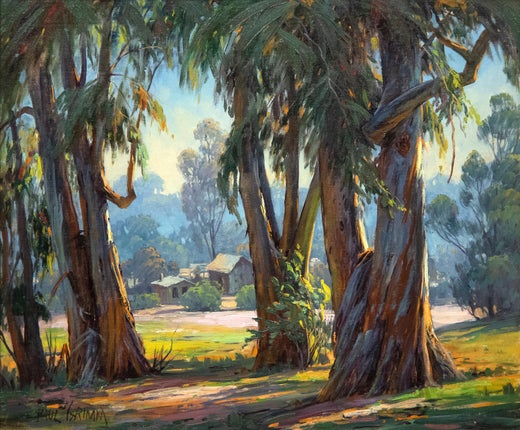 Une peinture de Paul Grimm. "Stately Eucalypti" est une peinture de paysage, huile sur carton dans une palette de tons terreux, réalisée par l'artiste Paul Grimm. L'œuvre est signée ...