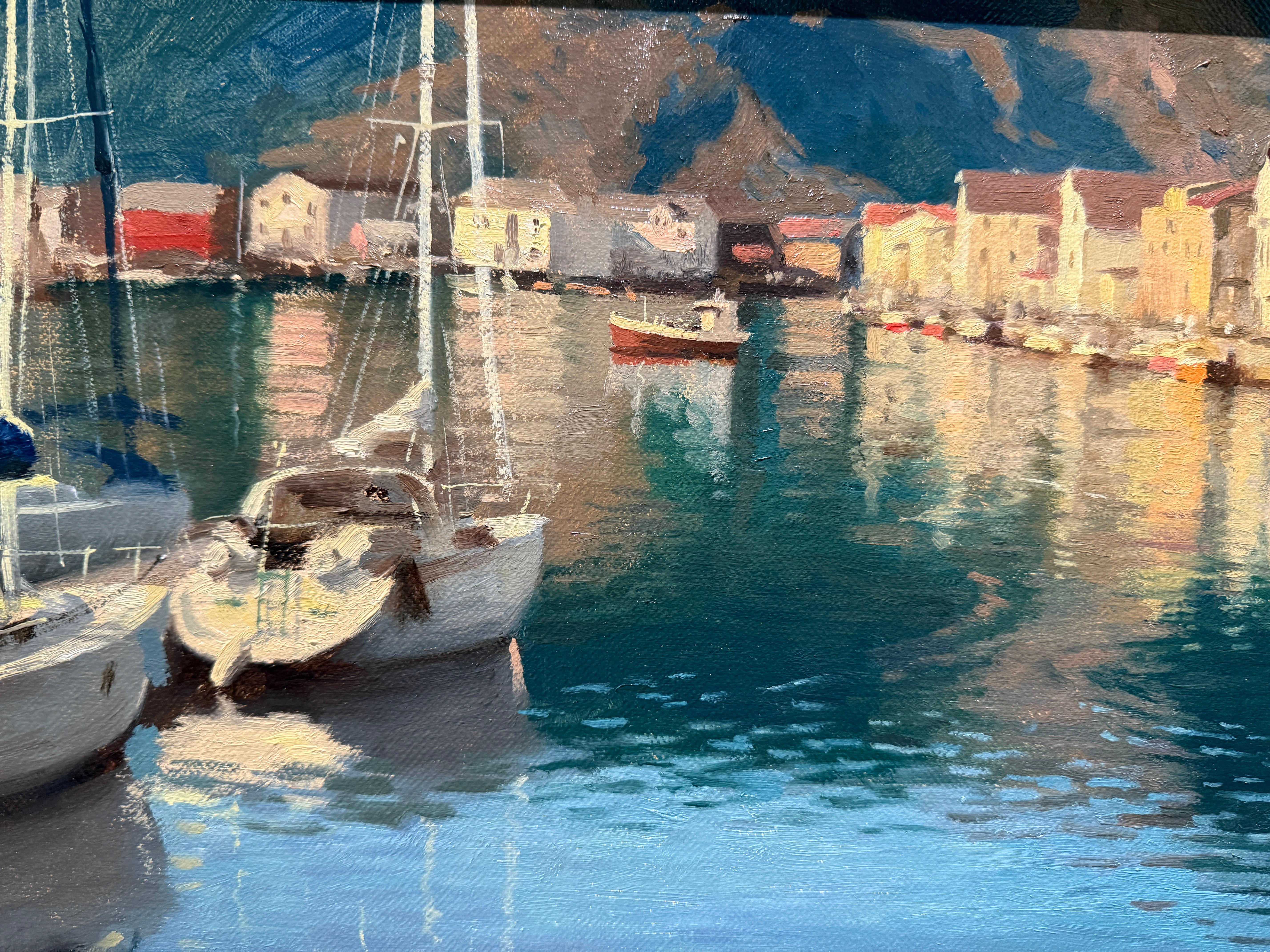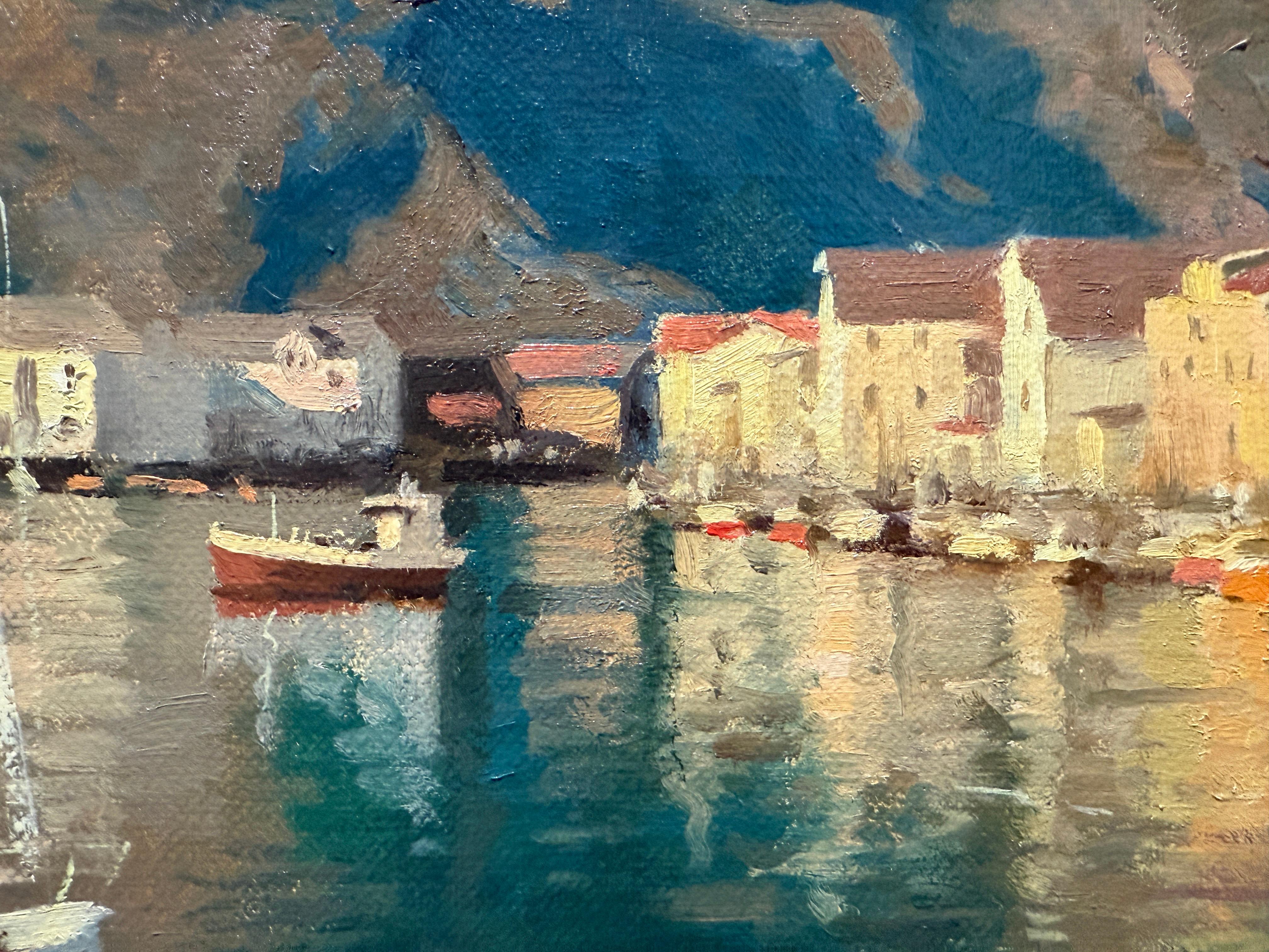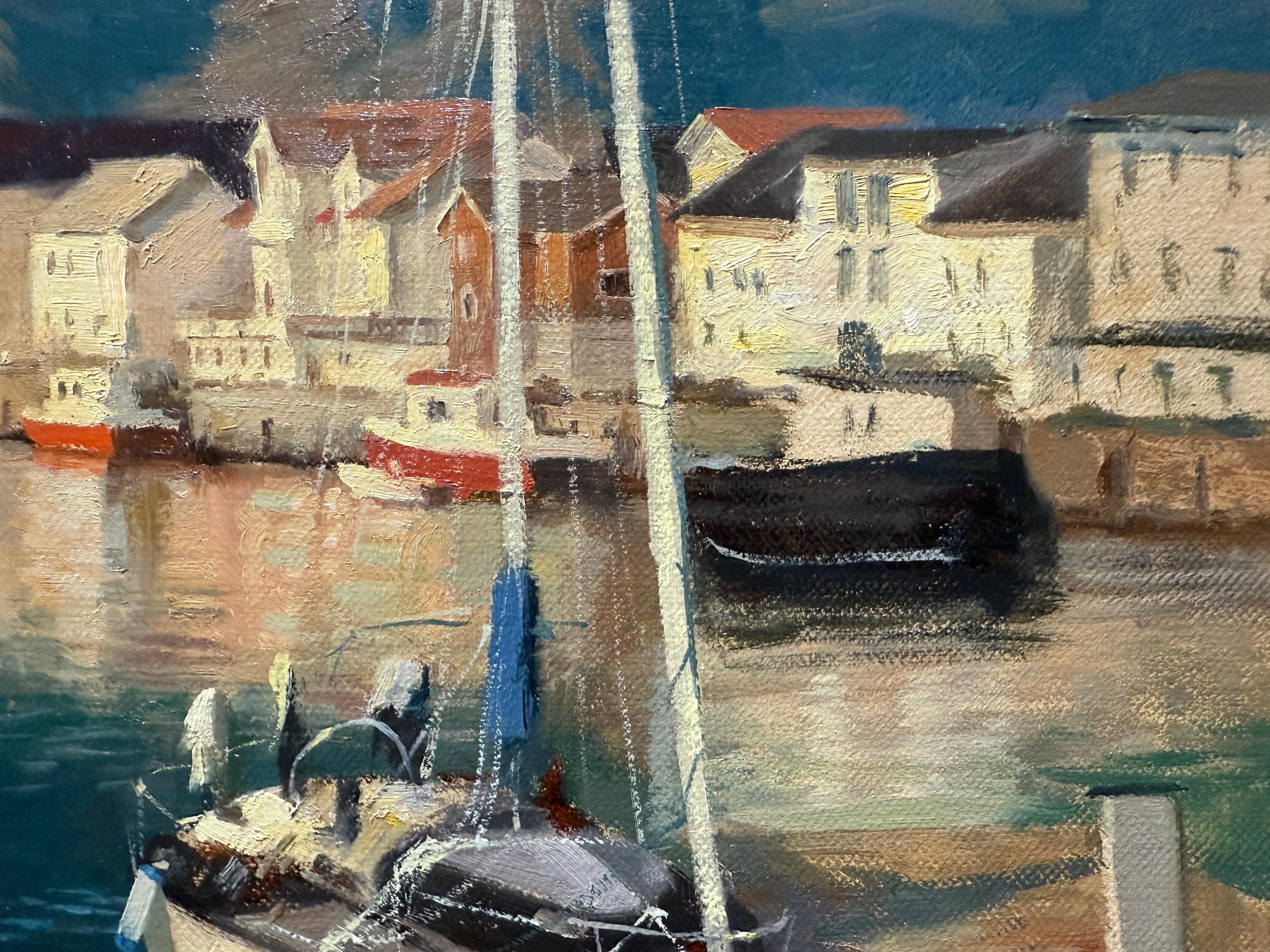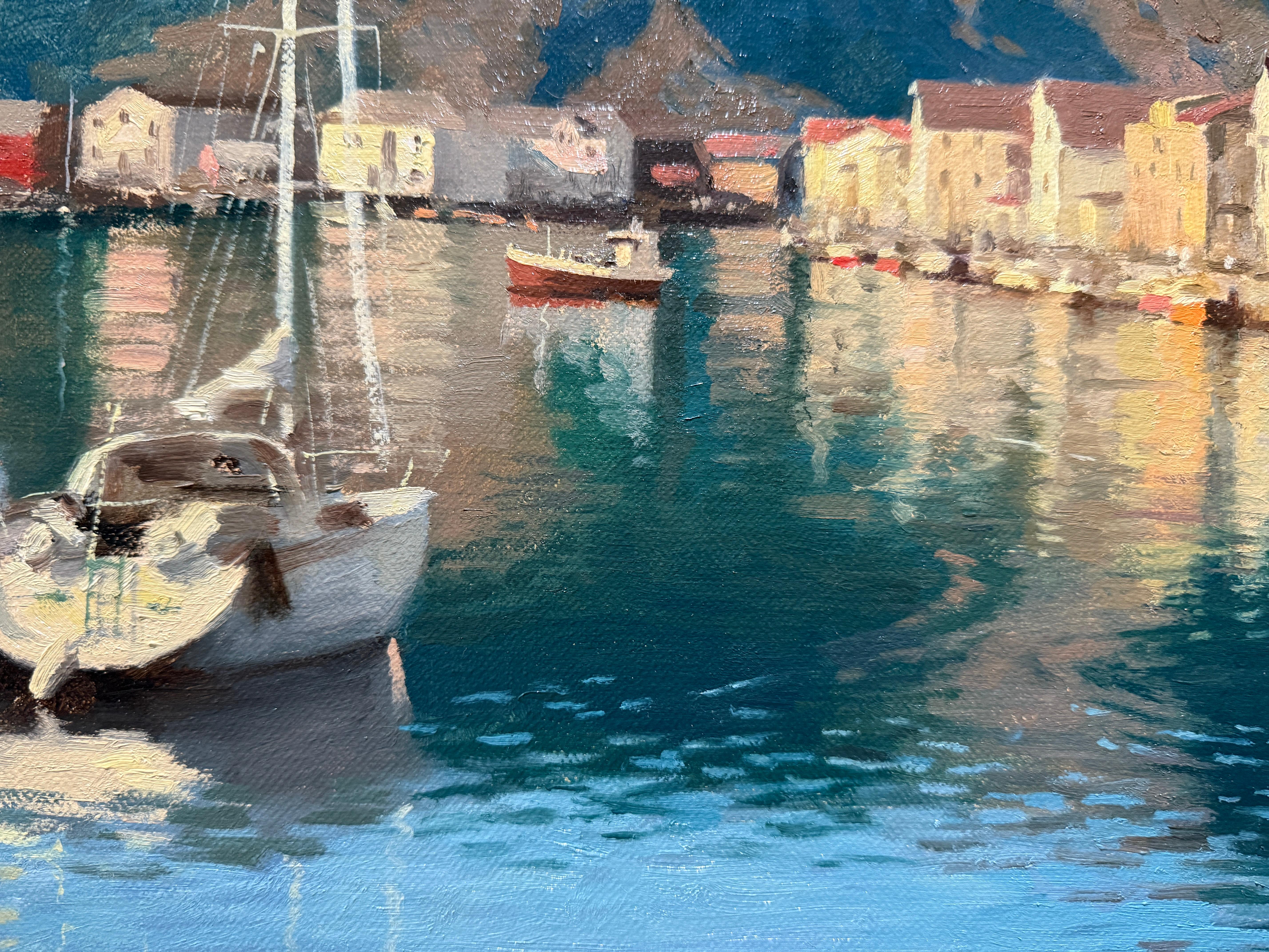 Articles similaires à "Henningsvaer" peinture à l'huile, paysage marin réaliste, voiliers, lumière dorée, encadrée