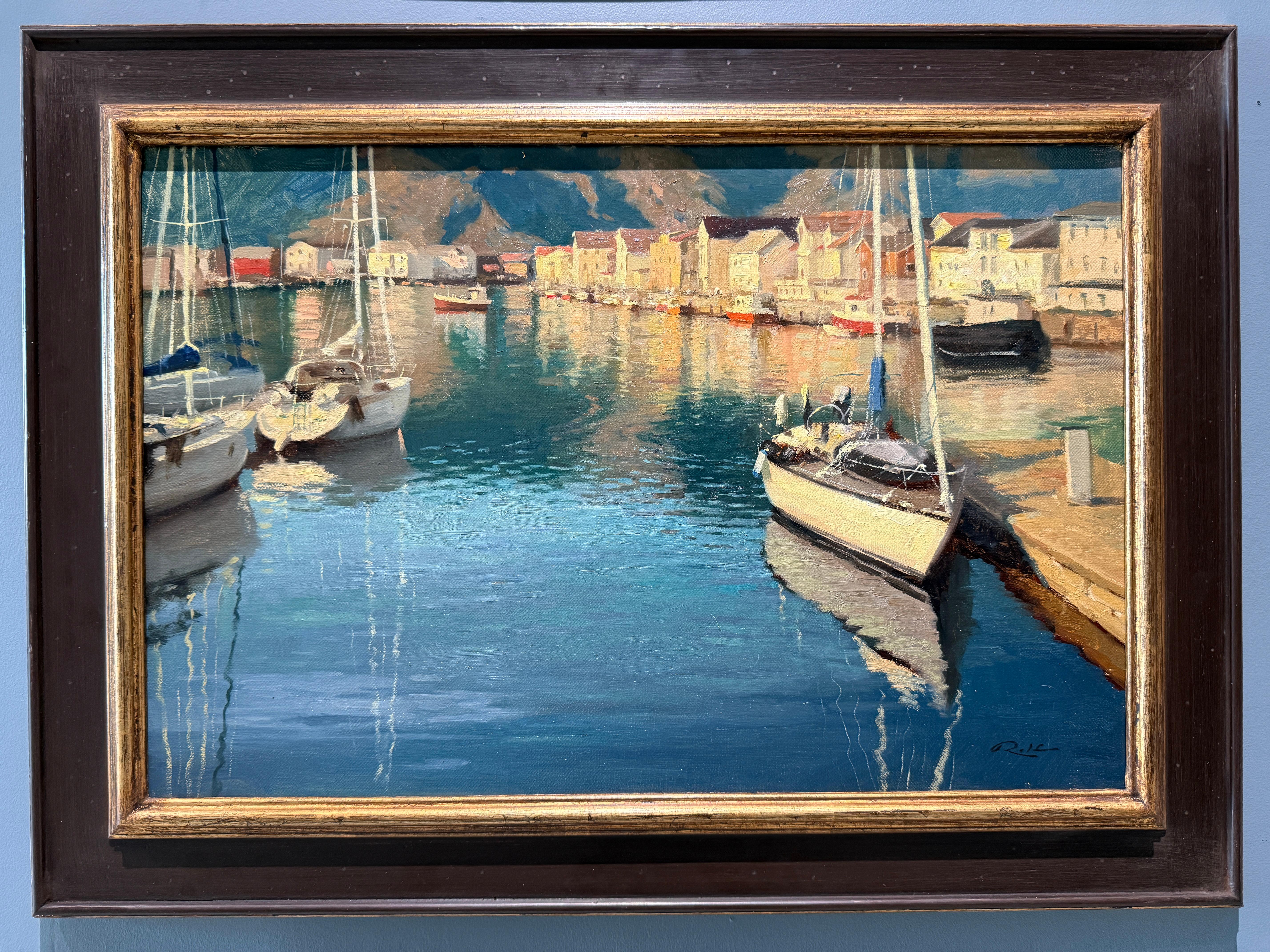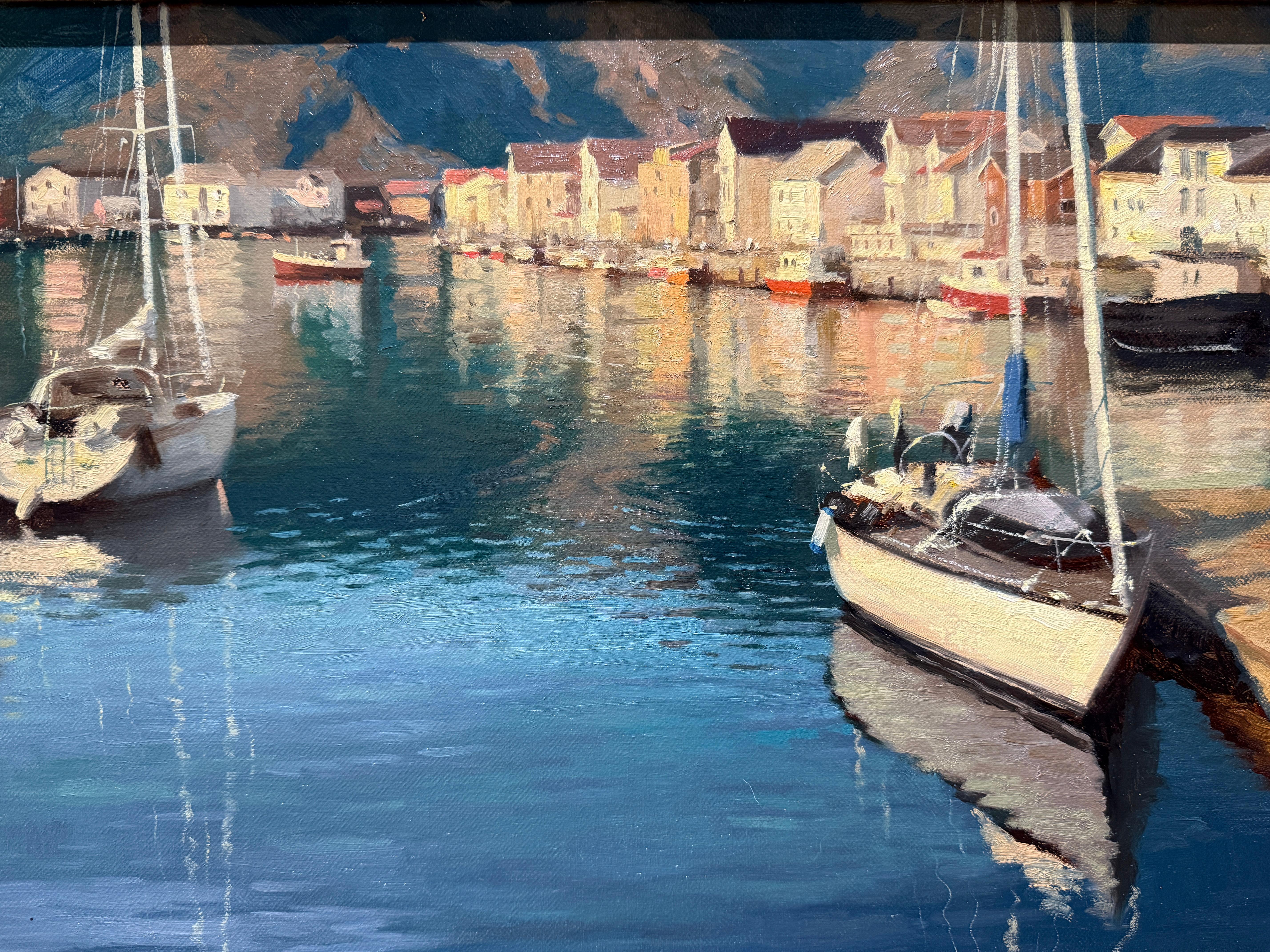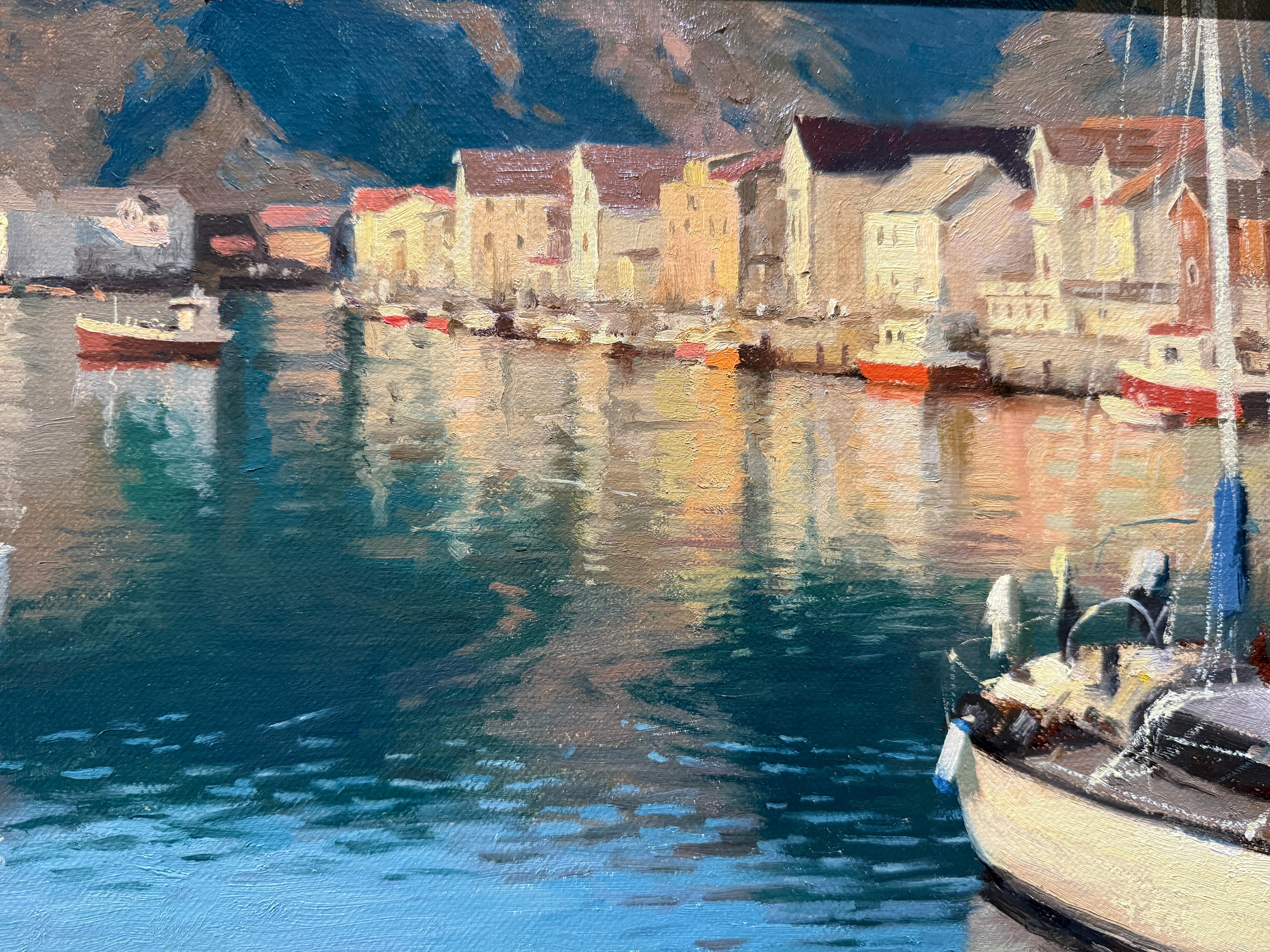 Rolf Hellem"Henningsvaer" peinture à l'huile, paysage marin réaliste, voiliers, lumière dorée, encadrée2025