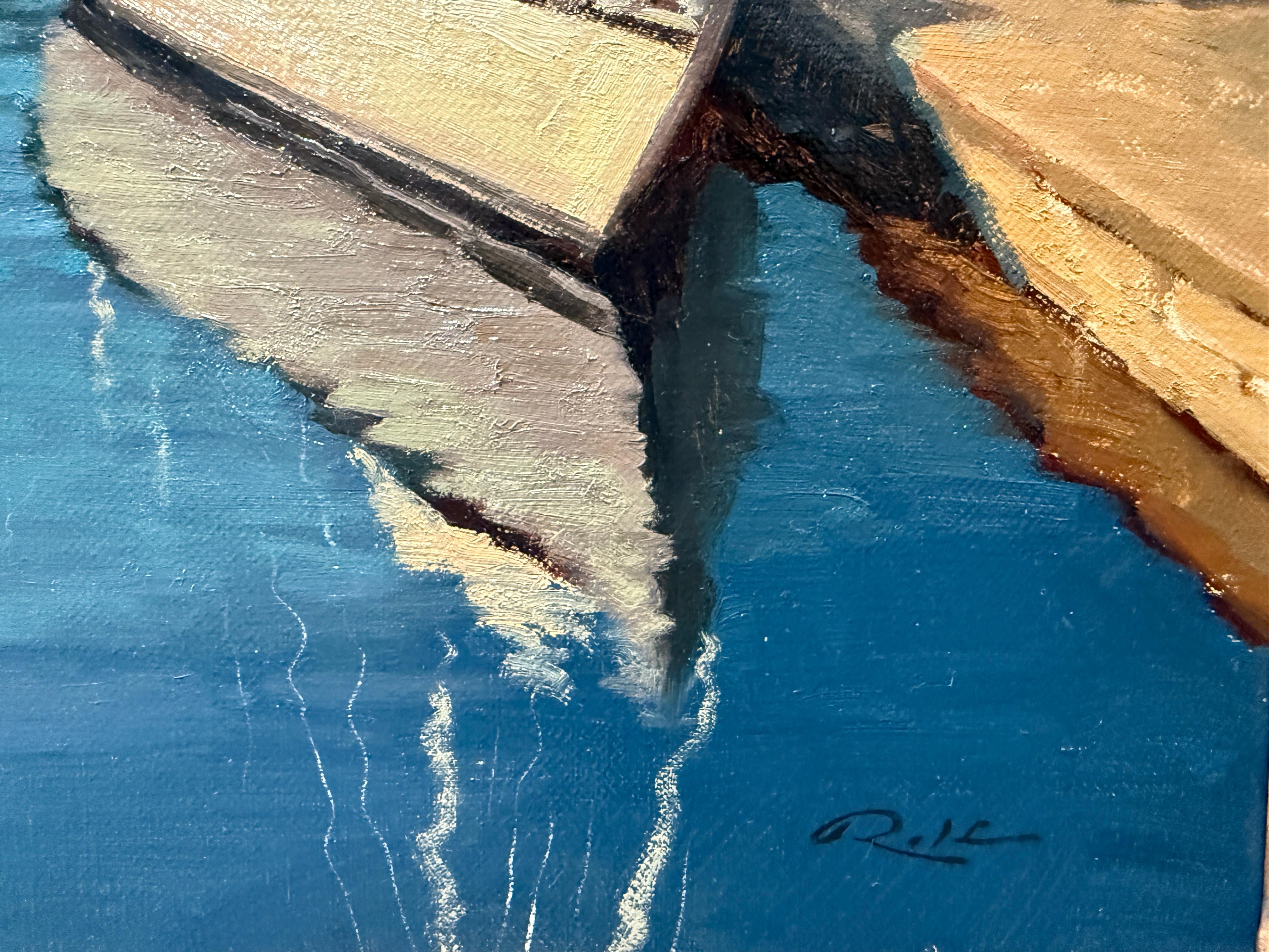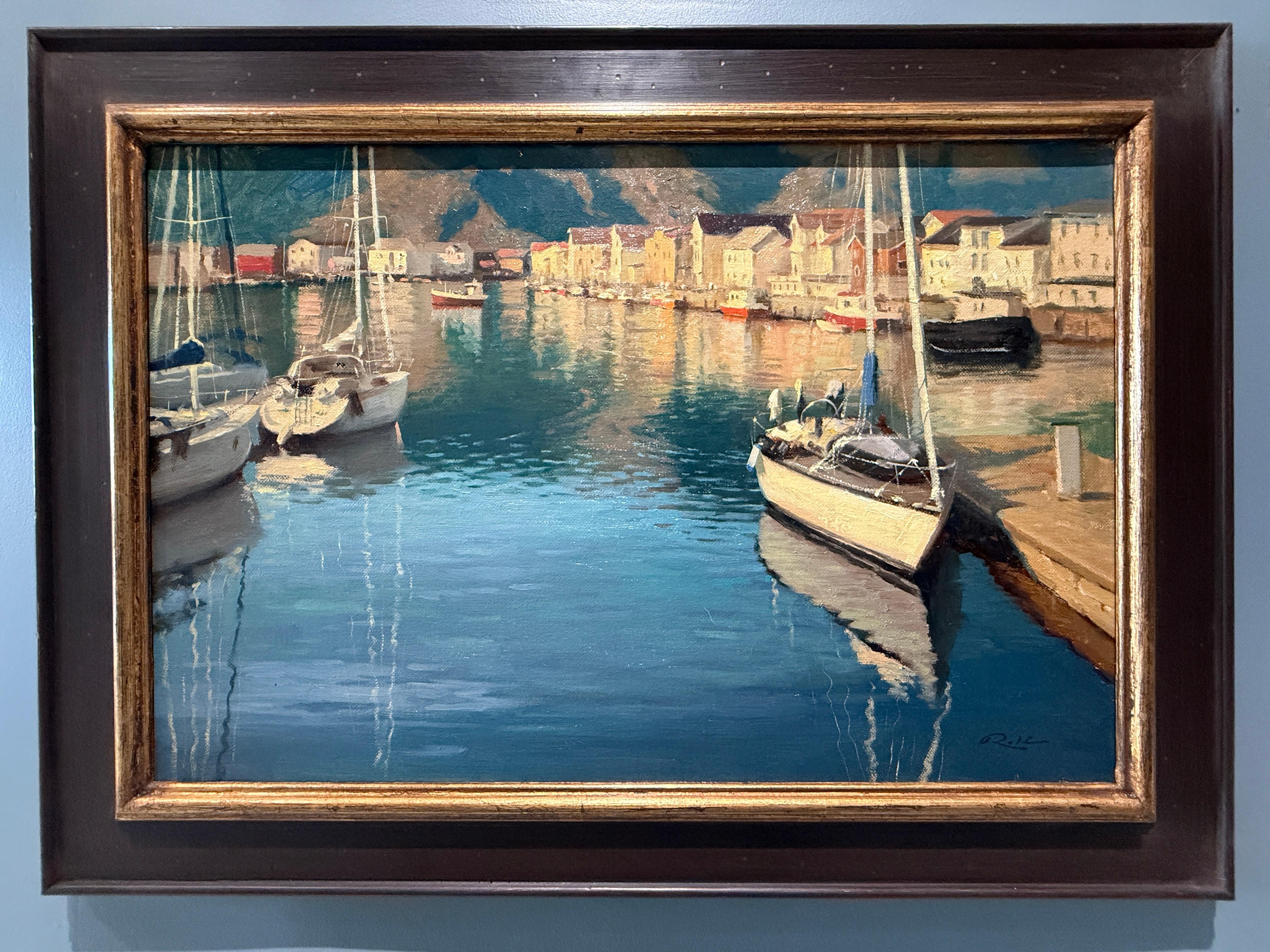 "Docked in the Evening Light" est une peinture réaliste à l'huile sur lin. Elle représente la lumière du soir se reflétant sur l'eau où flottent plusieurs petits bateaux. Au premier ...