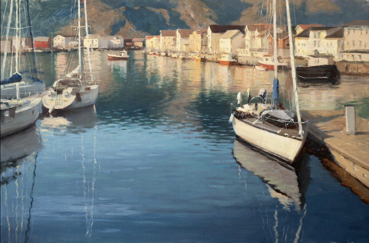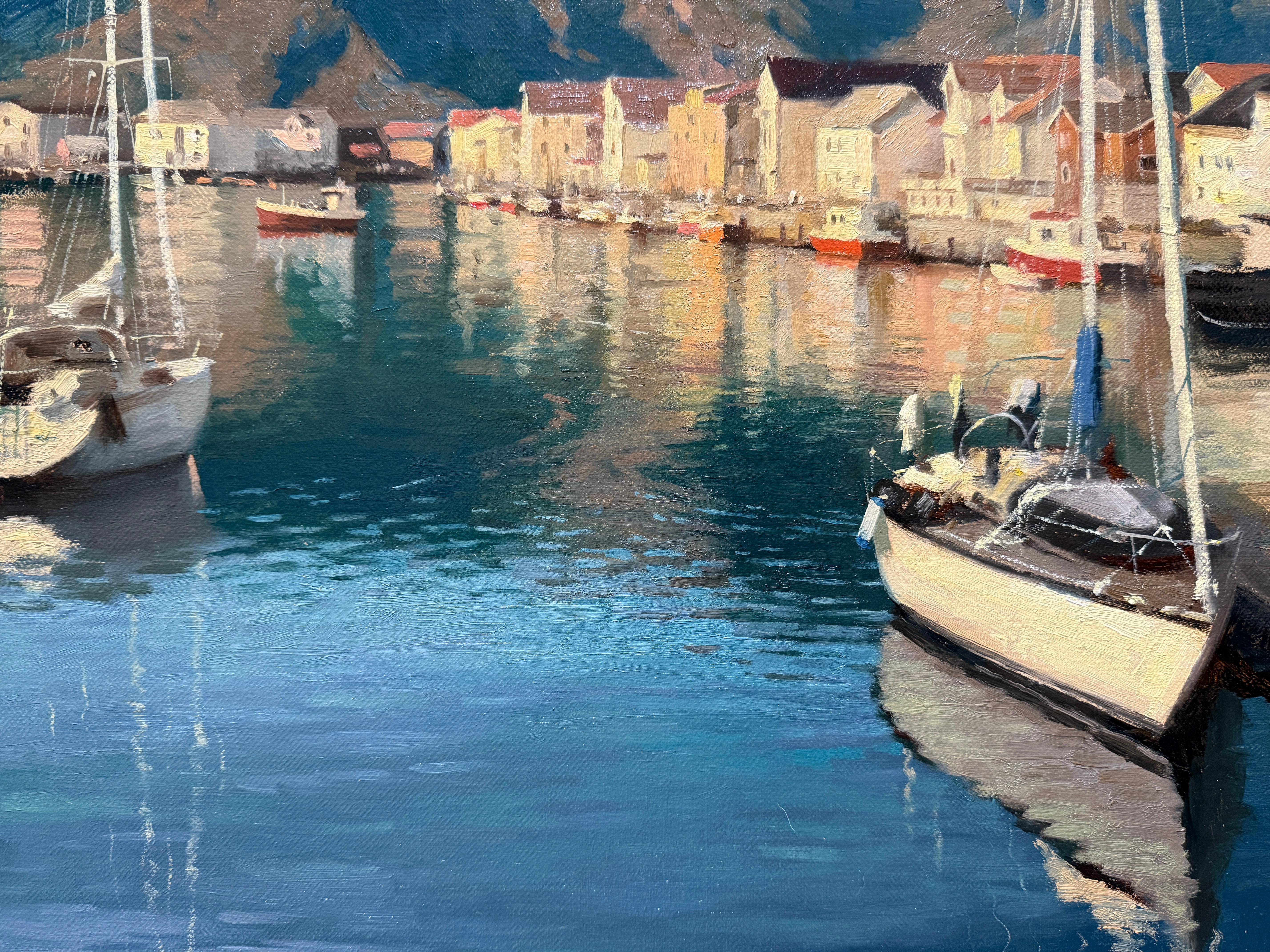 Une peinture à l'huile de Rolf Hellem (b. 1998, Norvège) du port de Henningsvær, un village de pêcheurs de la municipalité de Vågan, dans le comté de Nordland, en Norvège. Elle est située sur plusieurs petites îles au large de la côte sud de la grande île d'Austvågøya dans l'archipel des Lofoten. La voile, la navigation de plaisance et la pêche sont essentielles à la culture et au mode de vie des habitants de ce groupe d'îles. La vaste mer reflète le ciel lumineux au-dessus, qui projette un riche bleu sarcelle sur la surface de l'eau, rendu de manière experte par ce peintre d'origine norvégienne.