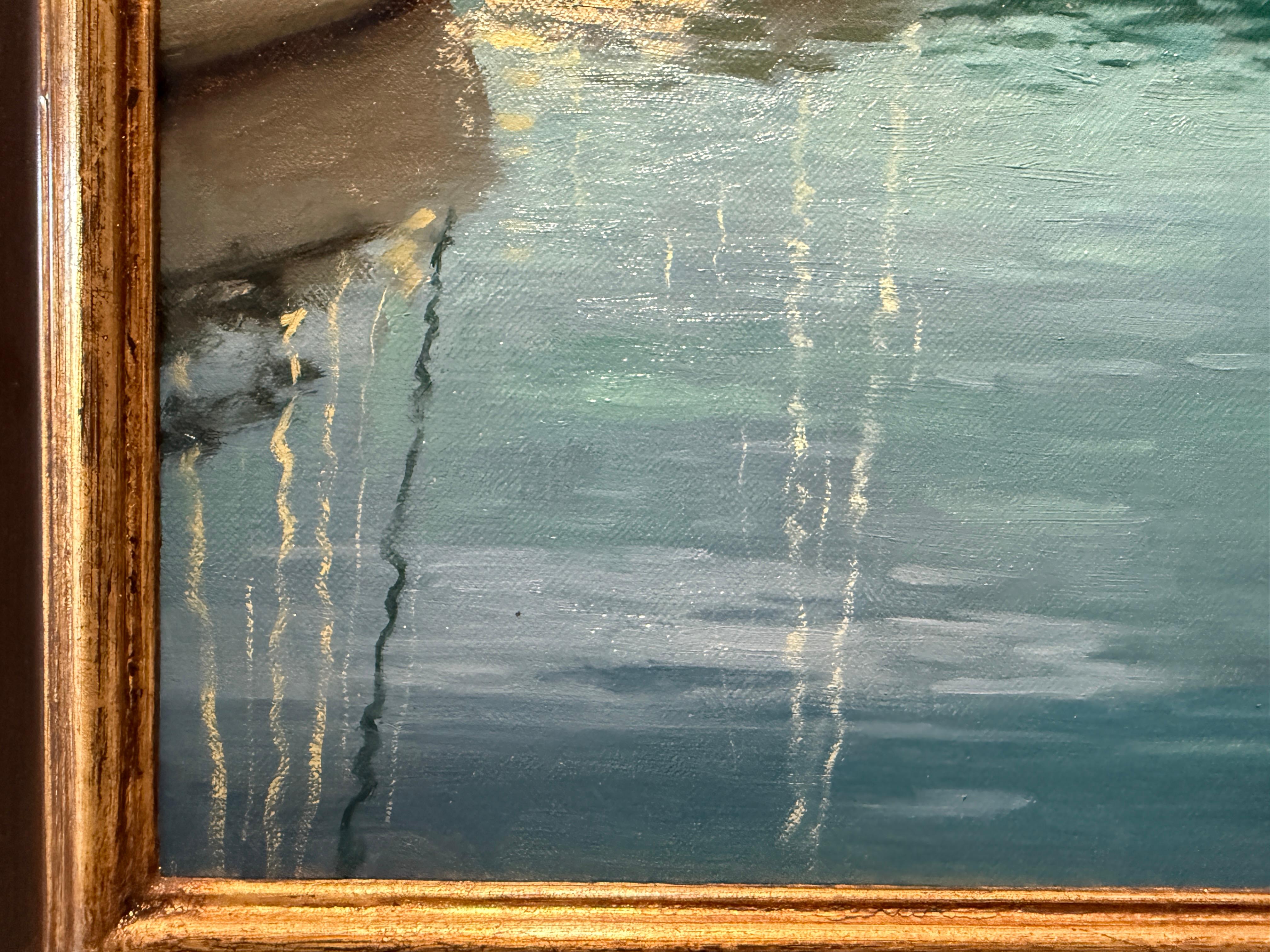 "Shimmering Sunset", avec ses reflets lumineux sur l'eau des voiliers amarrés au quai, est un exemple typique du réalisme amélioré de Tom Swimm. Cette peinture à l'huile colorée prés...