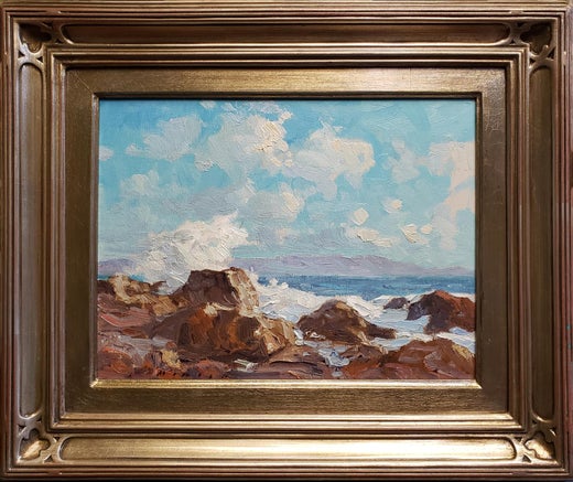"80' At Divers Cove" est une huile atmosphérique créée à partir d'une étude peinte sur place à Laguna Beach par le célèbre artiste californien Jacobus Baas. Cette peinture de plein a...