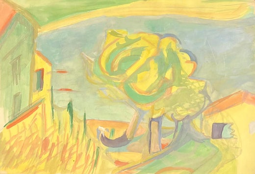 Paysage abstrait vibrant aux tons jaunes et verts avec un arbre tourbillonnant