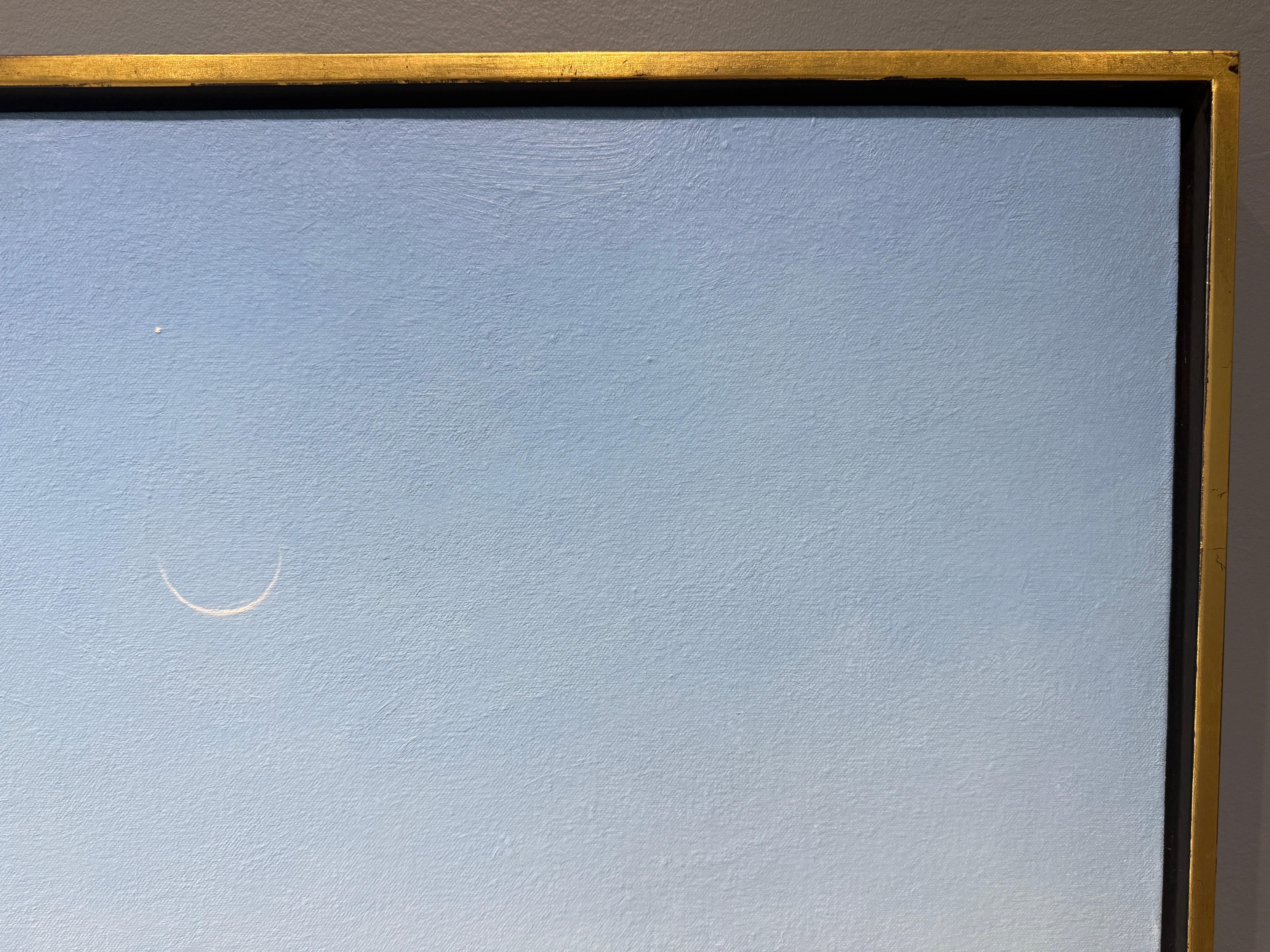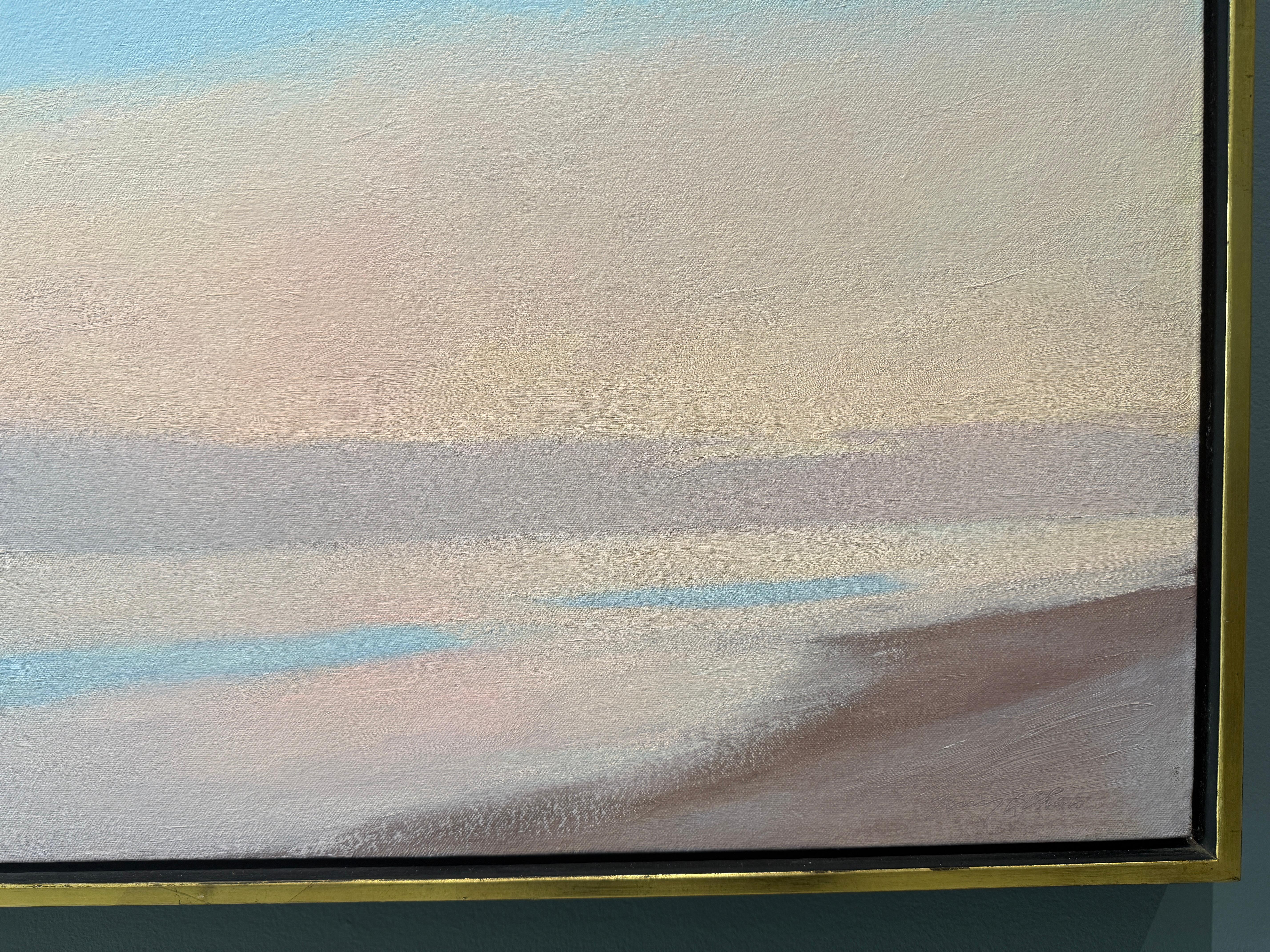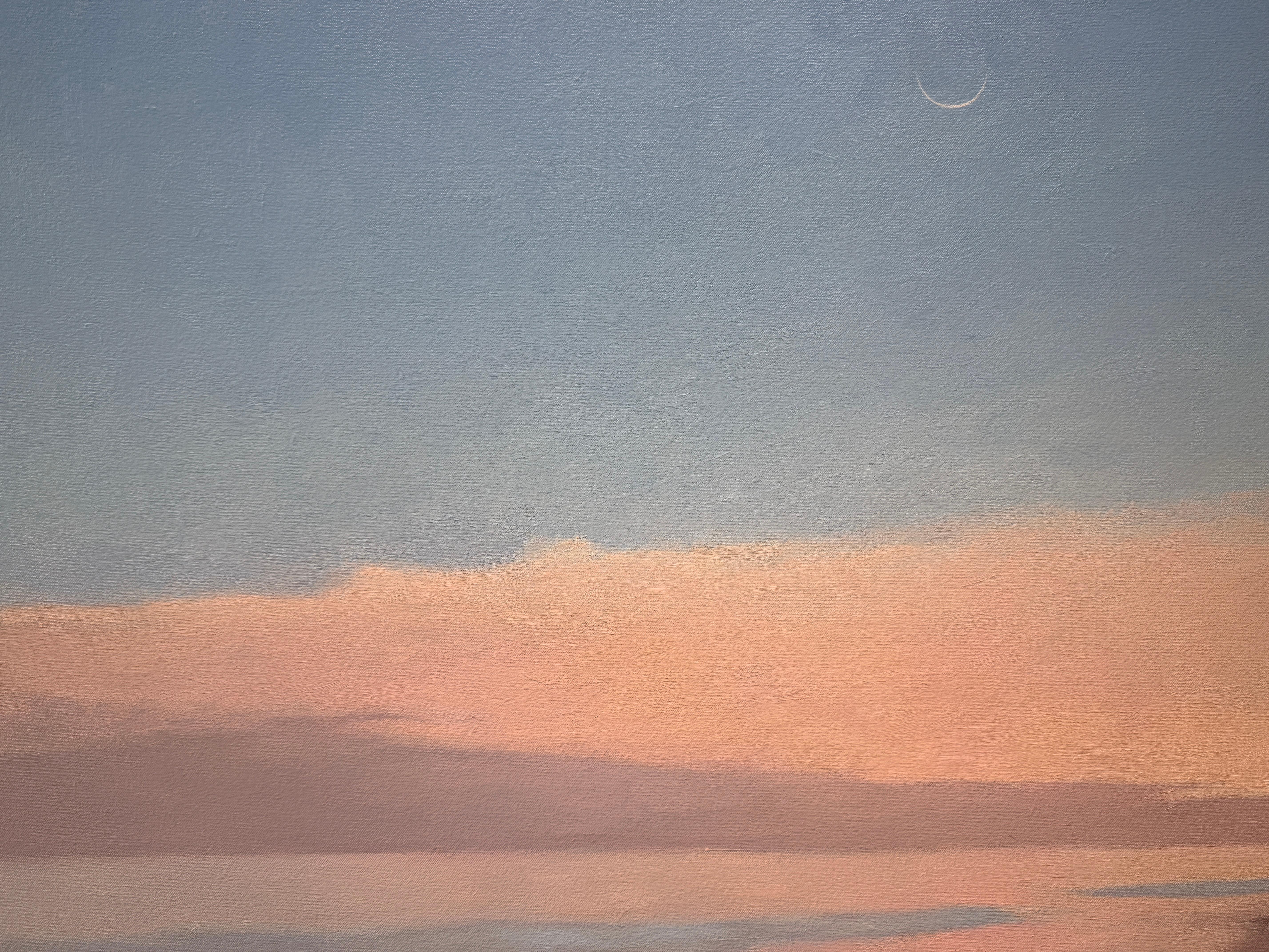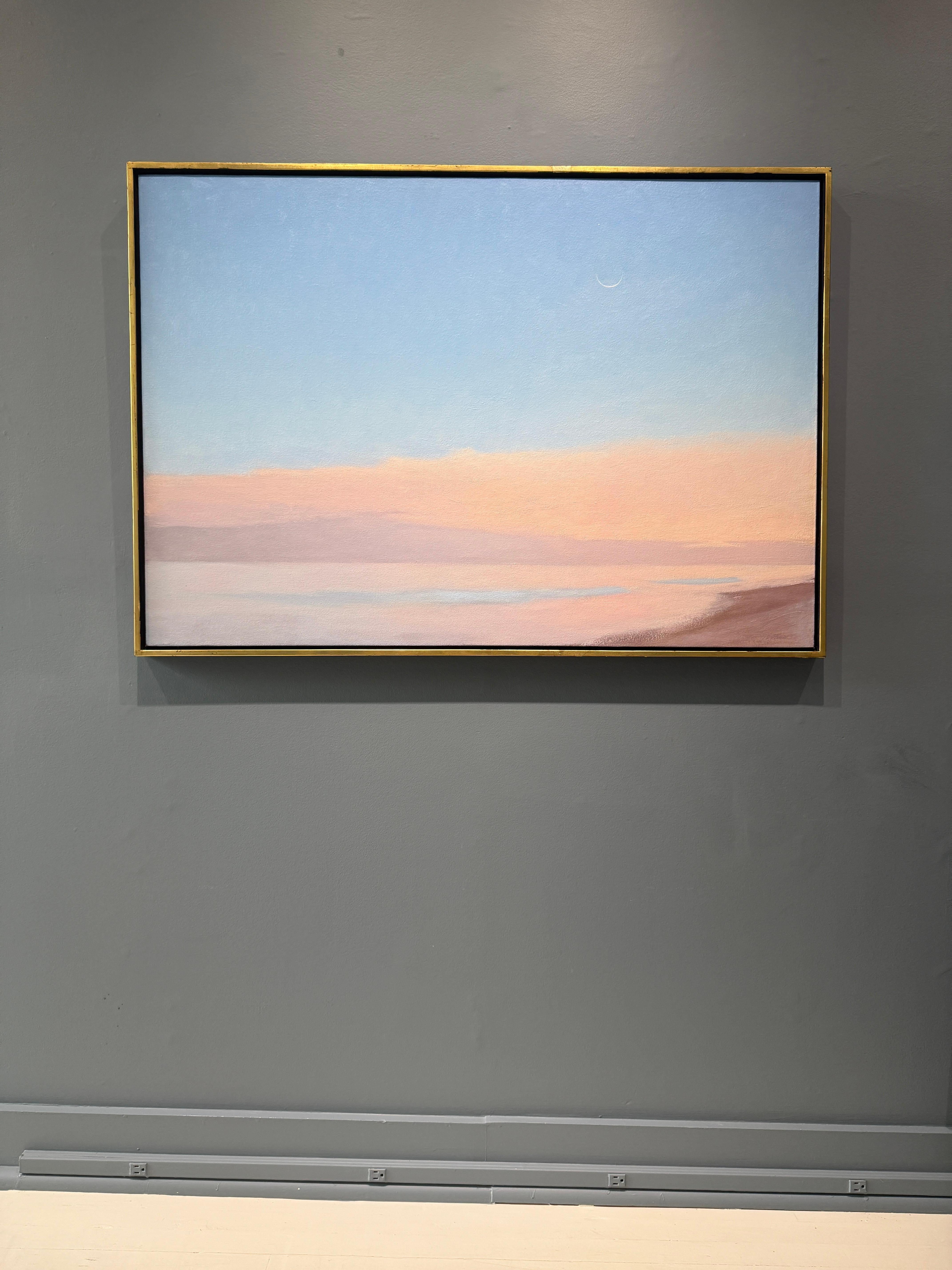 Peinture à l'huile de Terry Elkins (né en 1951 / Vicksburg, Mississippi) représentant le vaste ciel bleu au-dessus de l'océan Atlantique, à Sagg Main Beach à Sagaponack, NY. Un mince croissant de lune flotte dans le ciel bleu, une tache de peinture blanche, une étoile directrice au-dessus de la lune. Les nuages s'illuminent d'une teinte rose-orange, reflétant le soleil couchant à l'ouest. Les nuages rose tendre se reflètent sur la surface des océans, mêlant subtilement le ciel à l'eau - un horizon presque indiscernable. Le premier plan en bas à droite offre au spectateur la possibilité de toucher terre, un rivage de sable mouillé représenté dans une couleur terracotta.
