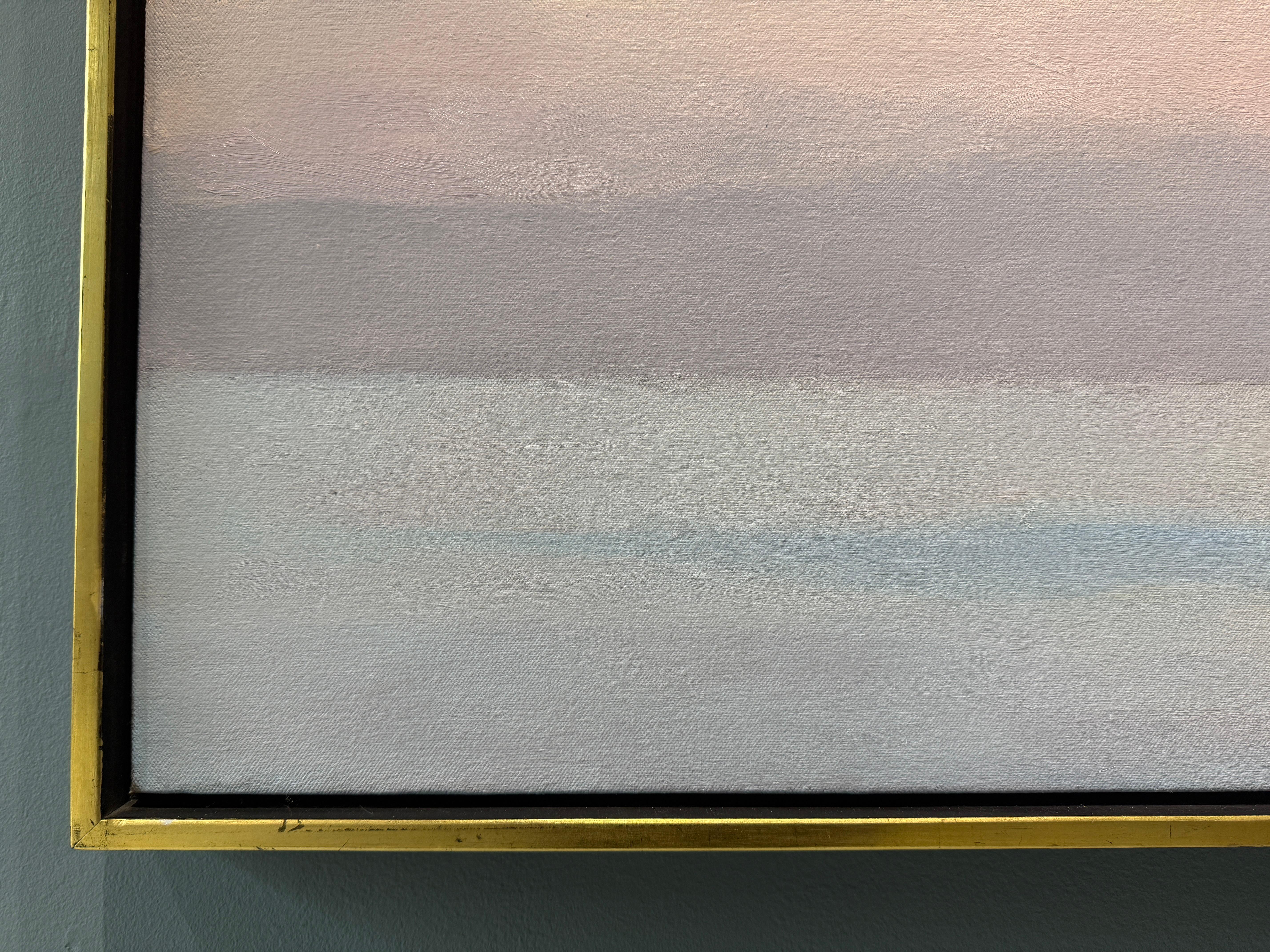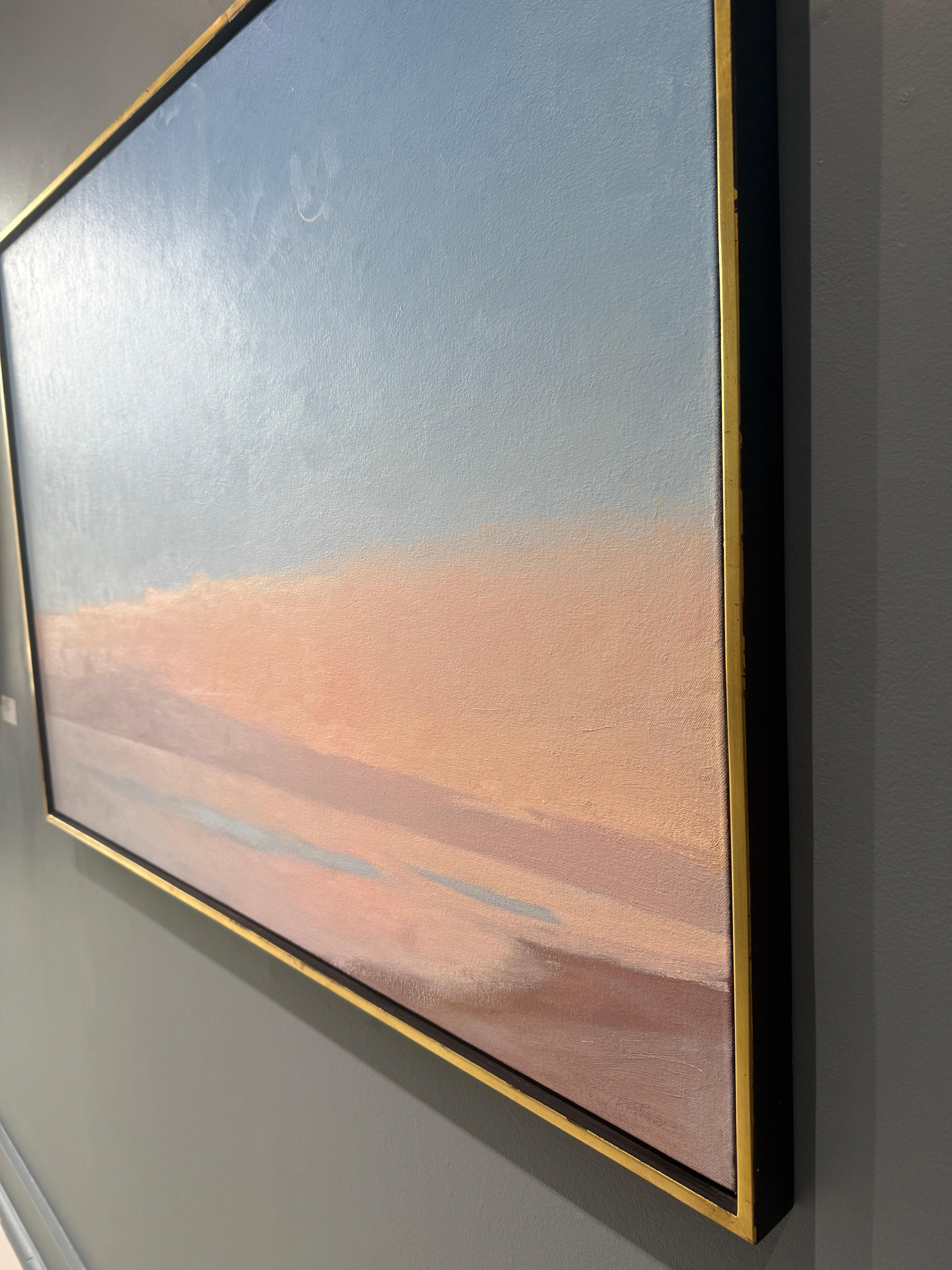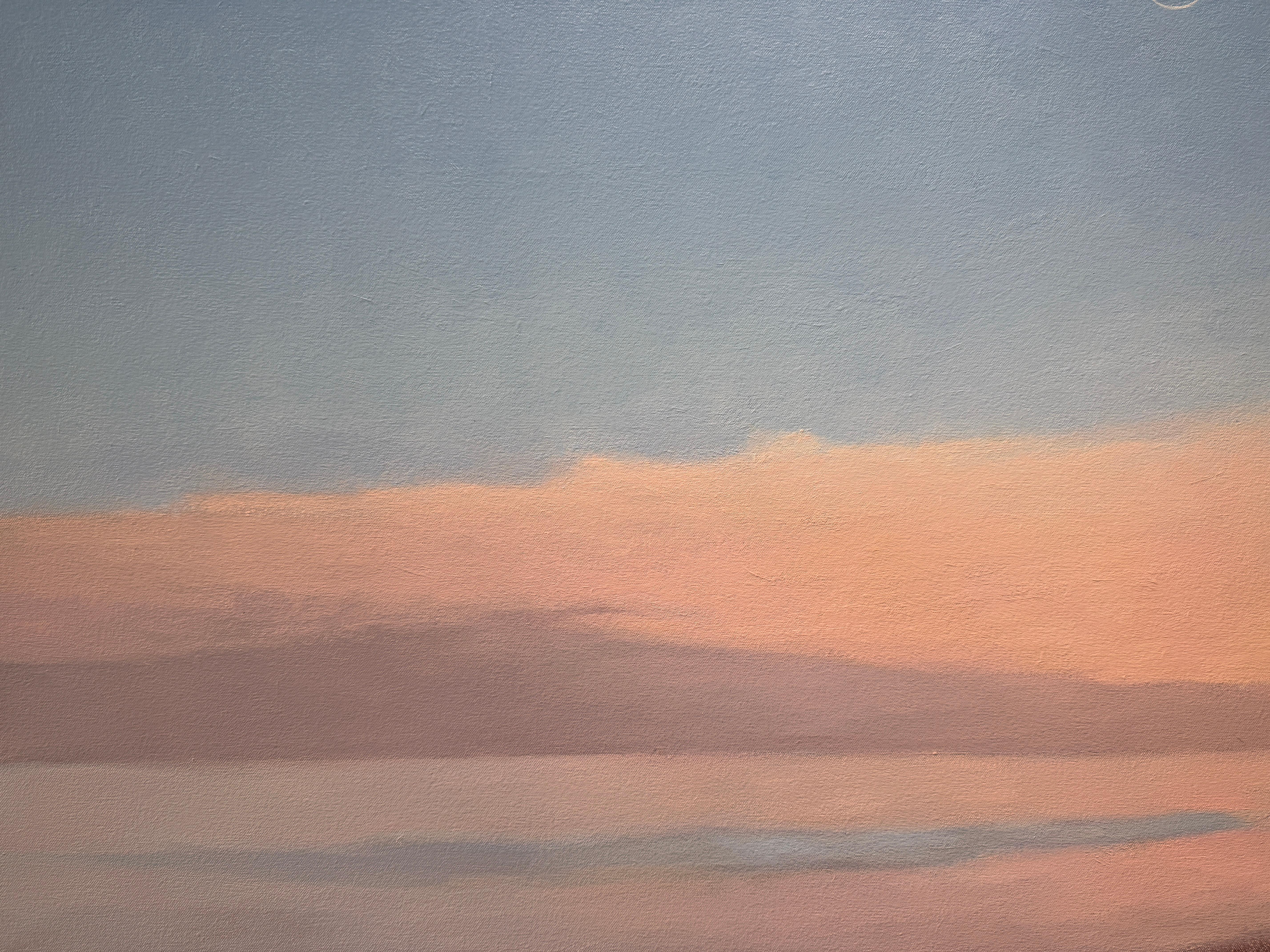 Peinture à l'huile de Terry Elkins (né en 1951 / Vicksburg, Mississippi) représentant le vaste ciel bleu au-dessus de l'océan Atlantique, à Sagg Main Beach à Sagaponack, NY. Un mince croissant de lune flotte dans le ciel bleu, une tache de peinture blanche, une étoile directrice au-dessus de la lune. Les nuages s'illuminent d'une teinte rose-orange, reflétant le soleil couchant à l'ouest. Les nuages rose tendre se reflètent sur la surface des océans, mêlant subtilement le ciel à l'eau - un horizon presque indiscernable. Le premier plan en bas à droite offre au spectateur la possibilité de toucher terre, un rivage de sable mouillé représenté dans une couleur terracotta.