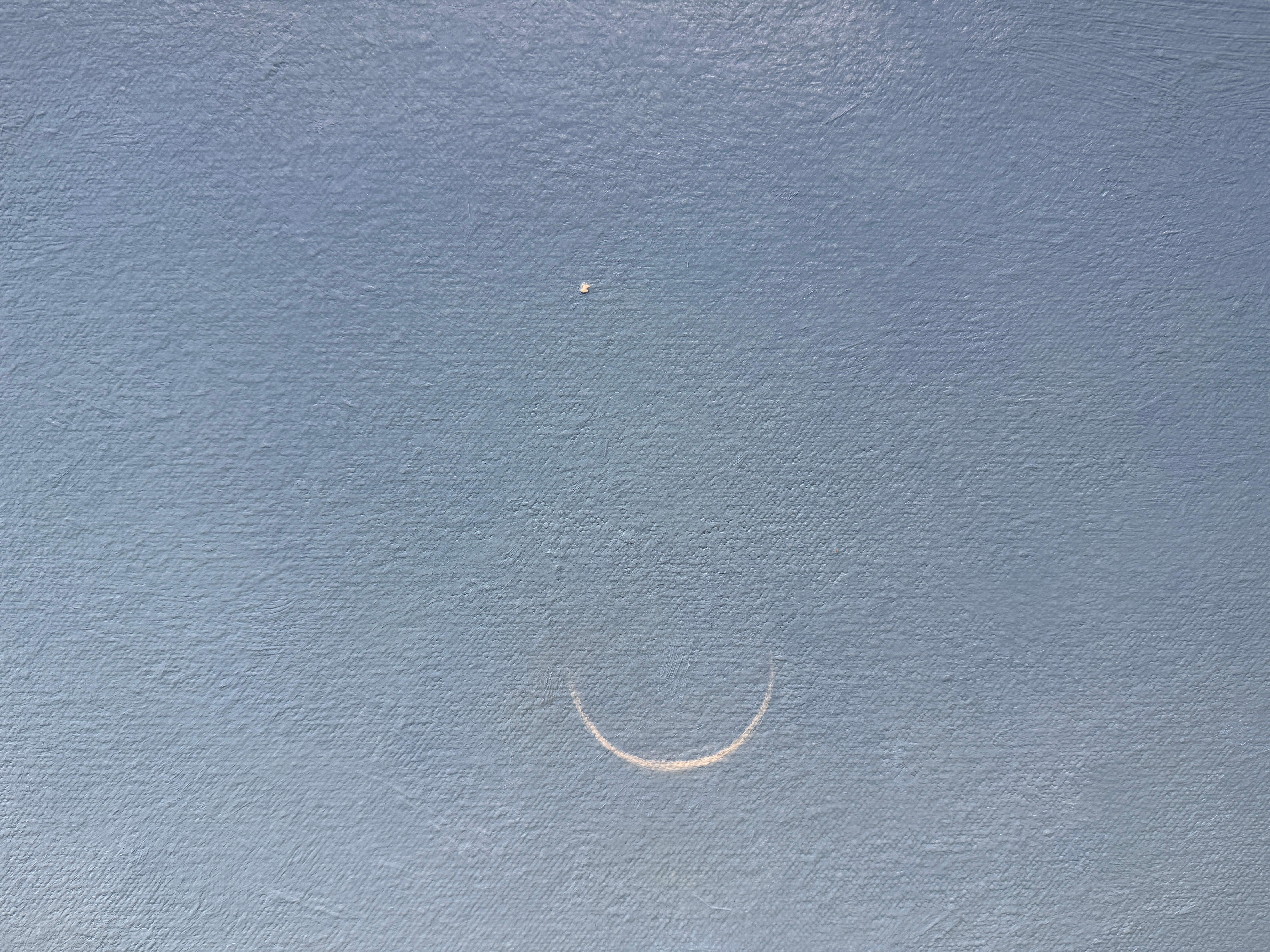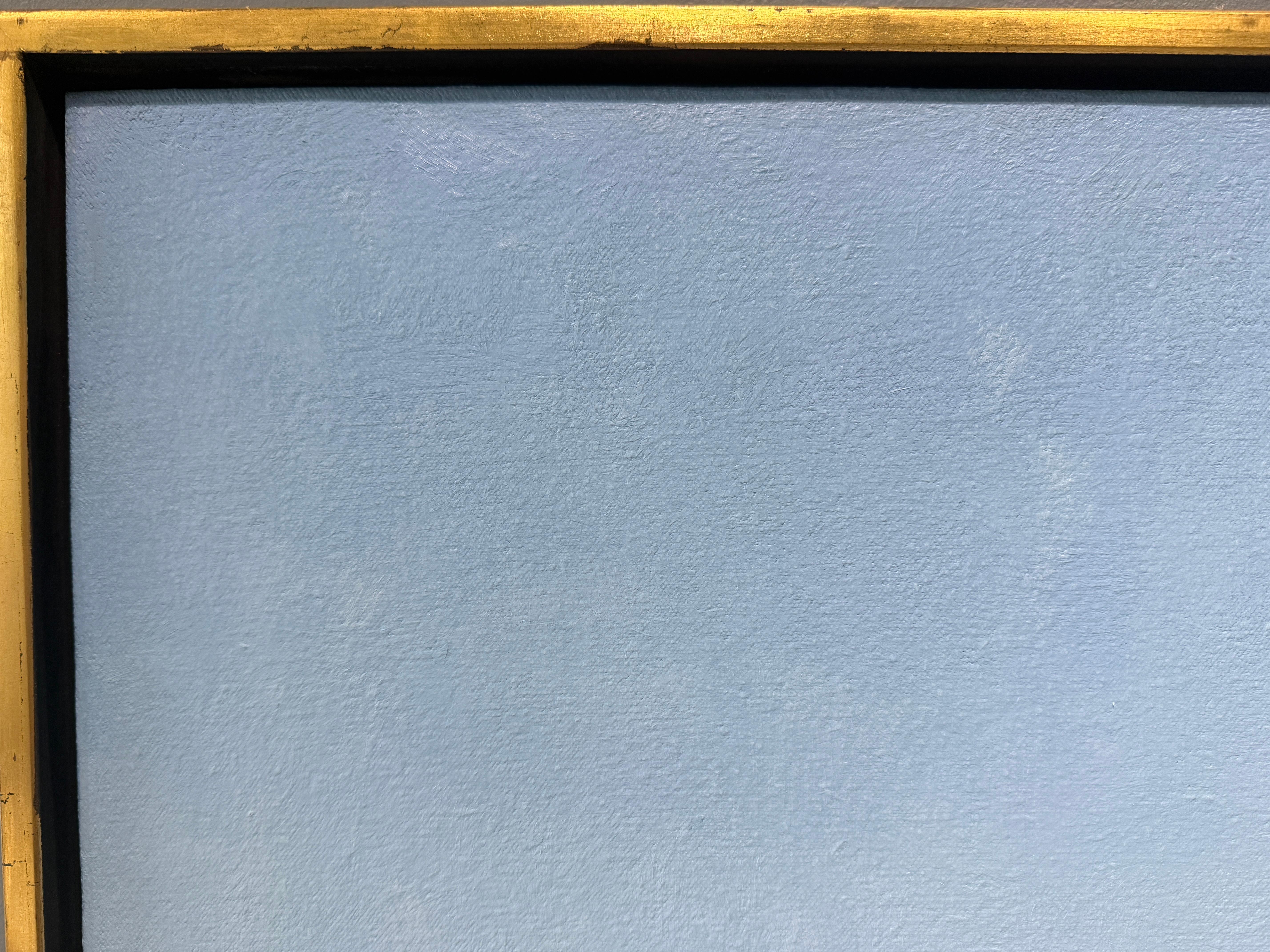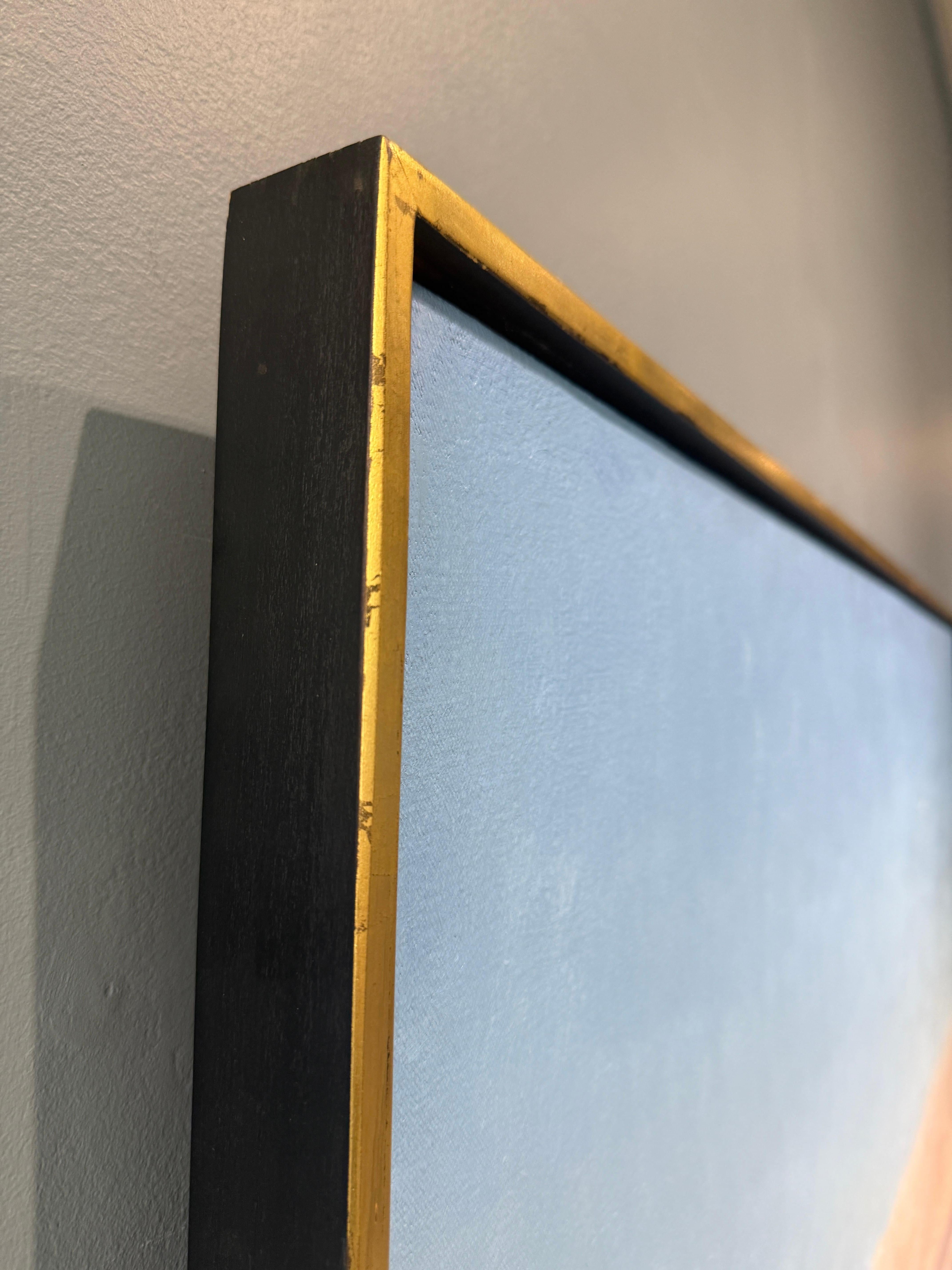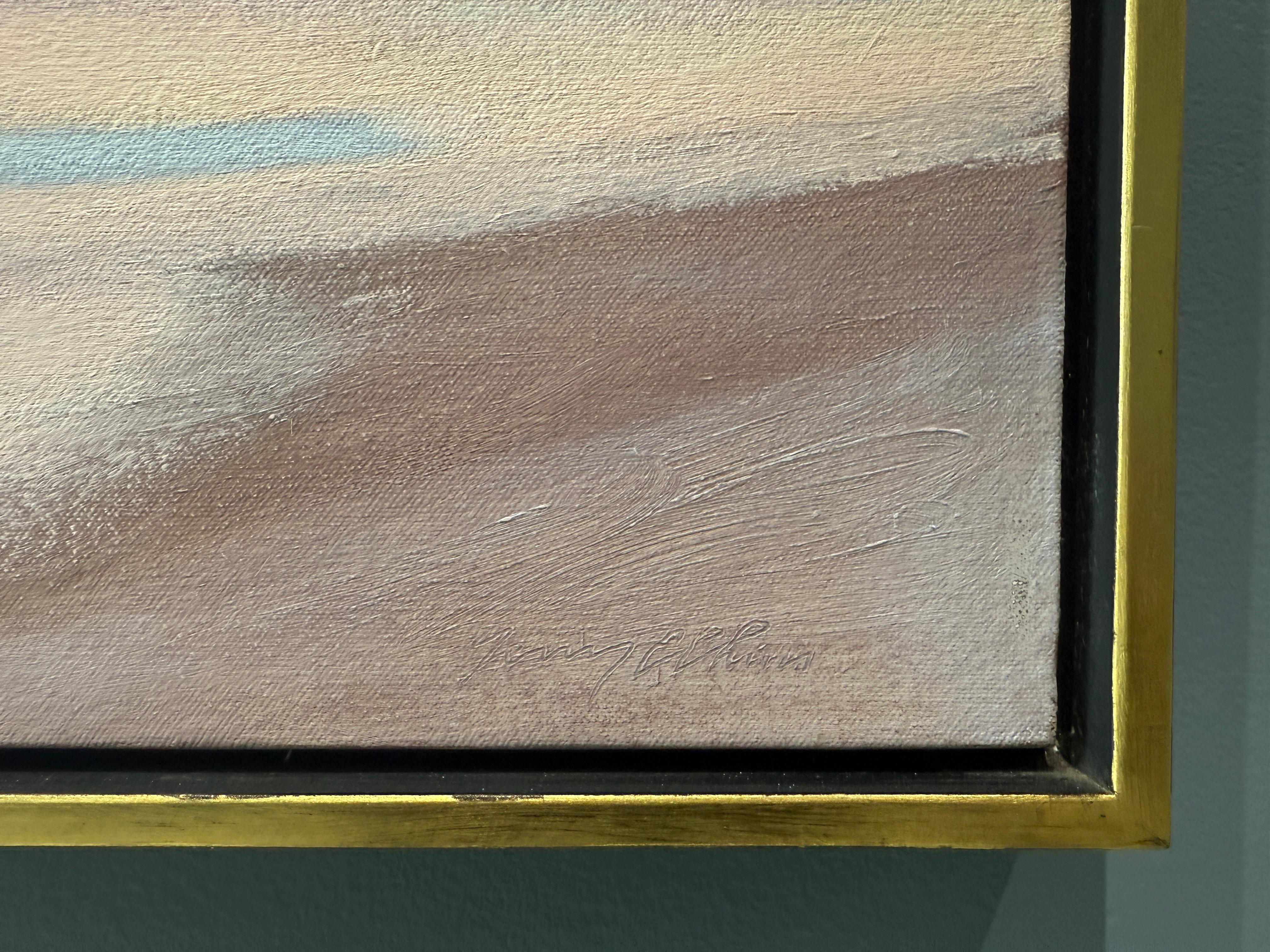 Peinture à l'huile de Terry Elkins (né en 1951 / Vicksburg, Mississippi) représentant le vaste ciel bleu au-dessus de l'océan Atlantique, à Sagg Main Beach à Sagaponack, NY. Un mince croissant de lune flotte dans le ciel bleu, une tache de peinture blanche, une étoile directrice au-dessus de la lune. Les nuages s'illuminent d'une teinte rose-orange, reflétant le soleil couchant à l'ouest. Les nuages rose tendre se reflètent sur la surface des océans, mêlant subtilement le ciel à l'eau - un horizon presque indiscernable. Le premier plan en bas à droite offre au spectateur la possibilité de toucher terre, un rivage de sable mouillé représenté dans une couleur terracotta.