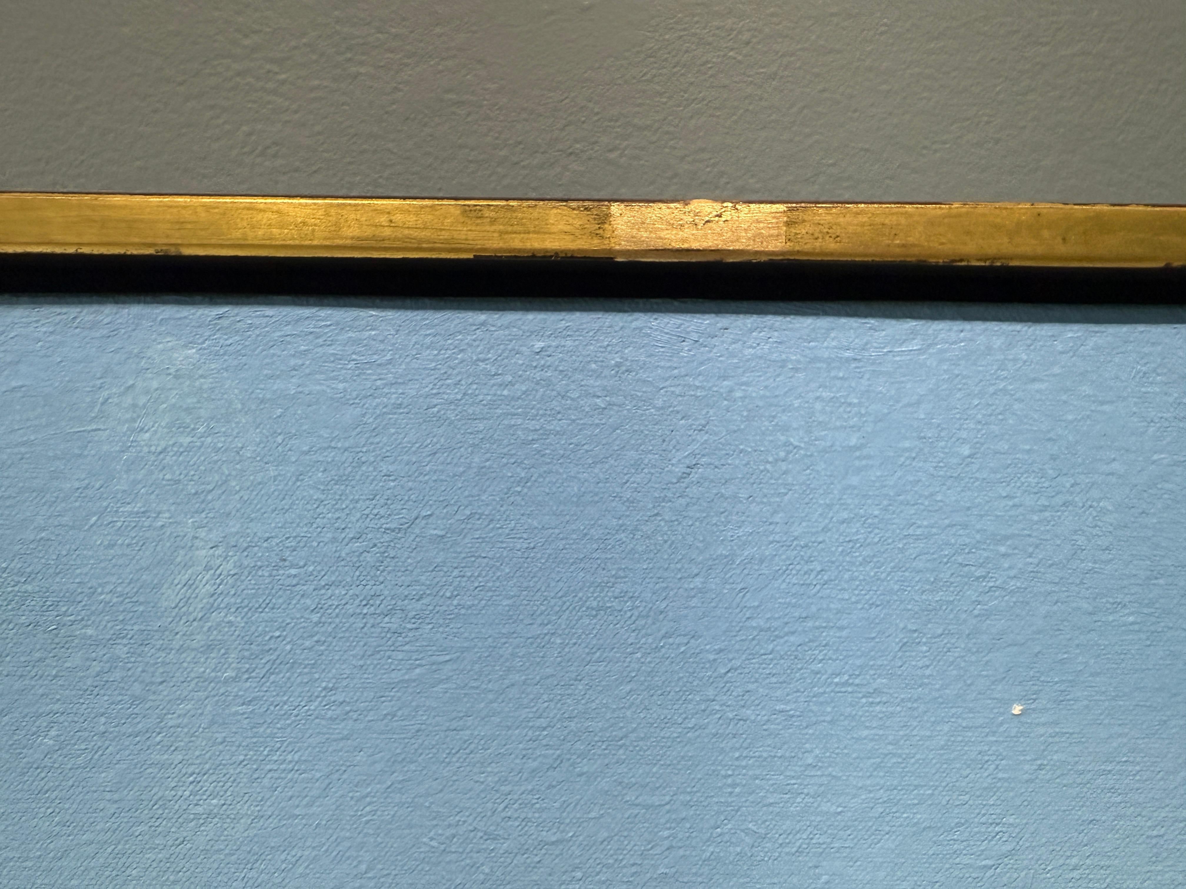 Encadré dans un cadre flottant simple, face dorée, flotteur intérieur noir. Bords extérieurs noirs.