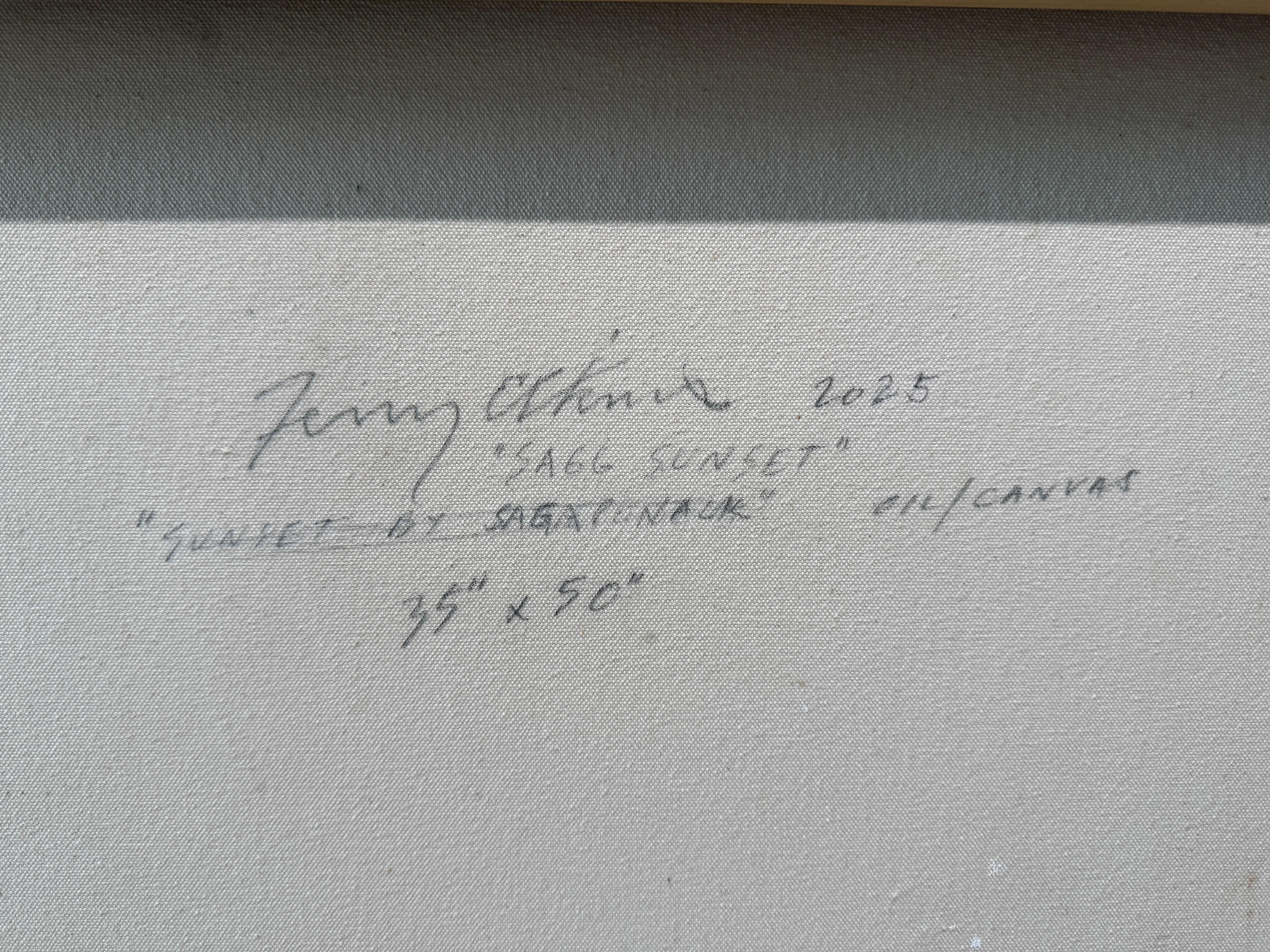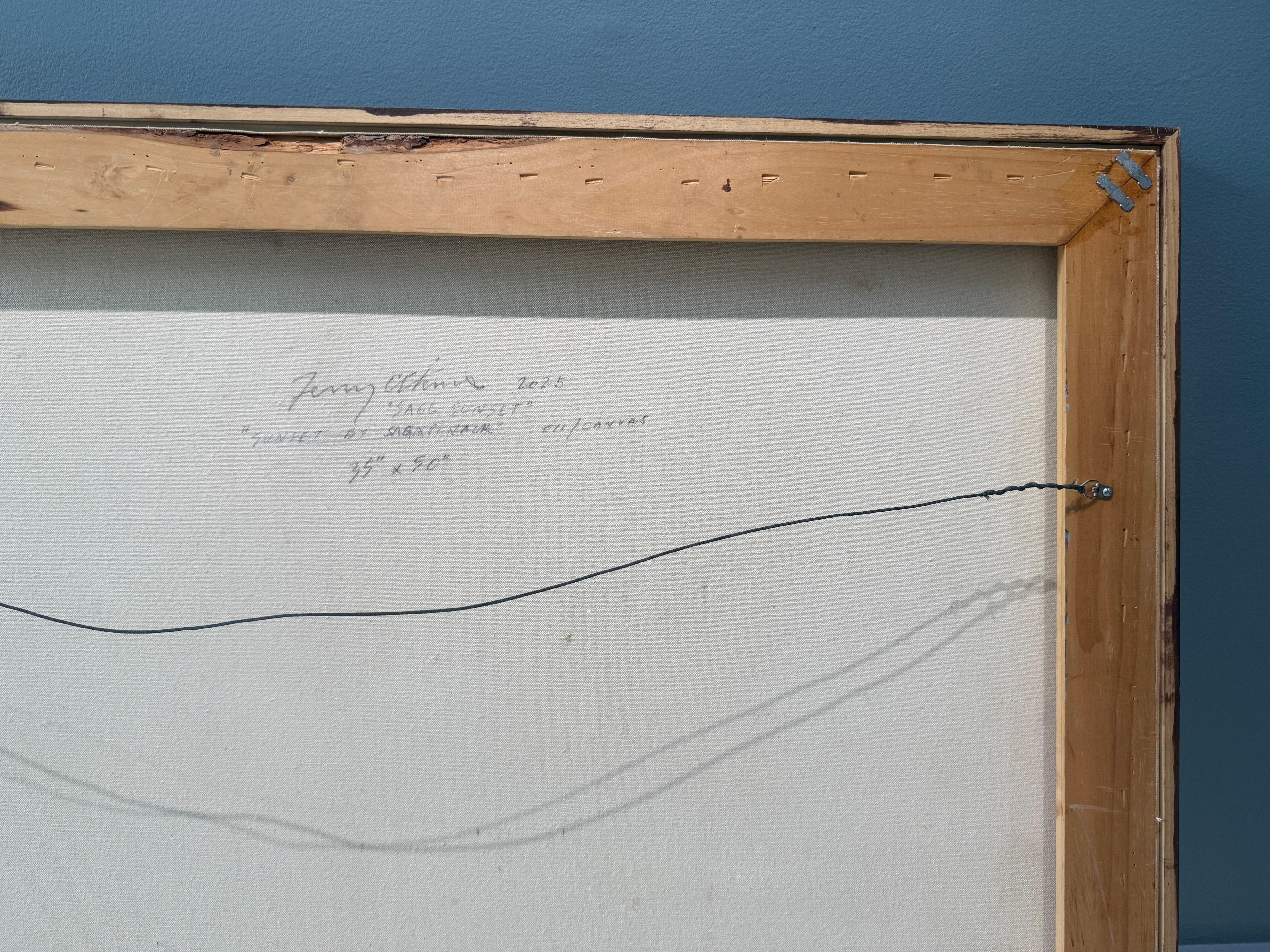 Verso : " Terry Elkins 2025 "Sagg Sunset" "Sunset by Sagaponack" Oil/Canvas 35" x 50" "