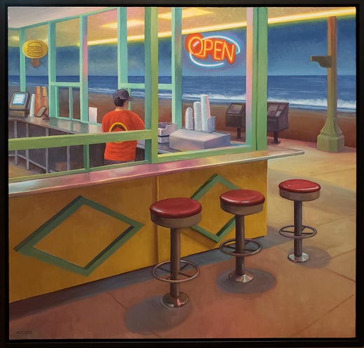 Night Burger ; peinture de genre d'un ouvrier spécialisé dans la nourriture rapide regardant une plage tranquille