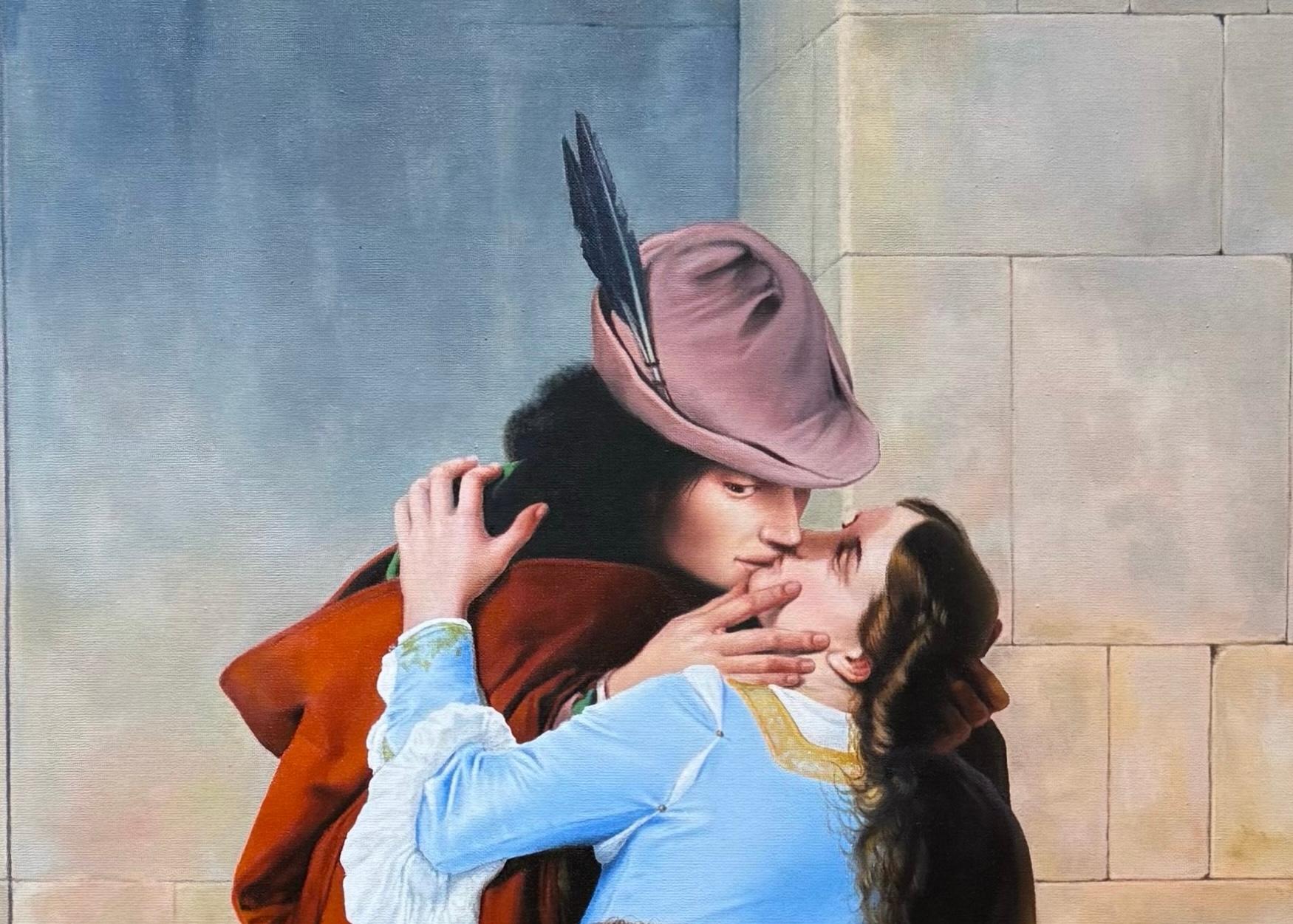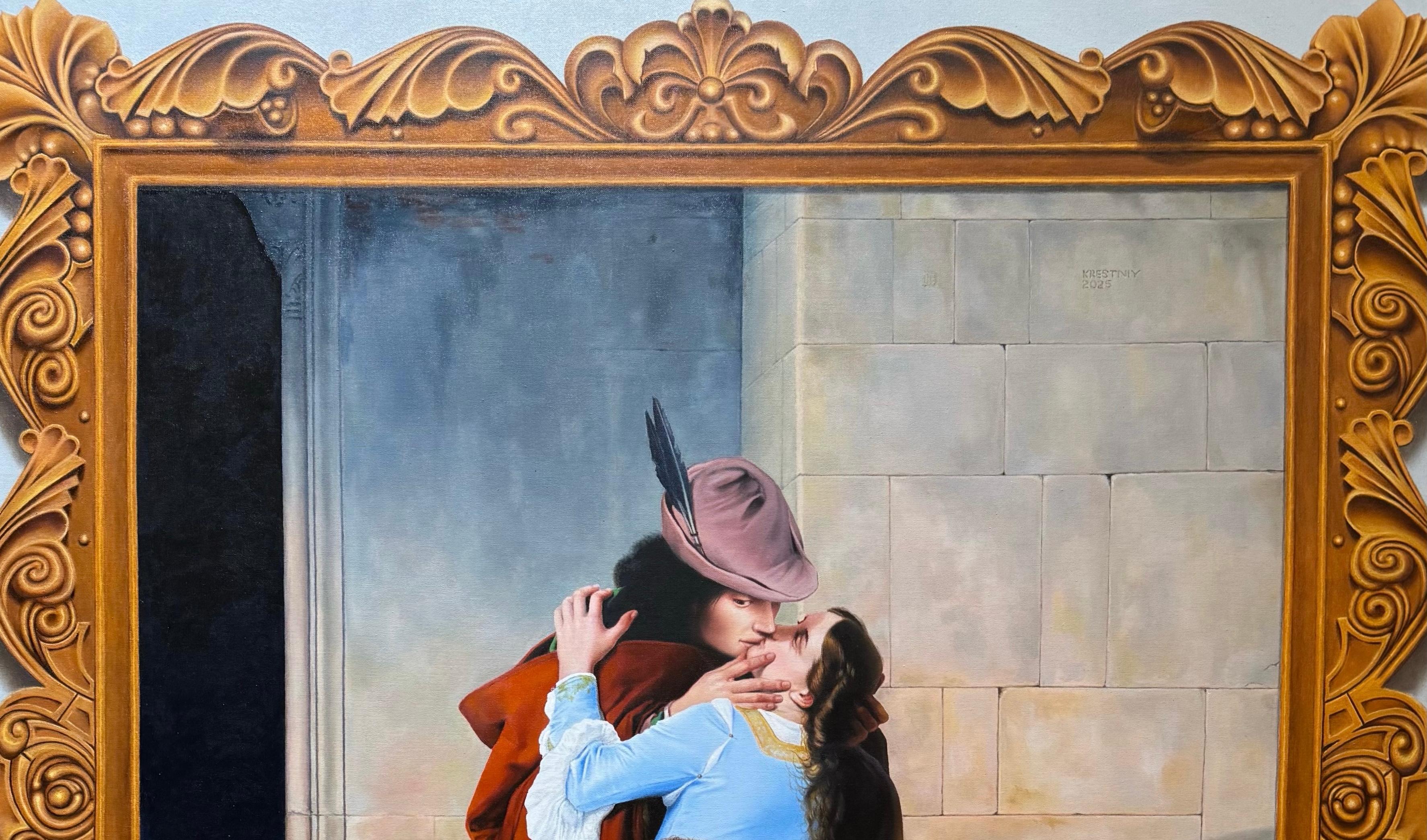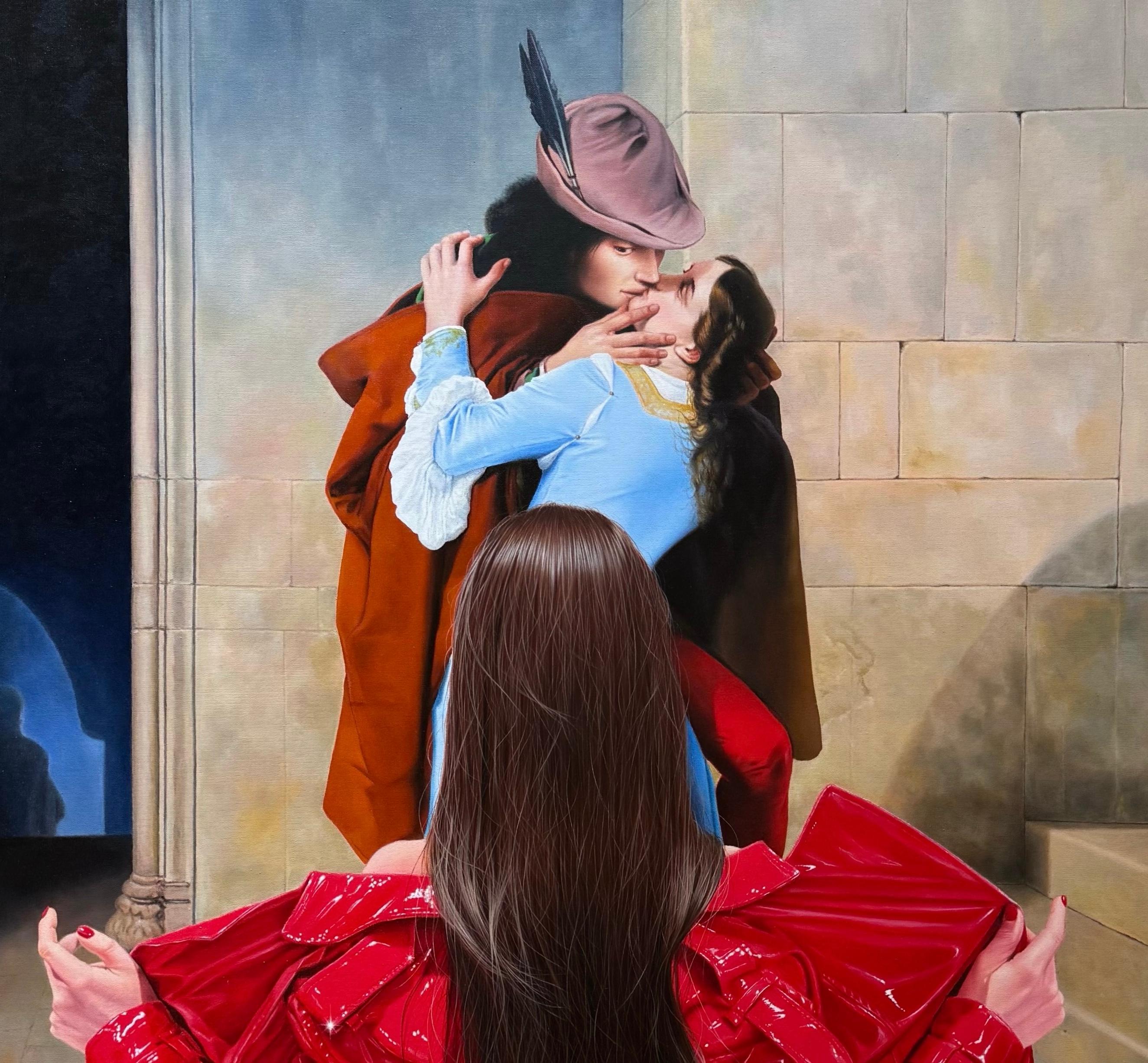 "Prisonnier de l'amour" Peinture à l'huile figurative 47" x 47" pouces par Dmitriy Krestniy