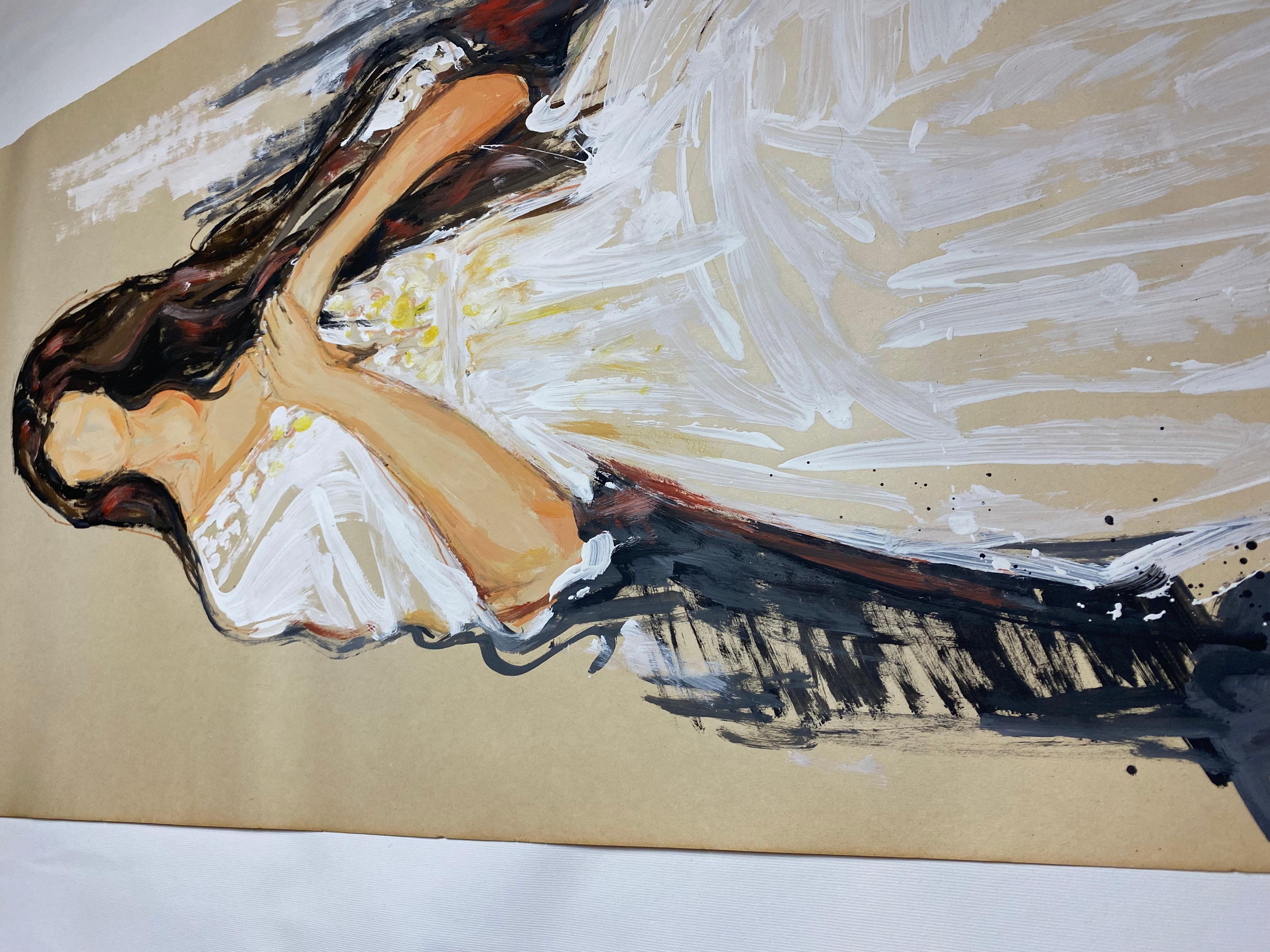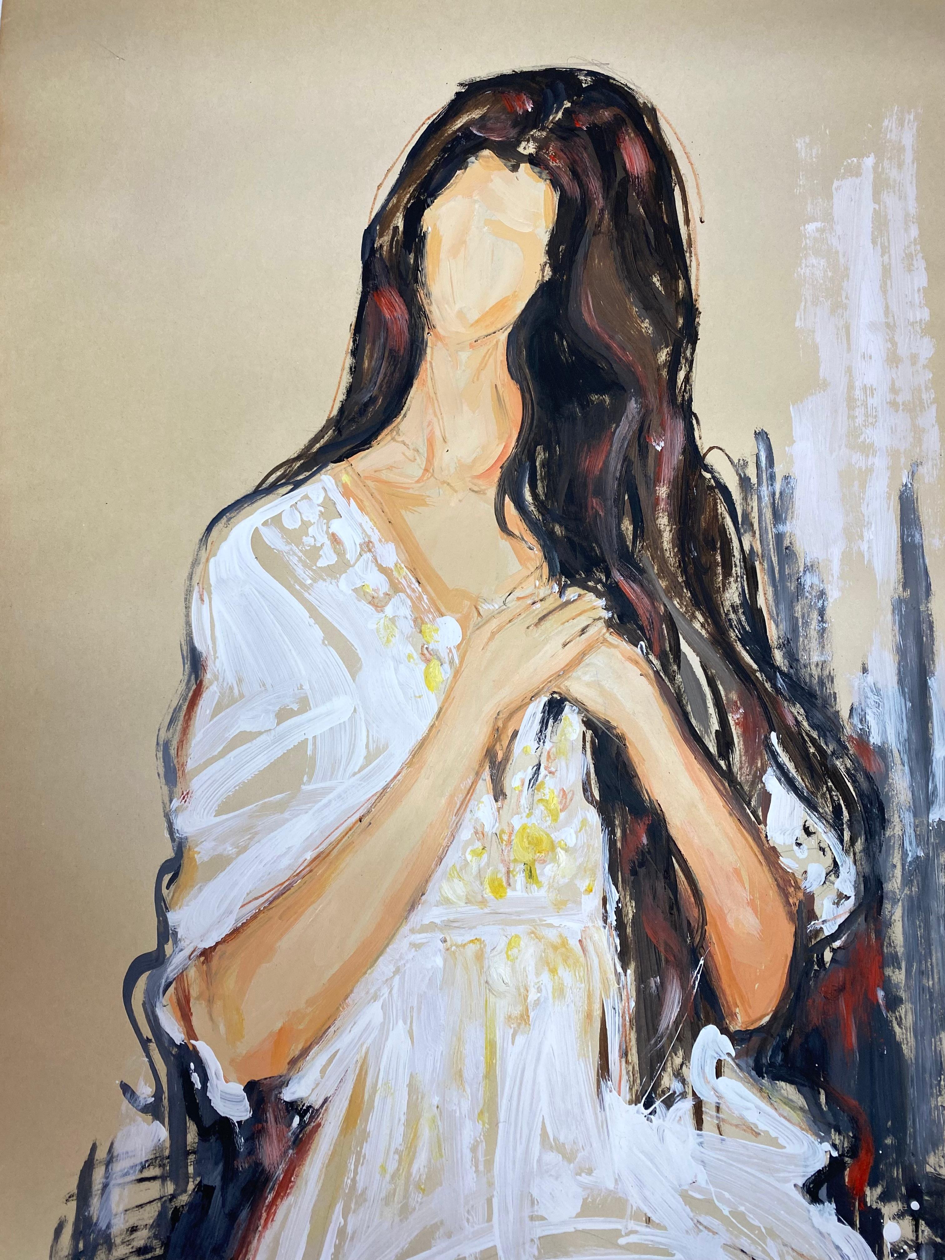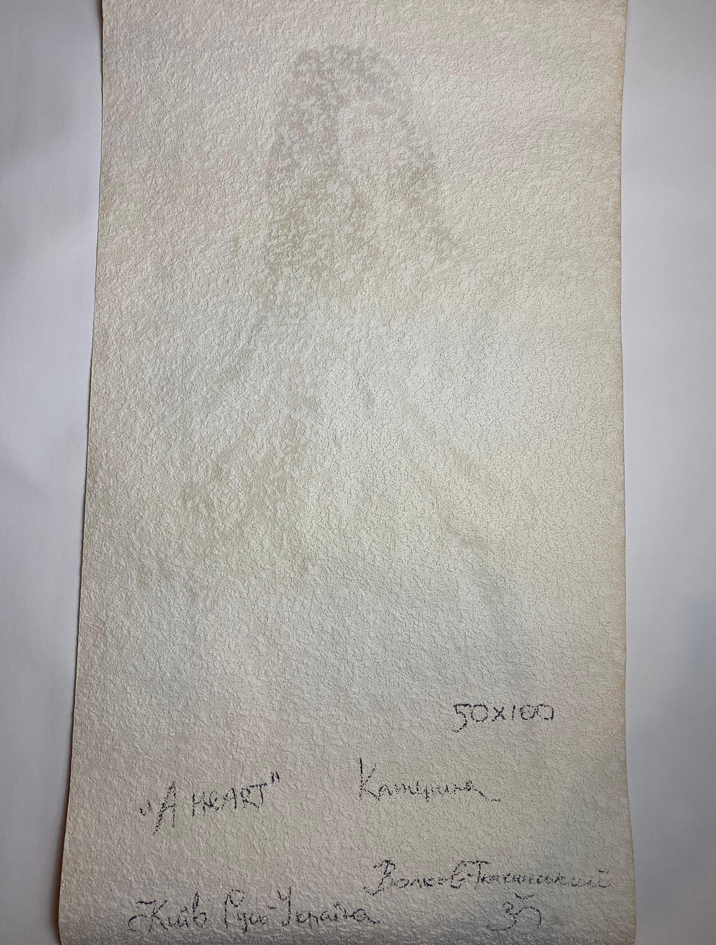 "Kateryna" - une représentation de l'amour capturée dans un geste calme et sincère : une femme en armure blanche porte ses mains près de son cœur. L'œuvre est créée de manière expressive sur du papier jaunâtre, laissant intentionnellement transparaître l'arrière-plan - comme un souvenir ou une lumière intérieure.